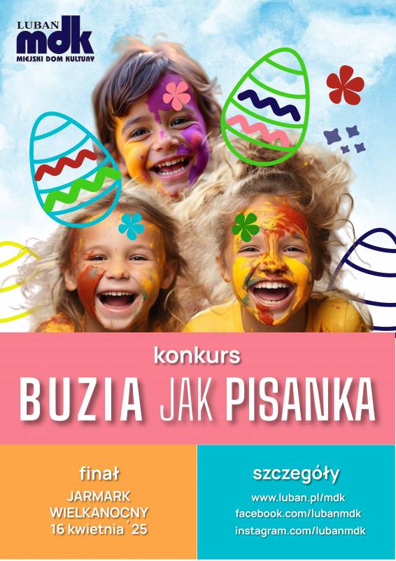 16 kwietnia 2025 roku organizujemy Jarmark Wielkanocny na Rynku w Lubaniu, jedną z atrakcji będzie konkurs dla dzieci "Buzia jak pisanka"