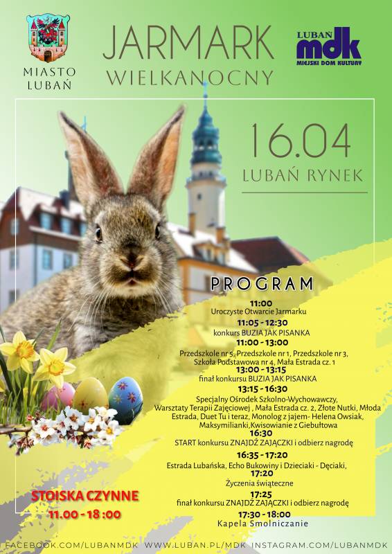 Zapraszamy wszystkich na Jarmark Wielkanocny na Rynek w Lubaniu. Stoiska wystawowe, koncerty, występny, zabawy - od g. 11:00 do 18:00