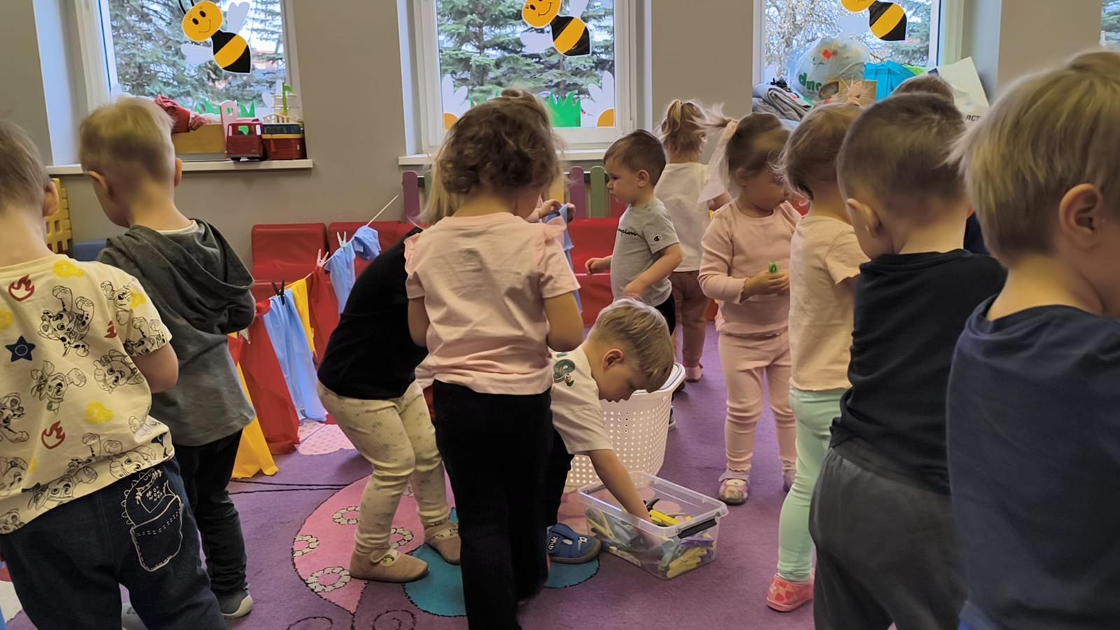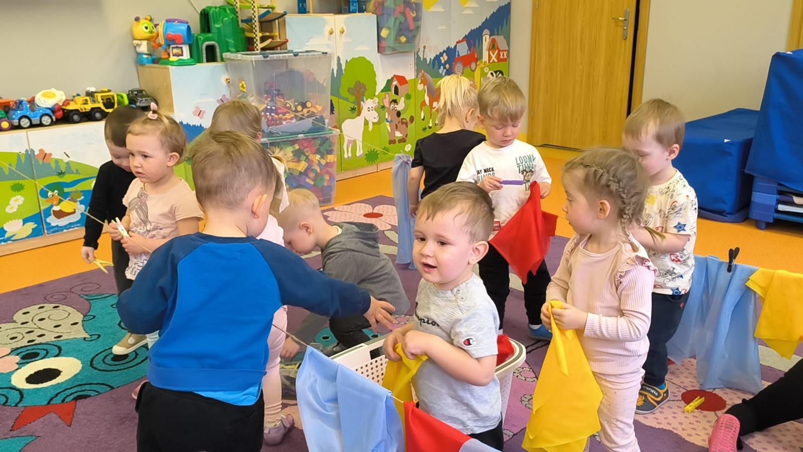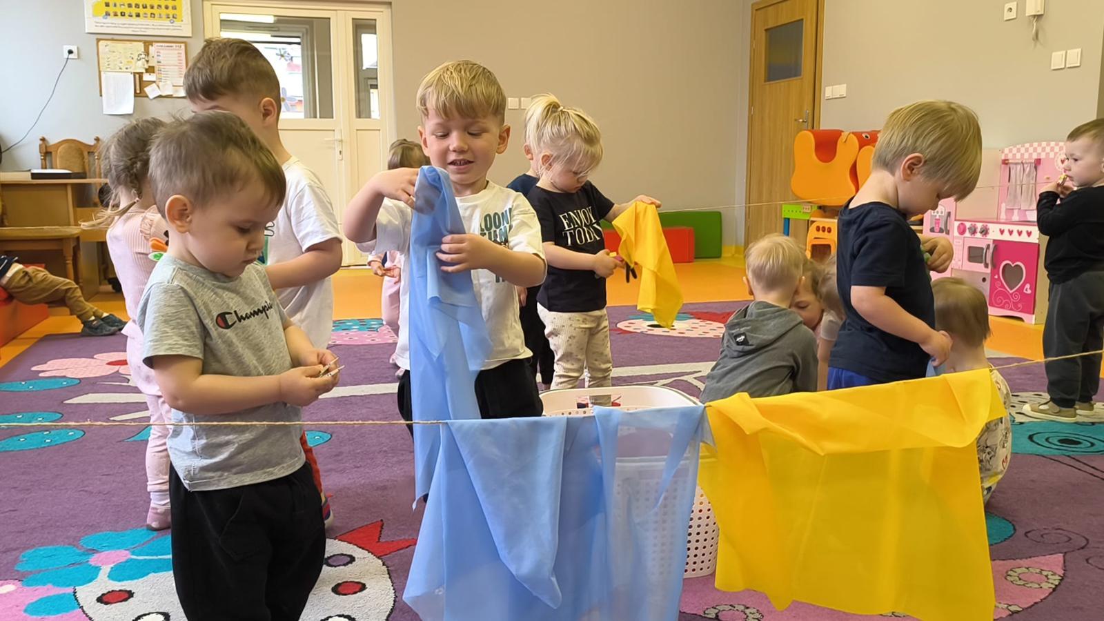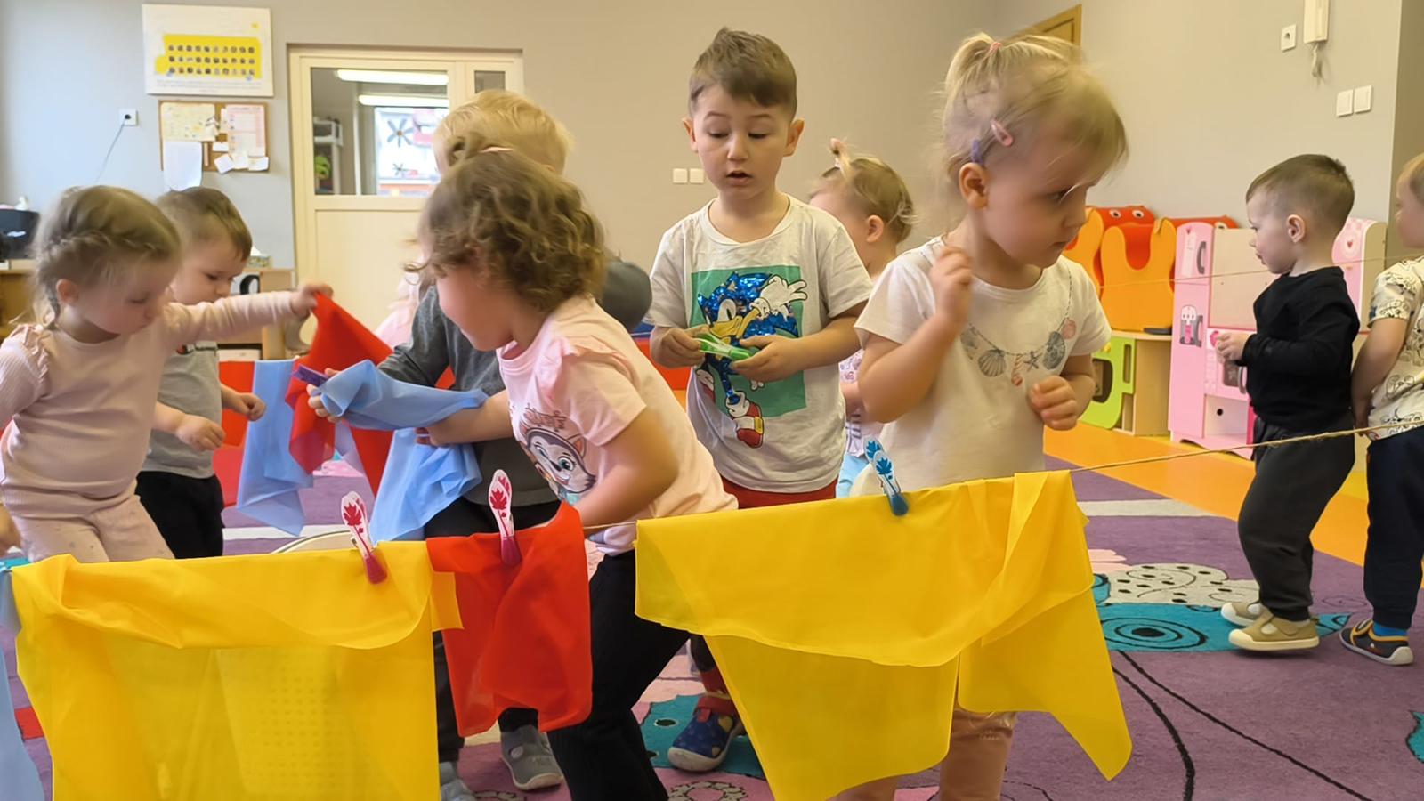 Zabawa muzyczna z interpretacją ruchową piosenki pt. ,, Praczki ‘’. Zabawa z klamerkami to ćwiczenia, które pobudzają wyobraźnię, usprawniają i wzmacniają chwyt pęsetkowy oraz wpływają na koordynację wzrokowo – ruchową.