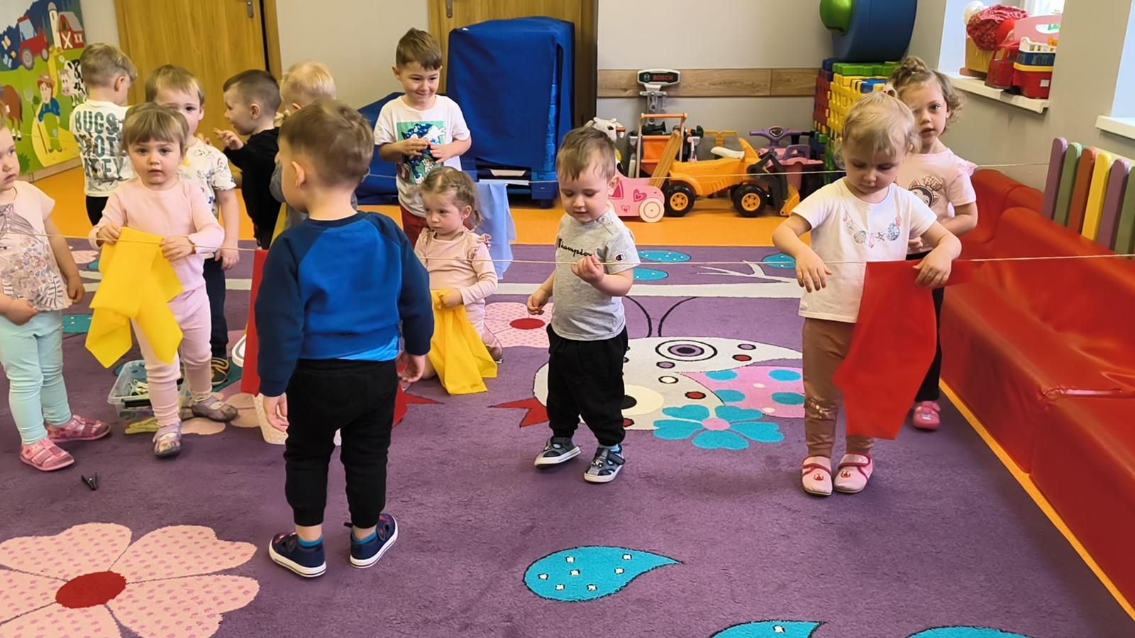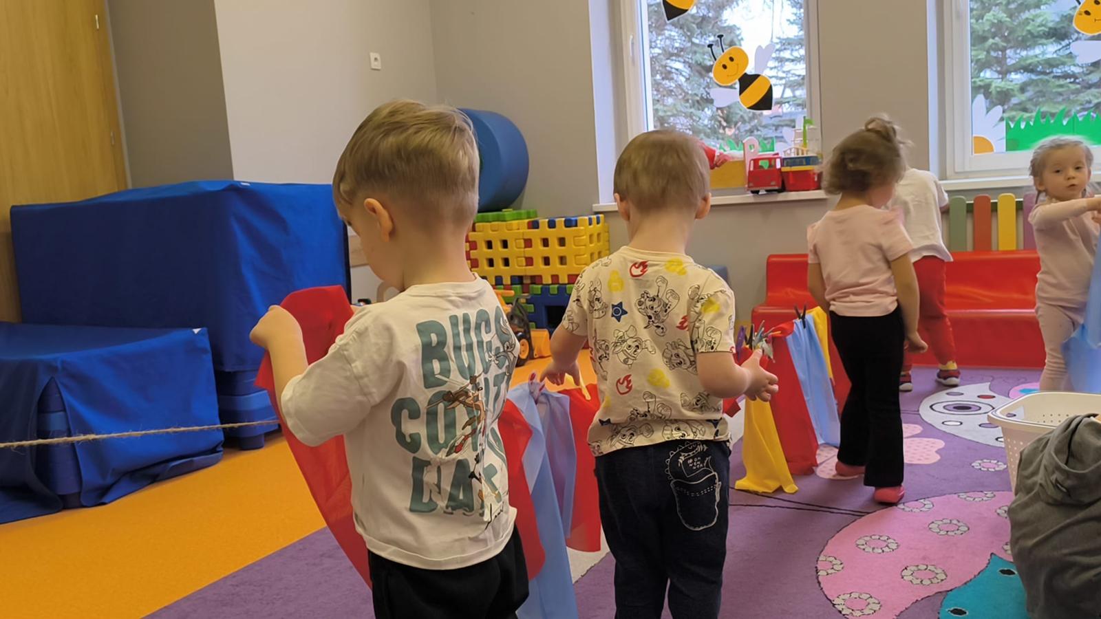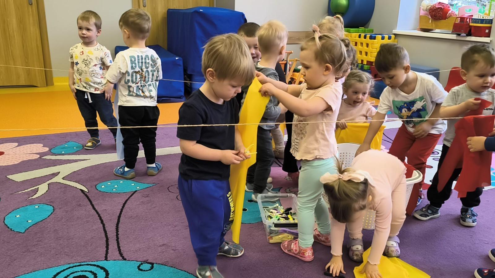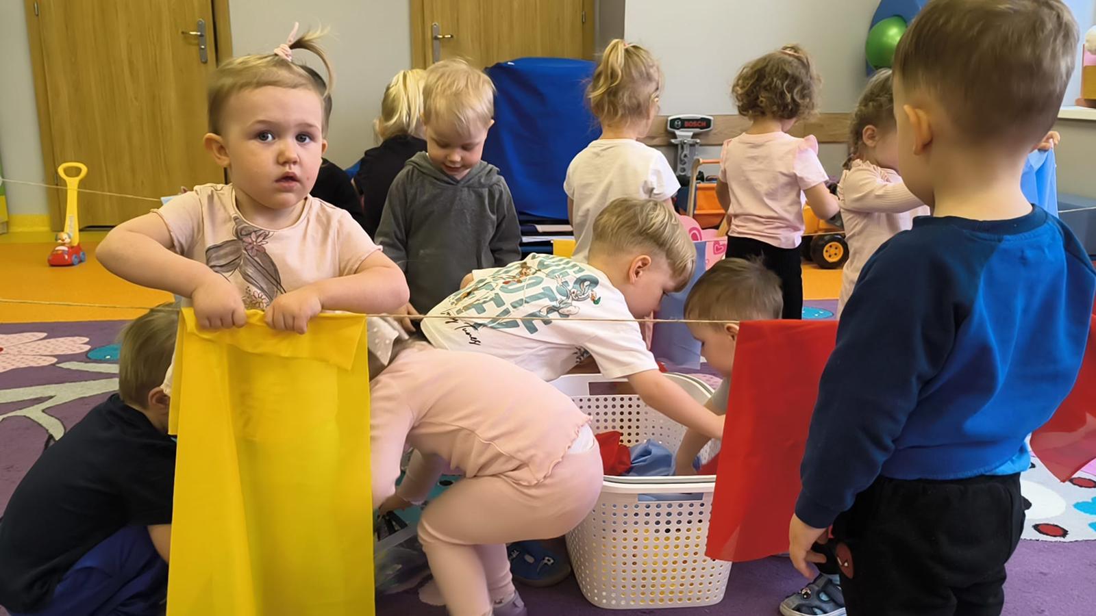 Zabawa muzyczna z interpretacją ruchową piosenki pt. ,, Praczki ‘’. Zabawa z klamerkami to ćwiczenia, które pobudzają wyobraźnię, usprawniają i wzmacniają chwyt pęsetkowy oraz wpływają na koordynację wzrokowo – ruchową.