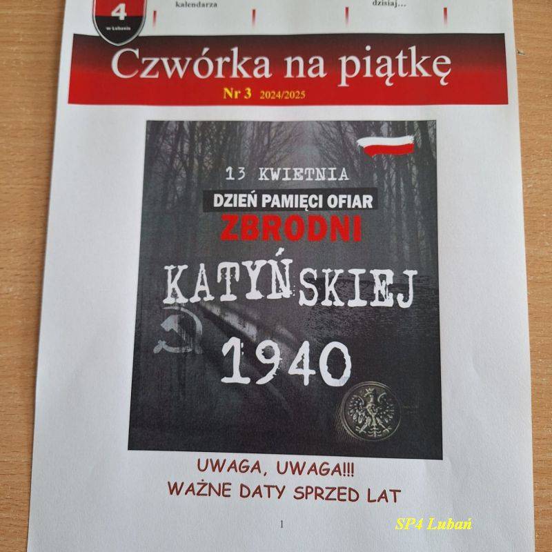 13 kwietnia 1943r., czyli dokładnie 82 lata temu, po raz pierwszy niemieckie radio i prasa powiadomiły o odkryciu masowych grobów polskich oficerów w lesie katyńskim. Dla upamiętnienia tych wydarzeń przygotowaliśmy jubileuszowe wydanie gazetki szkolnej. Dzięki współpracy szkolnych historyków z kołem dziennikarskim, w poniedziałek 14.04.br., tuż przed godziną 8.00, przed wejściami do szkoły, chętni uczniowie z klasy VIII a rozdawali szkolne gazetki zarówno uczniom, jak i naszym nauczycielom. Z kolei w klasach VI-VII na lekcjach historii wzięliśmy udział w wirtualnym spacerze po nekropoliach katyńskich na portalu „Pro Memoria Katyń”. Klasom ósmym został zaprezentowany został film edukacyjny pt. „Tajemnice sprzed lat. Mord w lesie katyńskim”, a w gabinecie historycznym pojawiły się gazetki i tablice informacyjne. Jako szkoła wzięliśmy także udział w kampanii „Pamiętam . Katyń 1940”, organizowanej od 2007r. przez Narodowe Centrum Kultury.