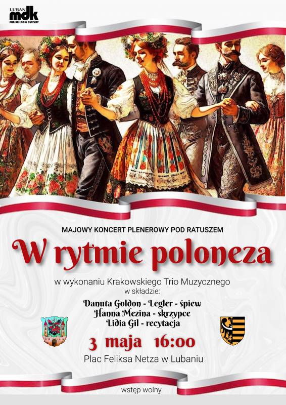 Zapraszamy na majowy koncert plenerowy "W rytmie poloneza" w wykonaniu Krakowskiego Trio Muzycznego w składzie: Danuta Gołdon-Legler (śpiew), Hanna Mezina (skrzypce), Lidia Gil (recytacja).