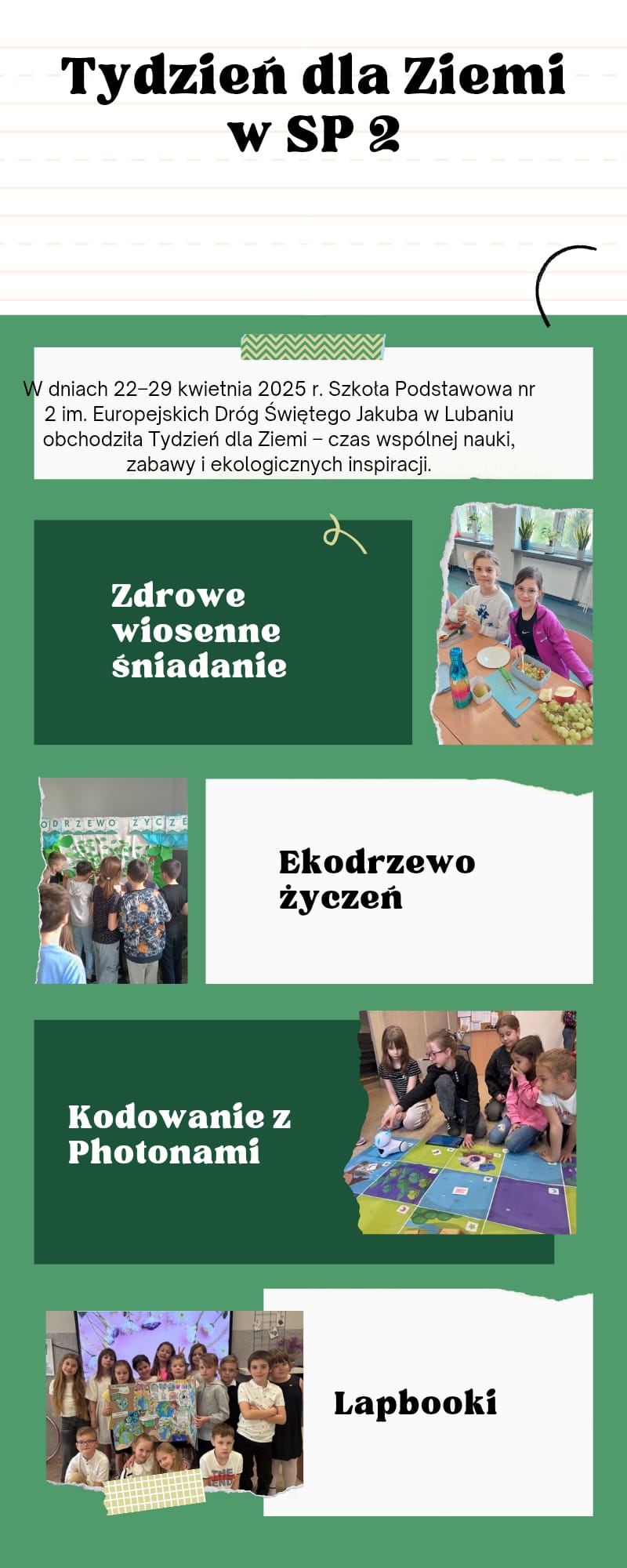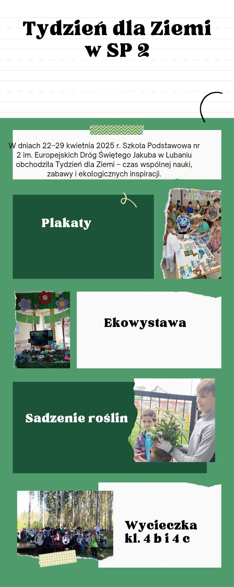 W dniach 22 - 29 kwietnia Szkoła Podstawowa nr 2 im. Europejskich Dróg Świętego Jakuba w Lubaniu aktywnie uczestniczyła w obchodach Tygodnia dla Ziemi, organizując szereg działań o charakterze edukacyjnym, ekologicznym i integracyjnym.