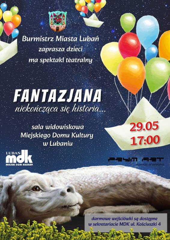 Burmistrz Lubania Grzegorz Wieczorek zaprasza dzieci na "FANTAZJANA niekończąca się historia..." - spektakl teatralny dla dzieci w wykonaniu Agencji Artystycznej PRYM ART.