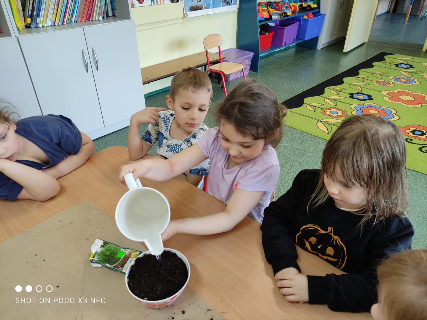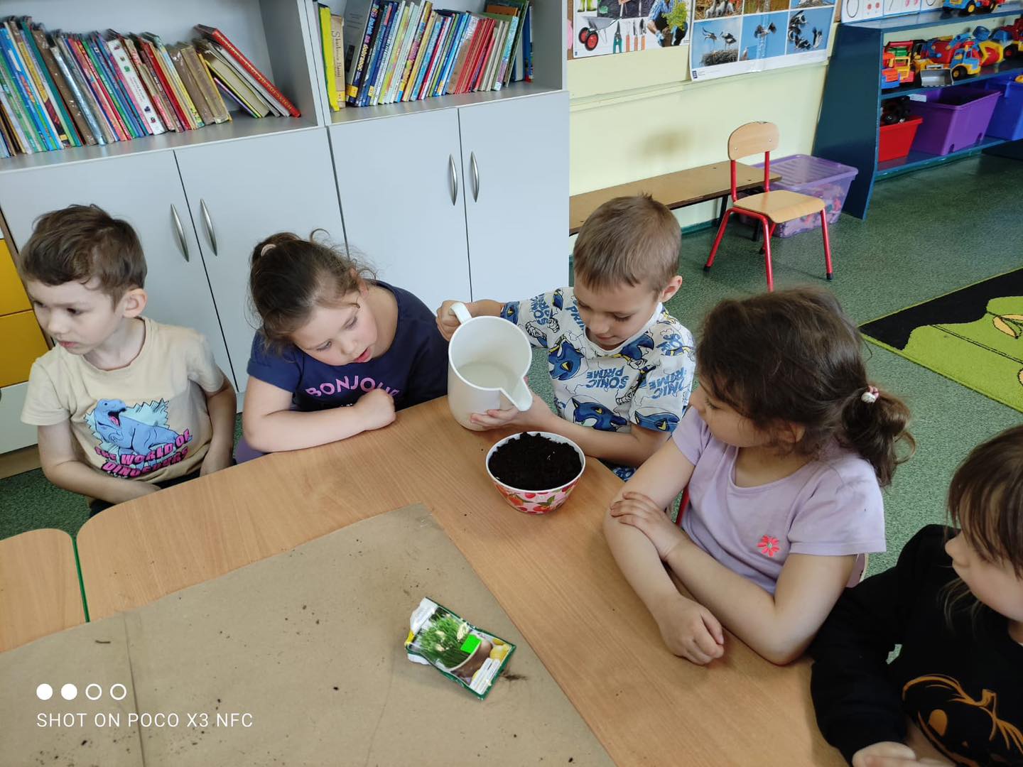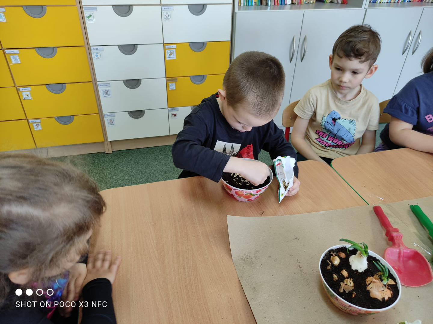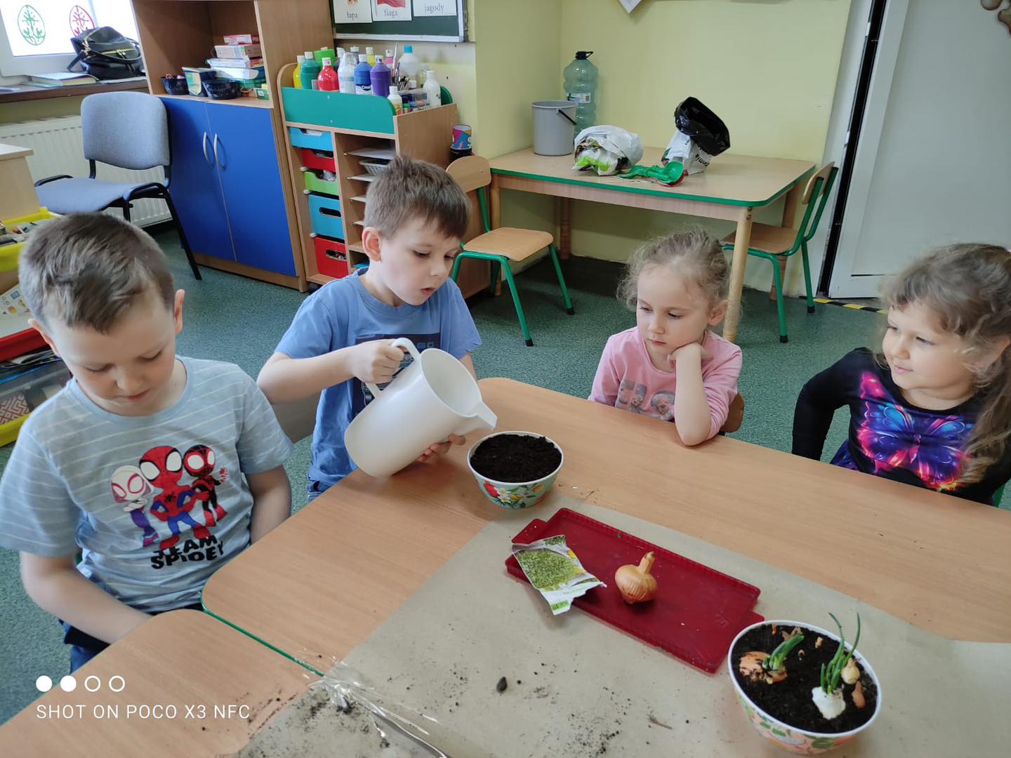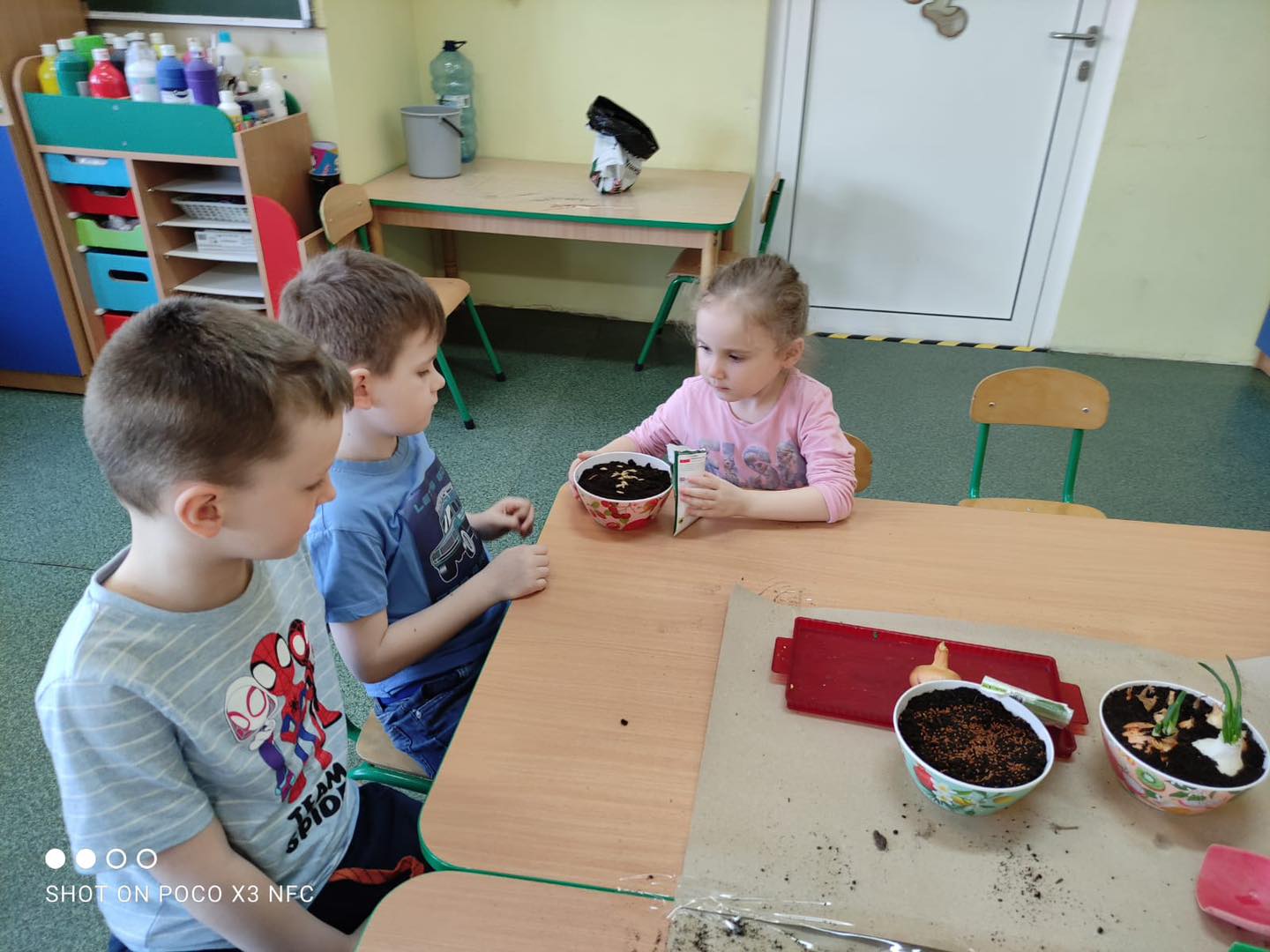 Z początkiem wiosny, dzieci 5- letnie włączyły się do utworzenia kącika zieleni w sali. To doskonałe miejsce do prowadzenia obserwacji wzrostu roślin. Teraz pozostała codzienna ich pielęgnacja.