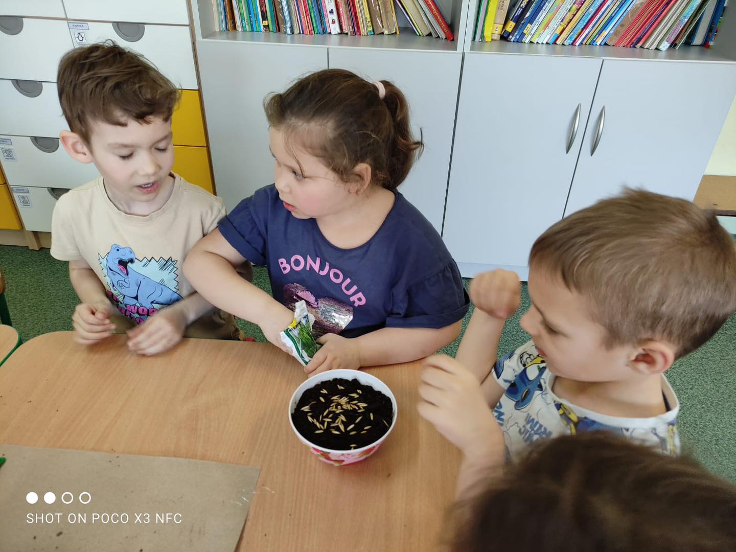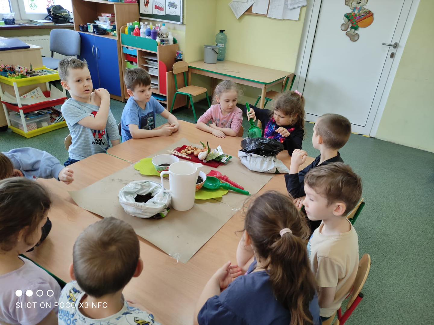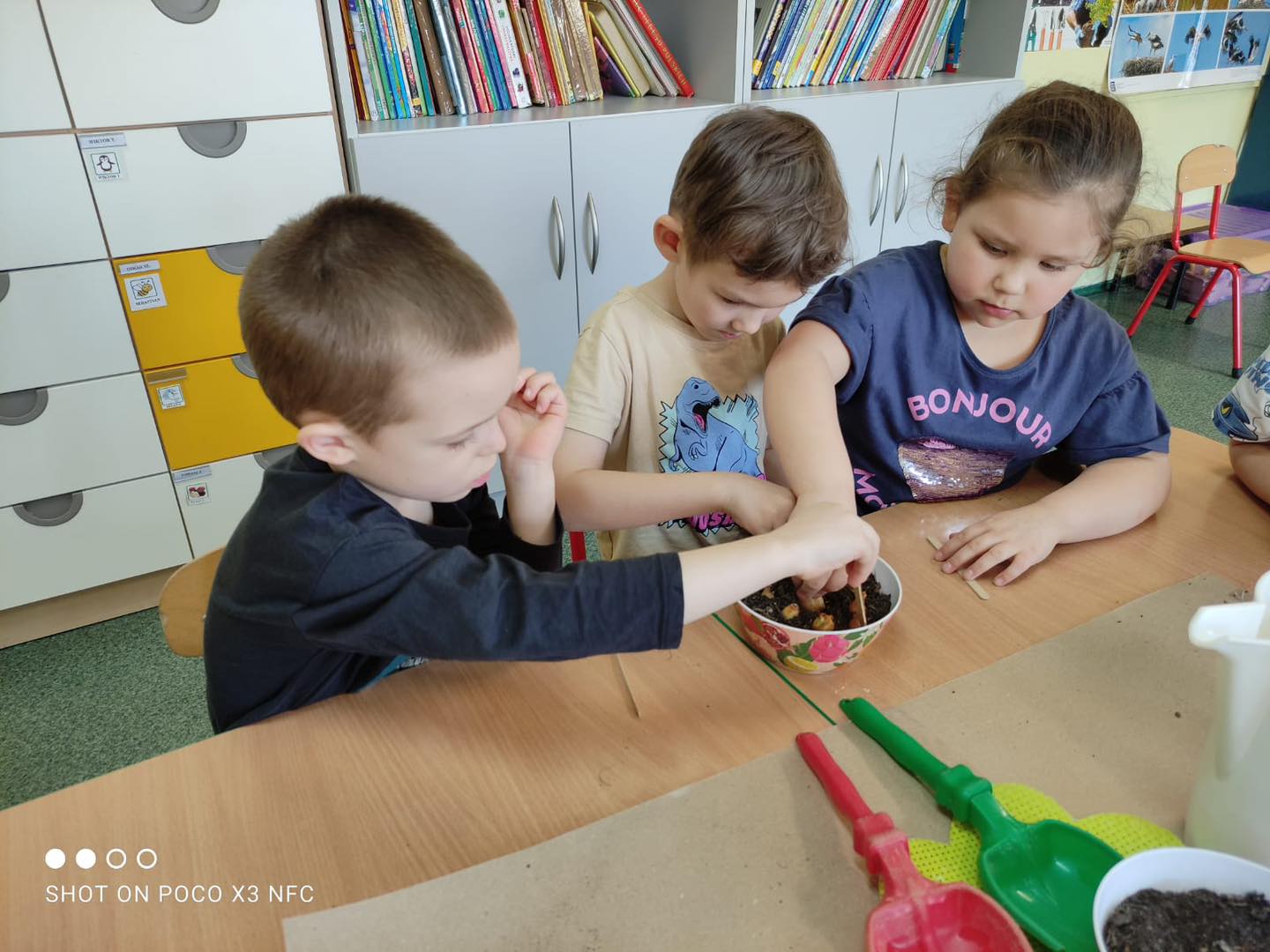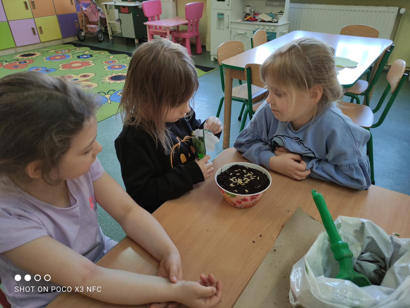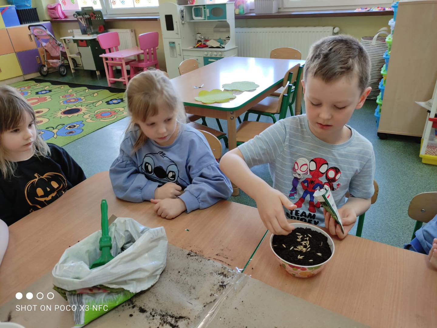 Z początkiem wiosny, dzieci 5- letnie włączyły się do utworzenia kącika zieleni w sali. To doskonałe miejsce do prowadzenia obserwacji wzrostu roślin. Teraz pozostała codzienna ich pielęgnacja.
