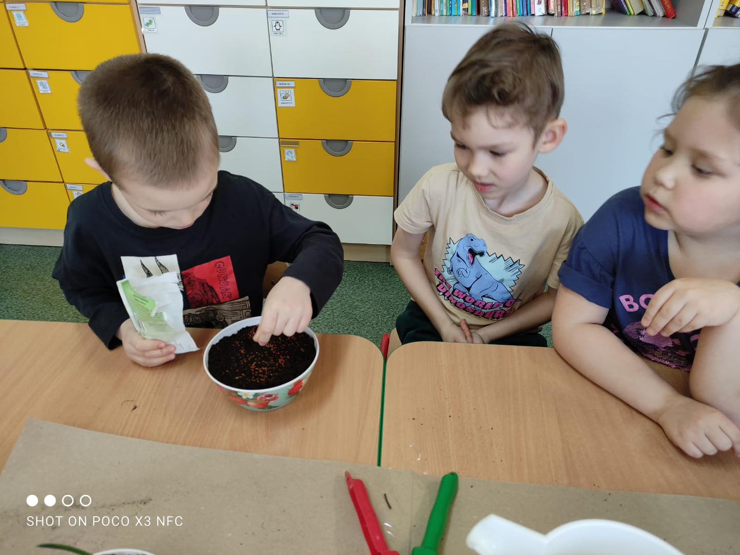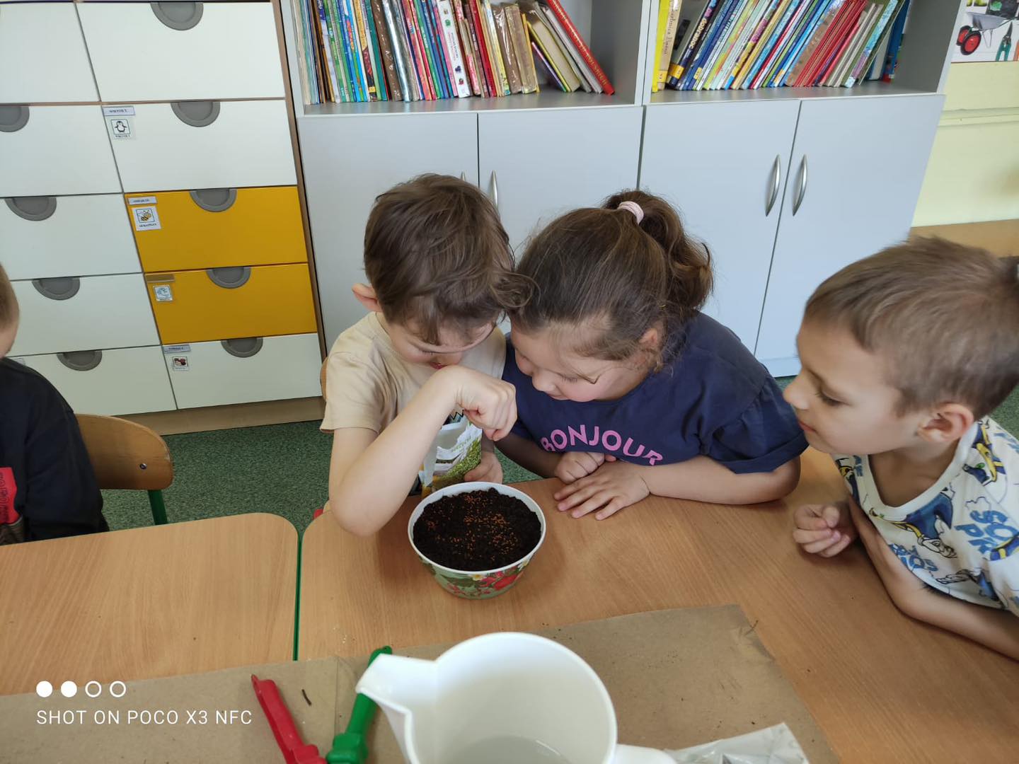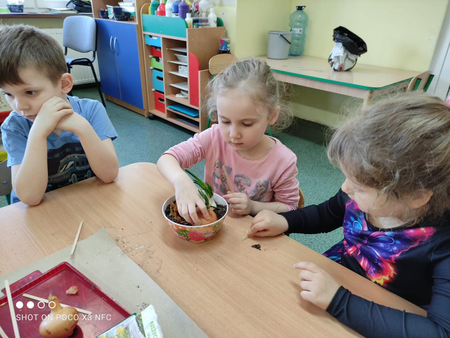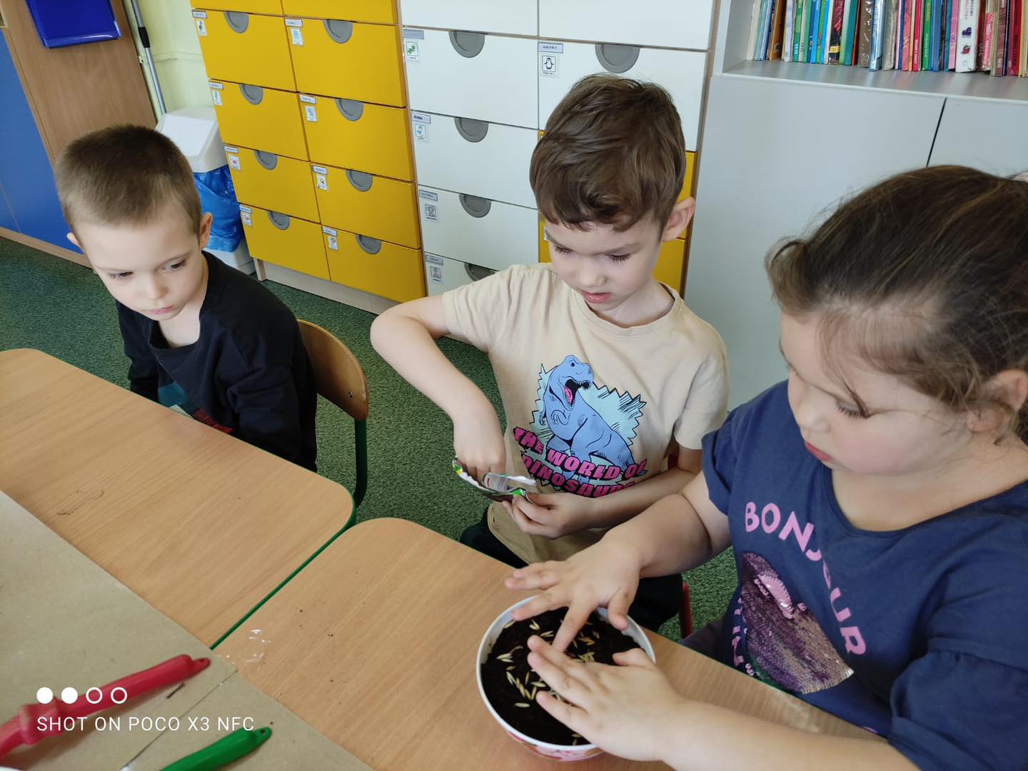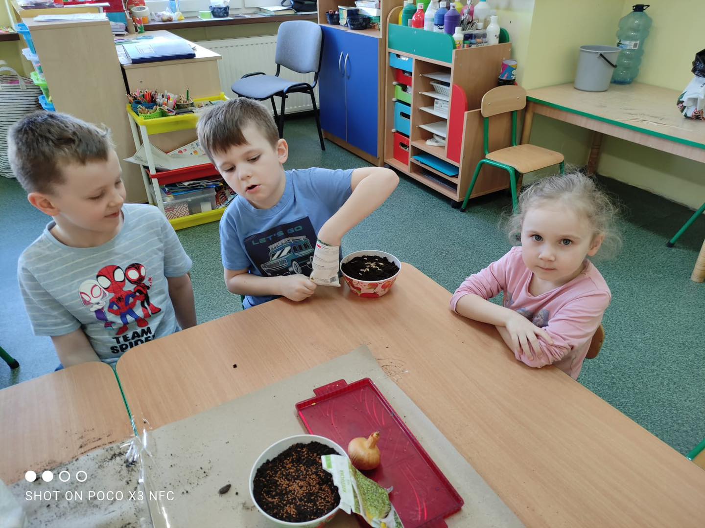Z początkiem wiosny, dzieci 5- letnie włączyły się do utworzenia kącika zieleni w sali. To doskonałe miejsce do prowadzenia obserwacji wzrostu roślin. Teraz pozostała codzienna ich pielęgnacja.
