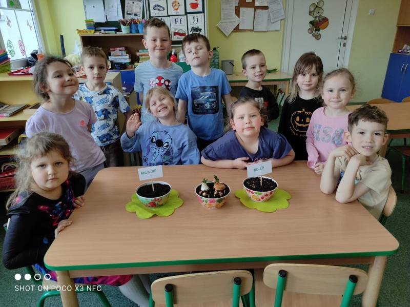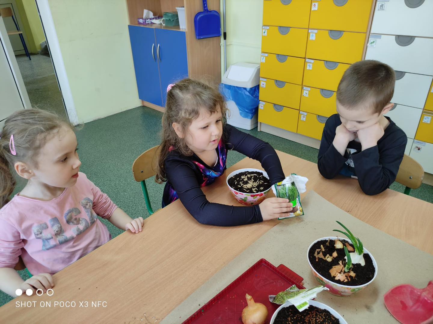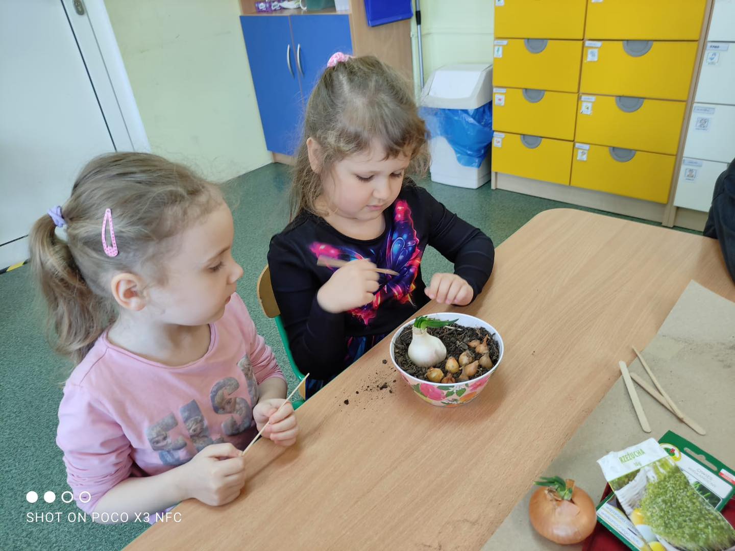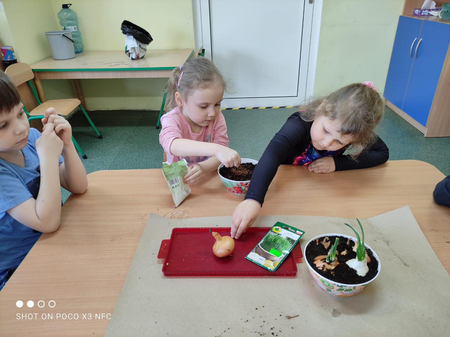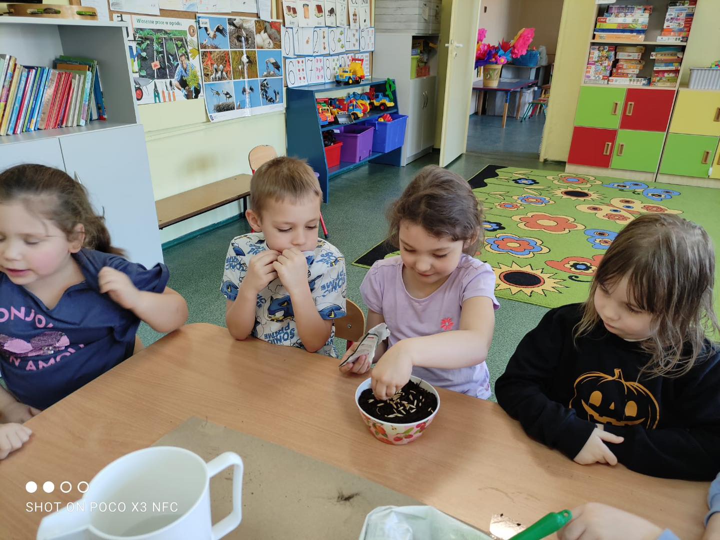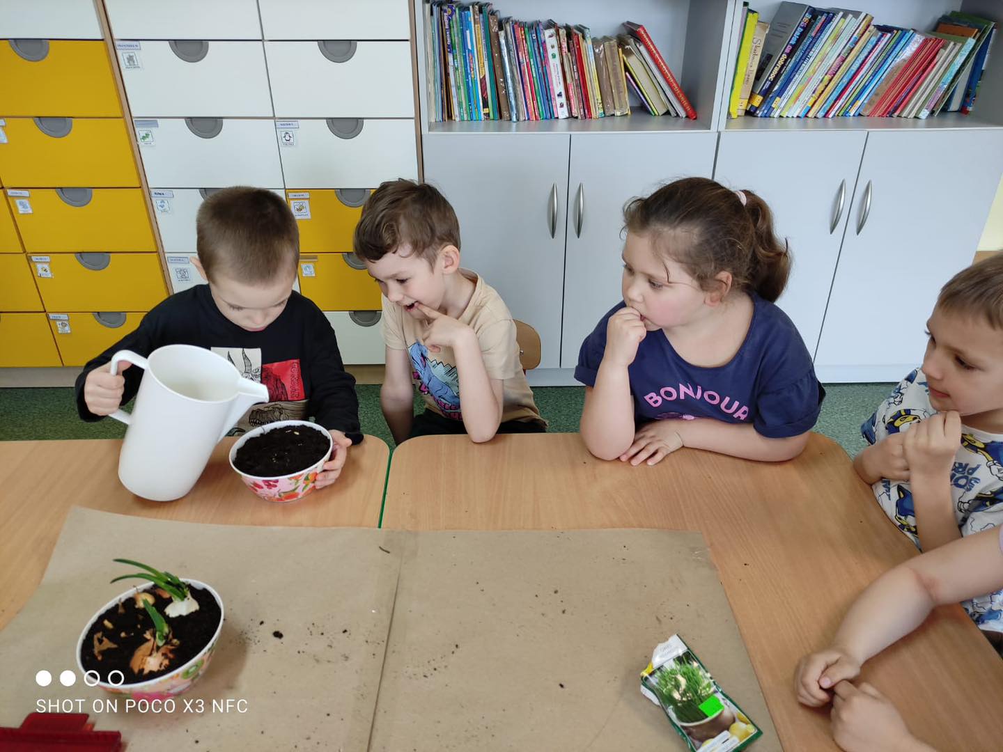 Z początkiem wiosny, dzieci 5- letnie włączyły się do utworzenia kącika zieleni w sali. To doskonałe miejsce do prowadzenia obserwacji wzrostu roślin. Teraz pozostała codzienna ich pielęgnacja.