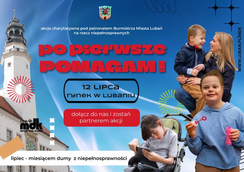 Lipiec to miesiąc dumy z niepełnosprawności, z tego powodu Miejski Dom Kultury 12 lipca na Rynku w Lubaniu zorganizuje akcję charytatywną pod patronatem Burmistrza Miasta Lubań na rzecz osób niepełnosprawnych "Po pierwsze pomagam!". Szukamy partnerów, którzy włączą się do wspólnego pomagania.