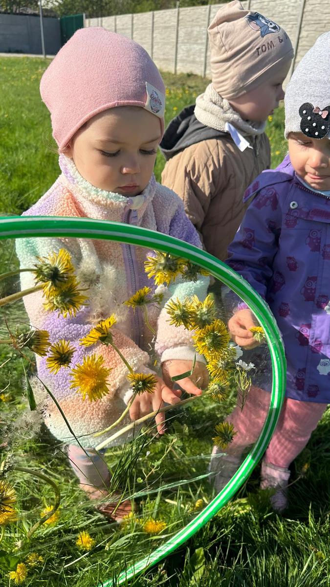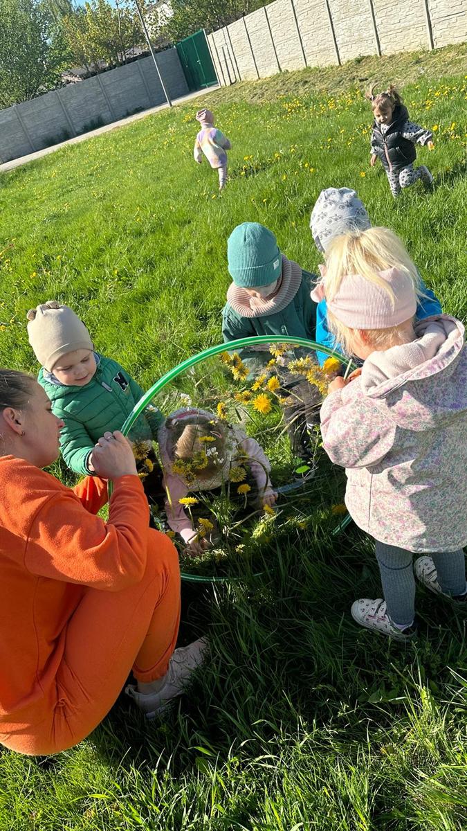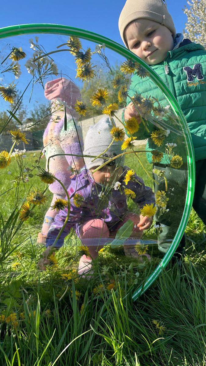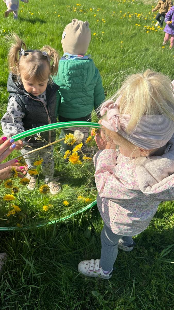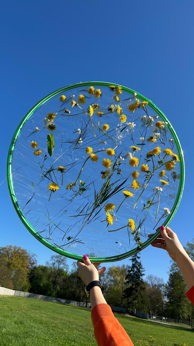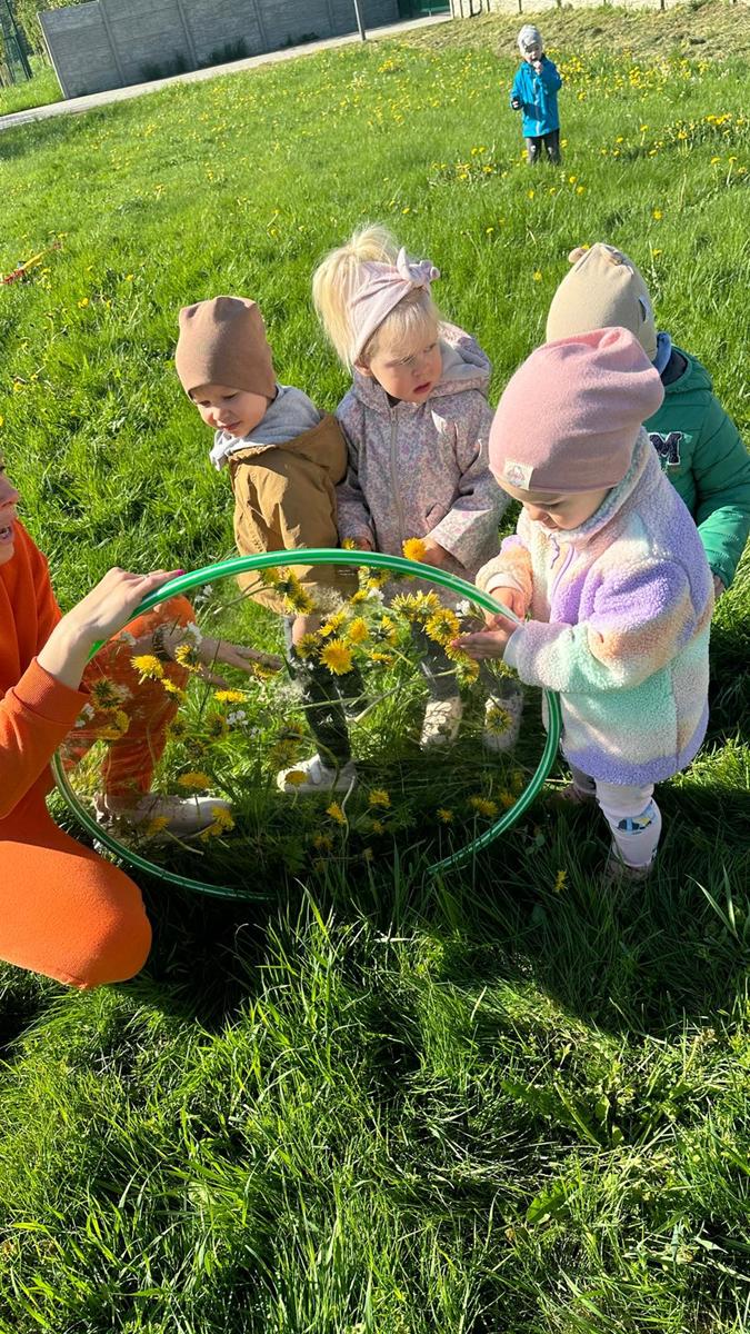 Hula hop nie służy tylko do kręcenia, ale również do zrobienia wiosennego witrażu. Dzieci na dworze zbierały kwiatki, liście oraz gałązki i przyklejały na przezroczystą taśmę , która była przyklejona na hula hop. Dzieci uczyły się współpracy, skupienia i kreatywności. Wiosenny witraż wyszedł piękny.