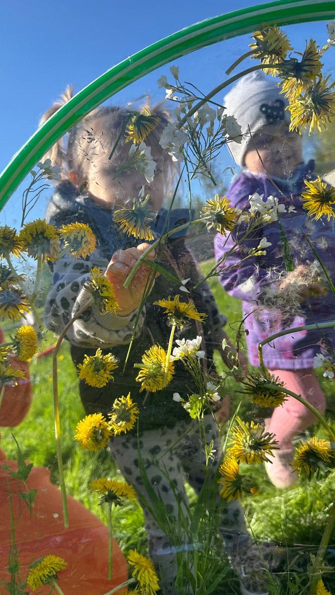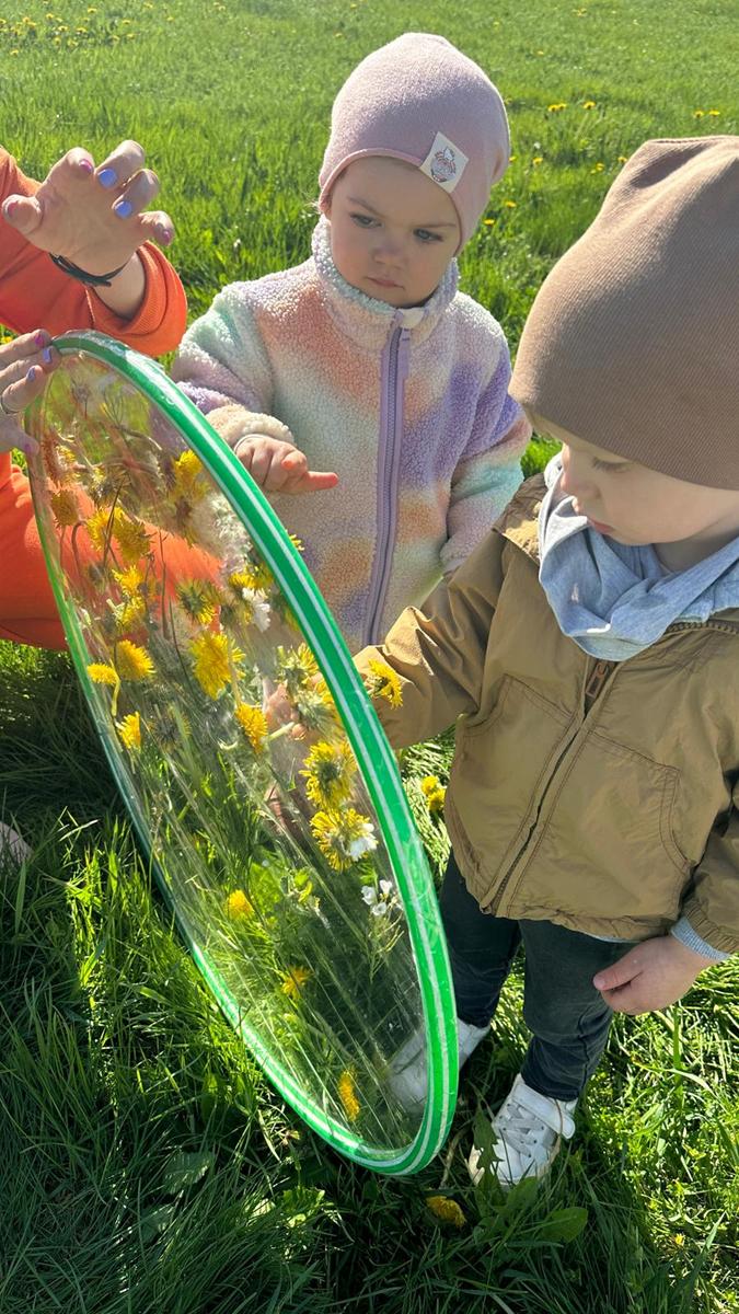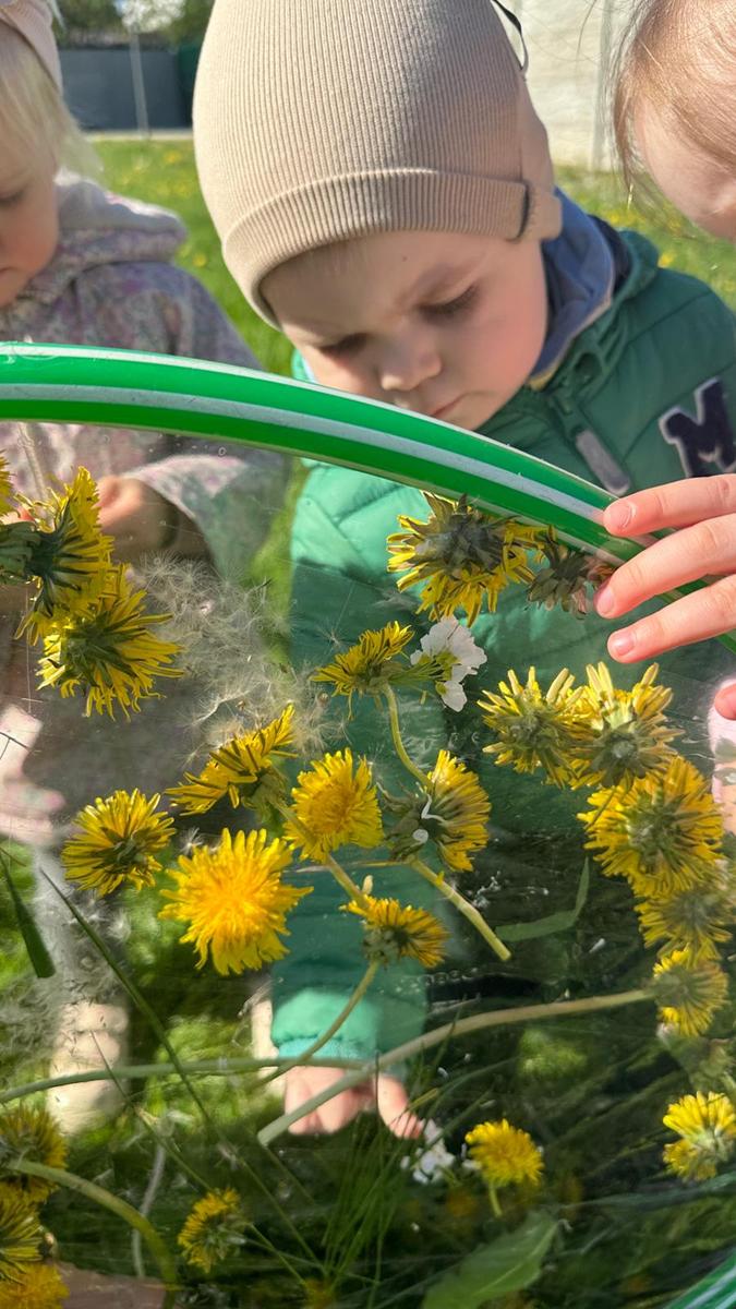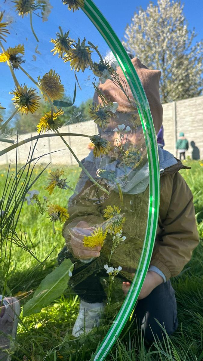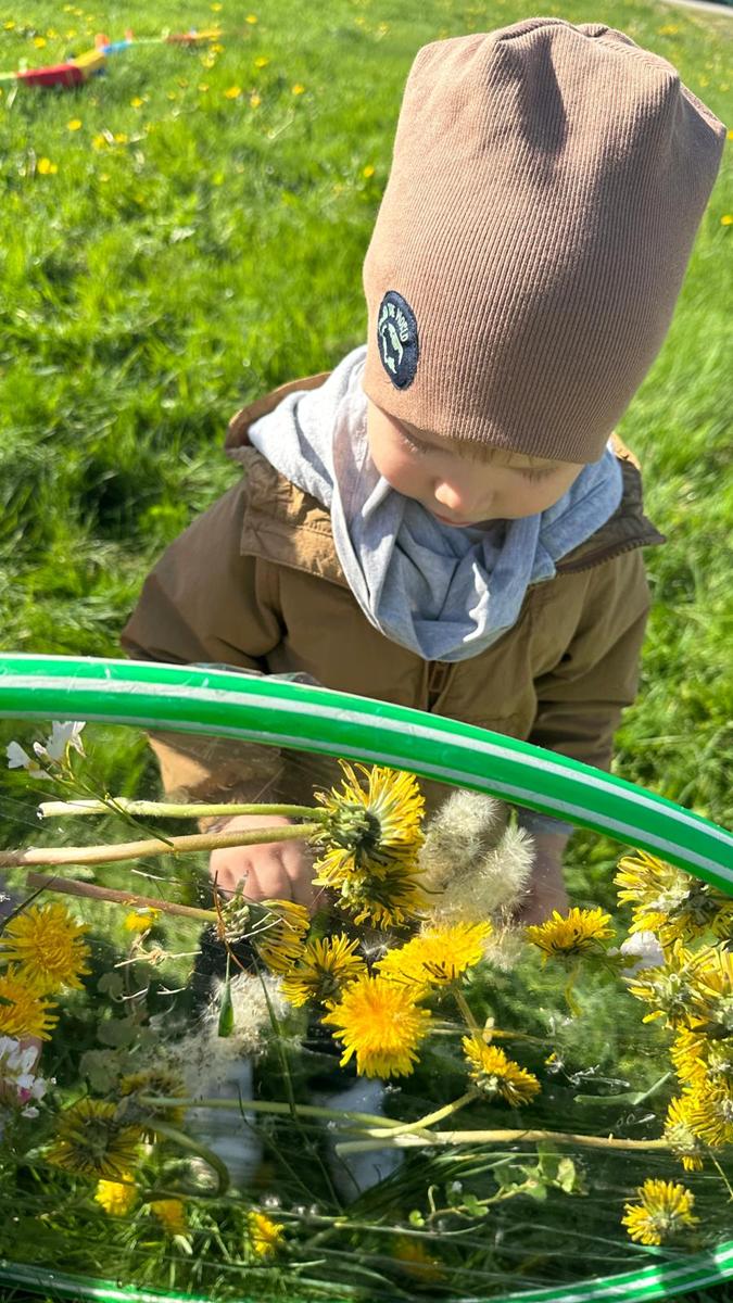 Hula hop nie służy tylko do kręcenia, ale również do zrobienia wiosennego witrażu. Dzieci na dworze zbierały kwiatki, liście oraz gałązki i przyklejały na przezroczystą taśmę , która była przyklejona na hula hop. Dzieci uczyły się współpracy, skupienia i kreatywności. Wiosenny witraż wyszedł piękny.