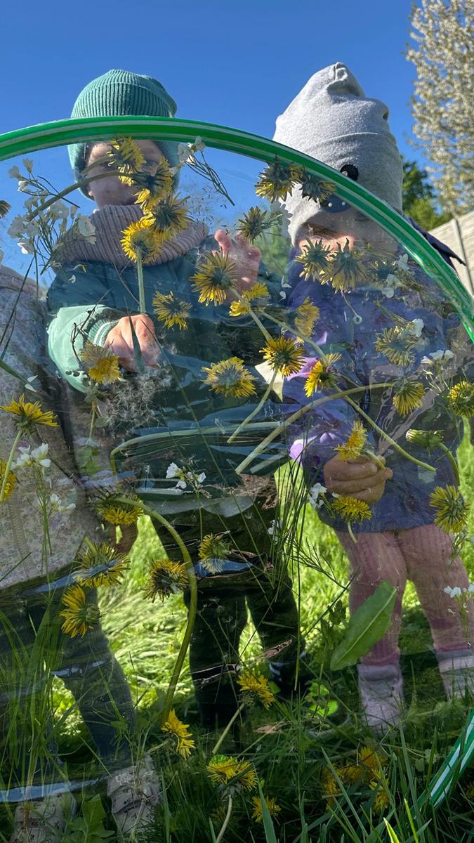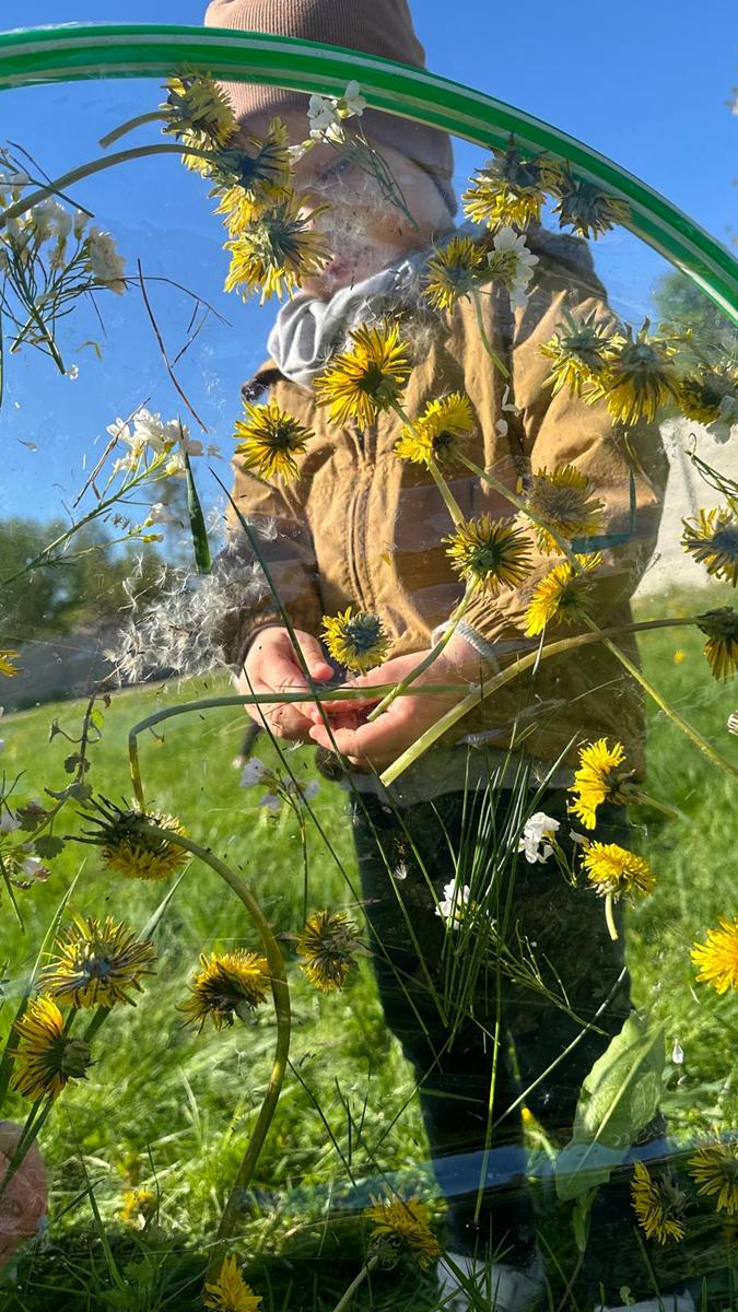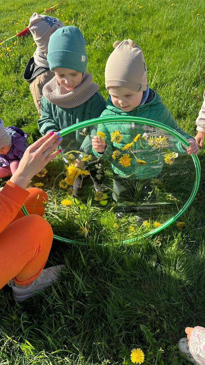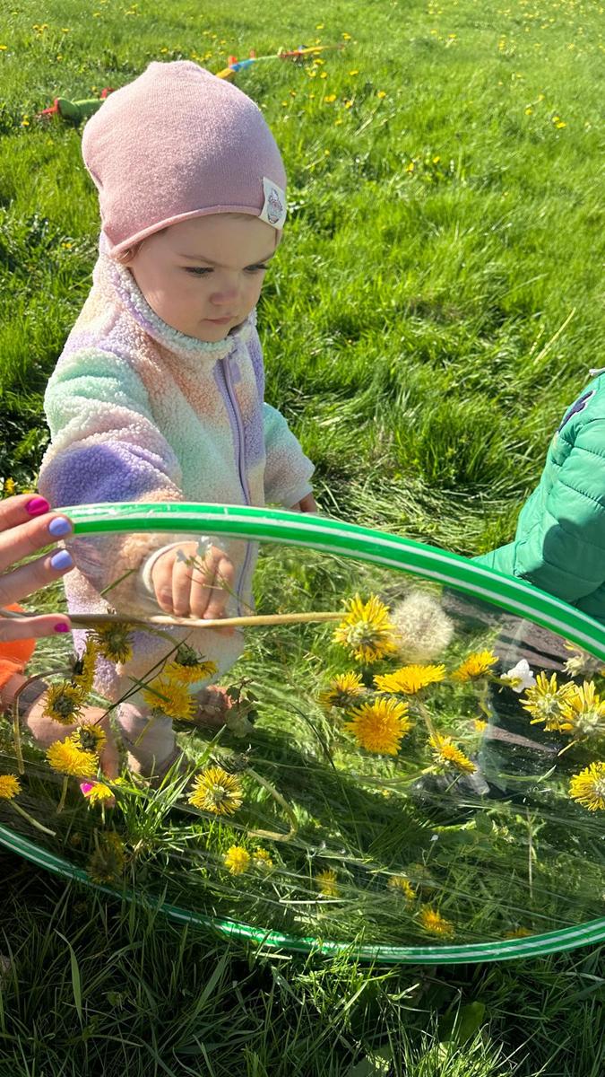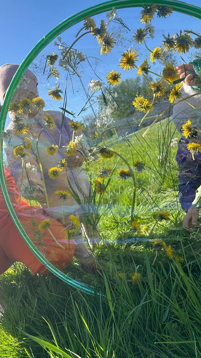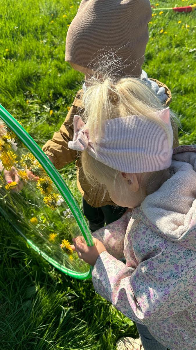 Hula hop nie służy tylko do kręcenia, ale również do zrobienia wiosennego witrażu. Dzieci na dworze zbierały kwiatki, liście oraz gałązki i przyklejały na przezroczystą taśmę , która była przyklejona na hula hop. Dzieci uczyły się współpracy, skupienia i kreatywności. Wiosenny witraż wyszedł piękny.