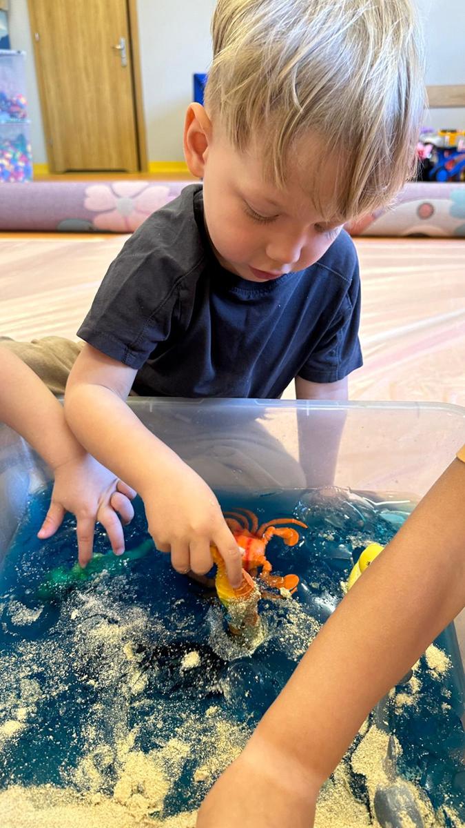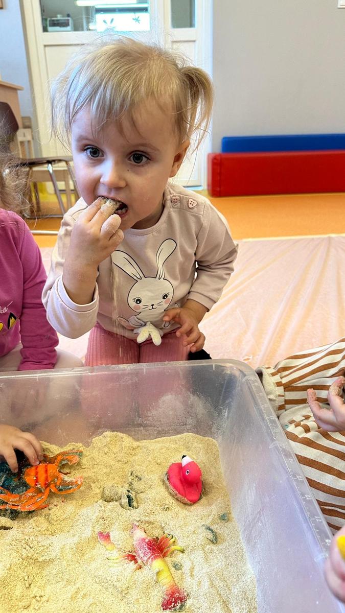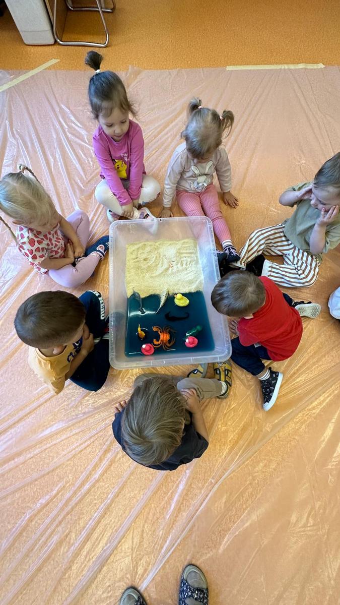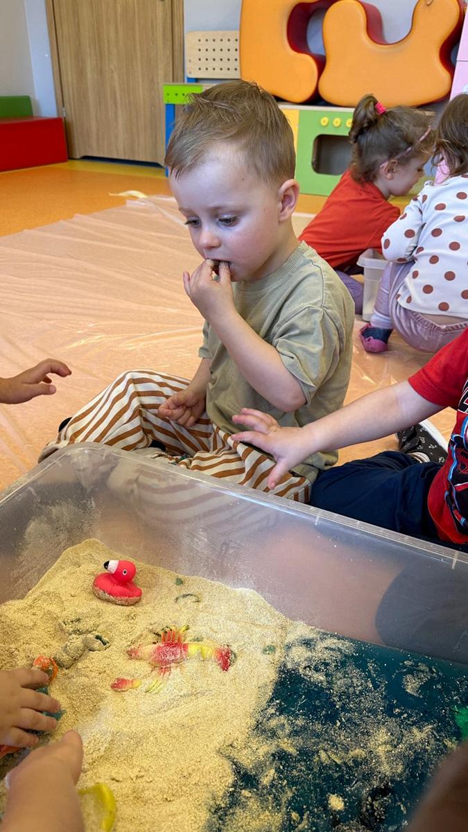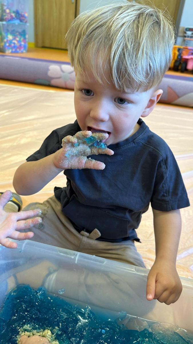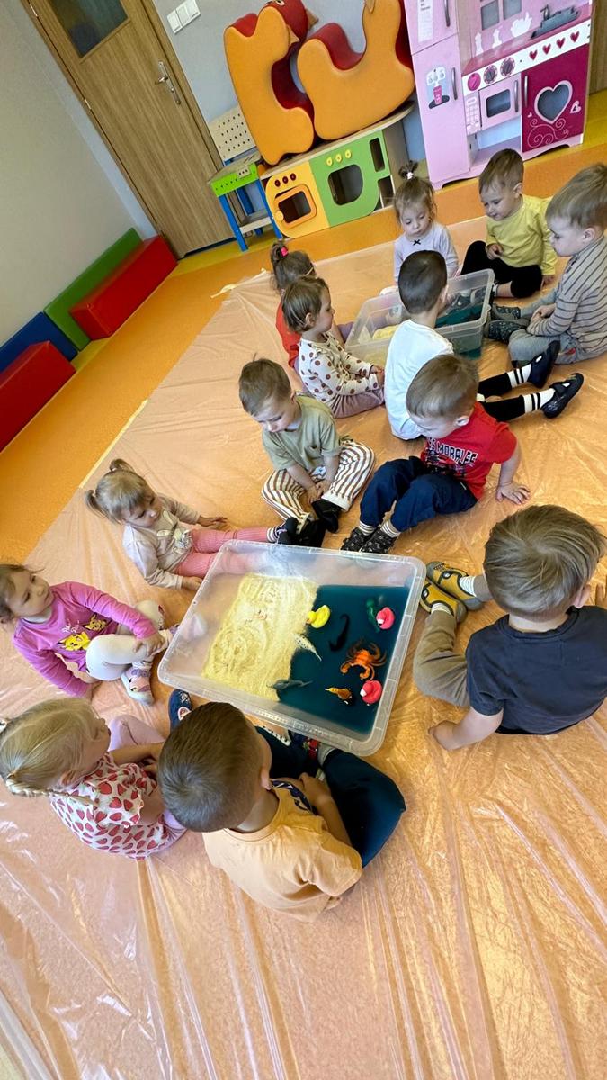 Zabawy sensoryczne pozwalają poznawać świat zmysłami. Morze z galaretki, piasek z płatków śniadaniowych. Zajęcia sprawiły wiele radości dzieciom, mogły ugniatać, mieszać i przede wszystkim próbować. Było pysznie.