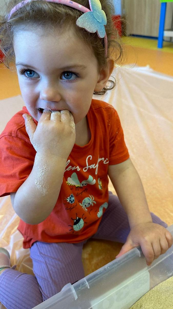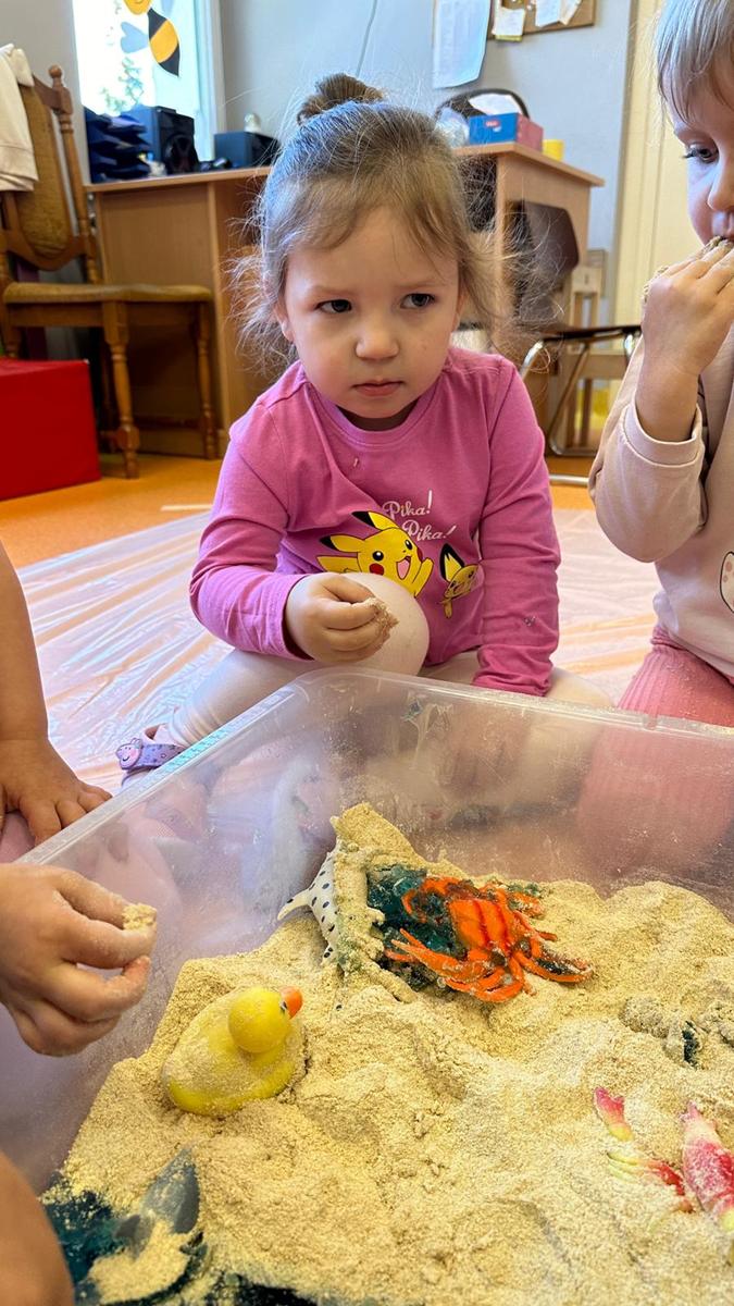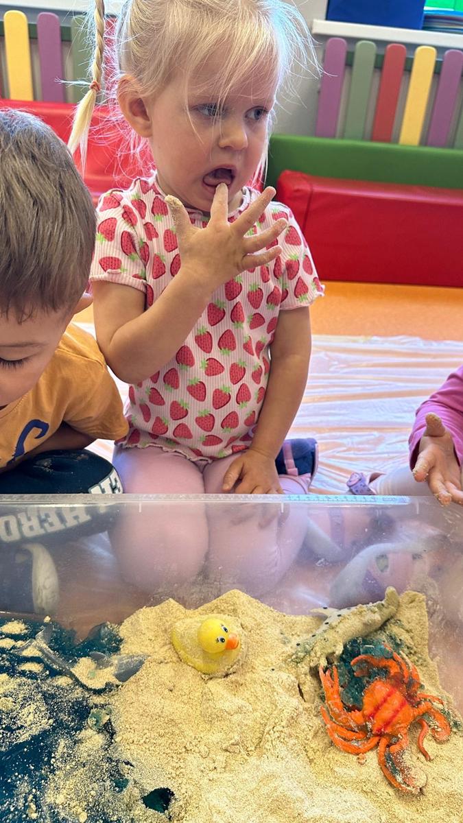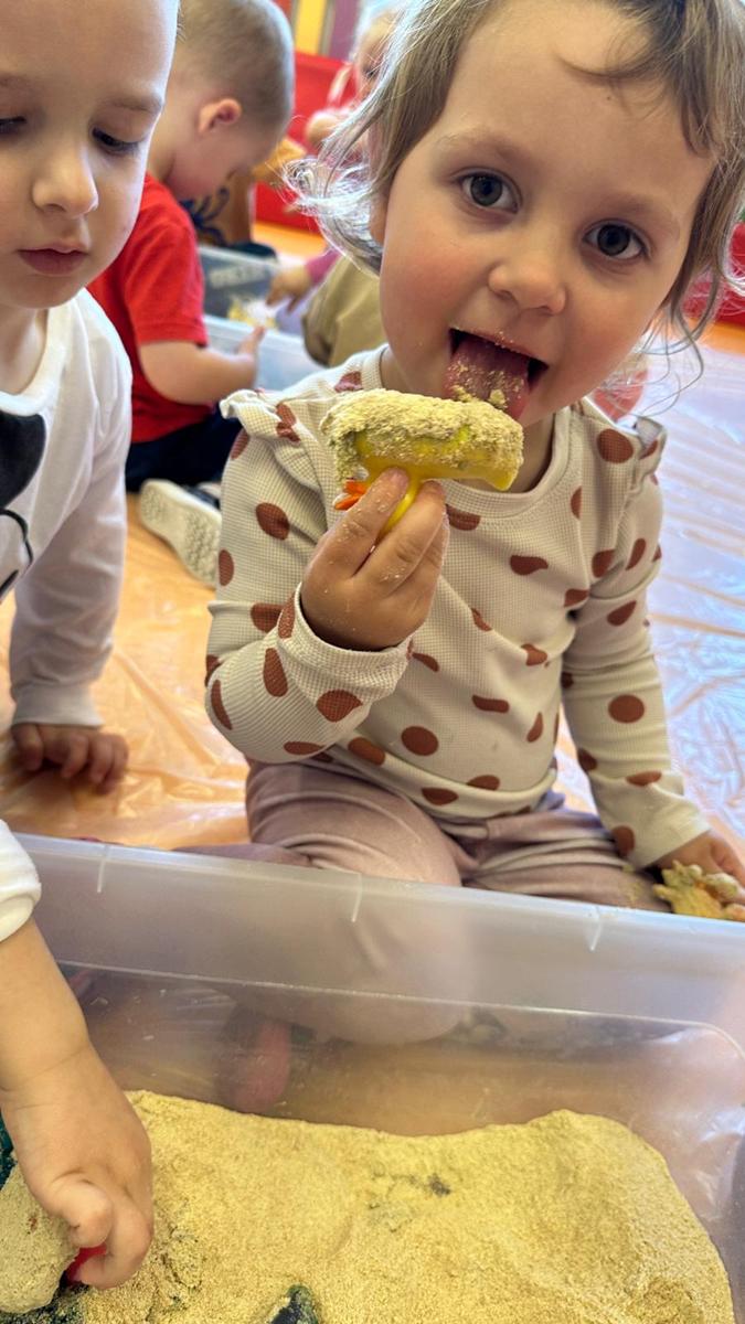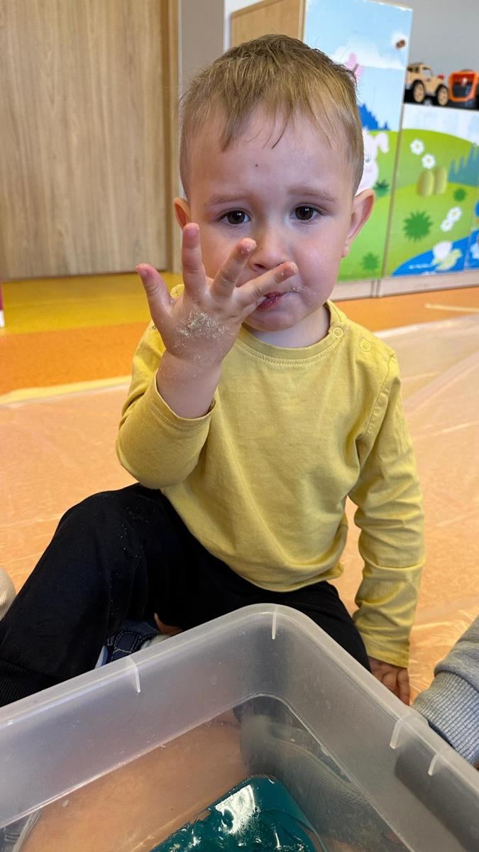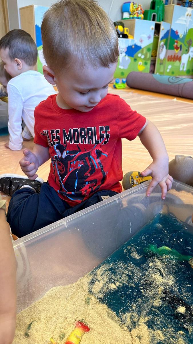Zabawy sensoryczne pozwalają poznawać świat zmysłami. Morze z galaretki, piasek z płatków śniadaniowych. Zajęcia sprawiły wiele radości dzieciom, mogły ugniatać, mieszać i przede wszystkim próbować. Było pysznie.