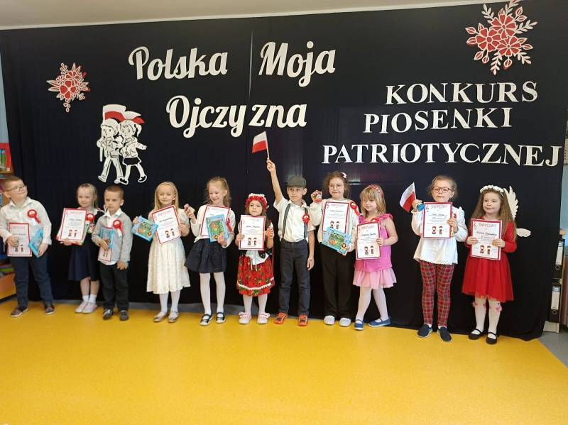 14 maja w naszym przedszkolu odbył się konkurs piosenki patriotycznej pt. "Polska Moja Ojczyzna ", którego celem była popularyzacja pieśni i piosenek o tematyce narodowej, wspieranie i rozwijanie zdolności muzycznych dzieci oraz kształtowanie postaw patriotycznych wśród przedszkolaków. W konkursie wzięło udział 11 uczestników. Wszystkie dzieci zaprezentowały się jak najlepiej, każdy uczestnik otrzymał dyplom, upominek i gromkie brawa Składamy serdeczne gratulacje i życzymy dalszych sukcesów wszystkim uczestnikom.