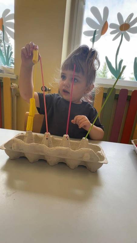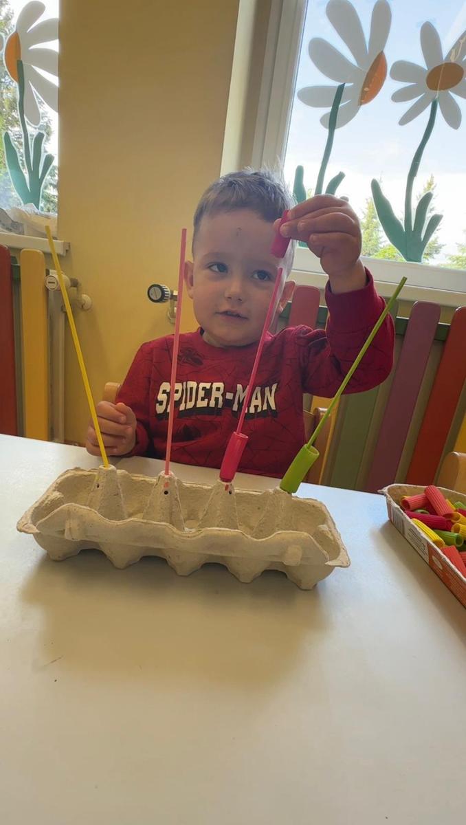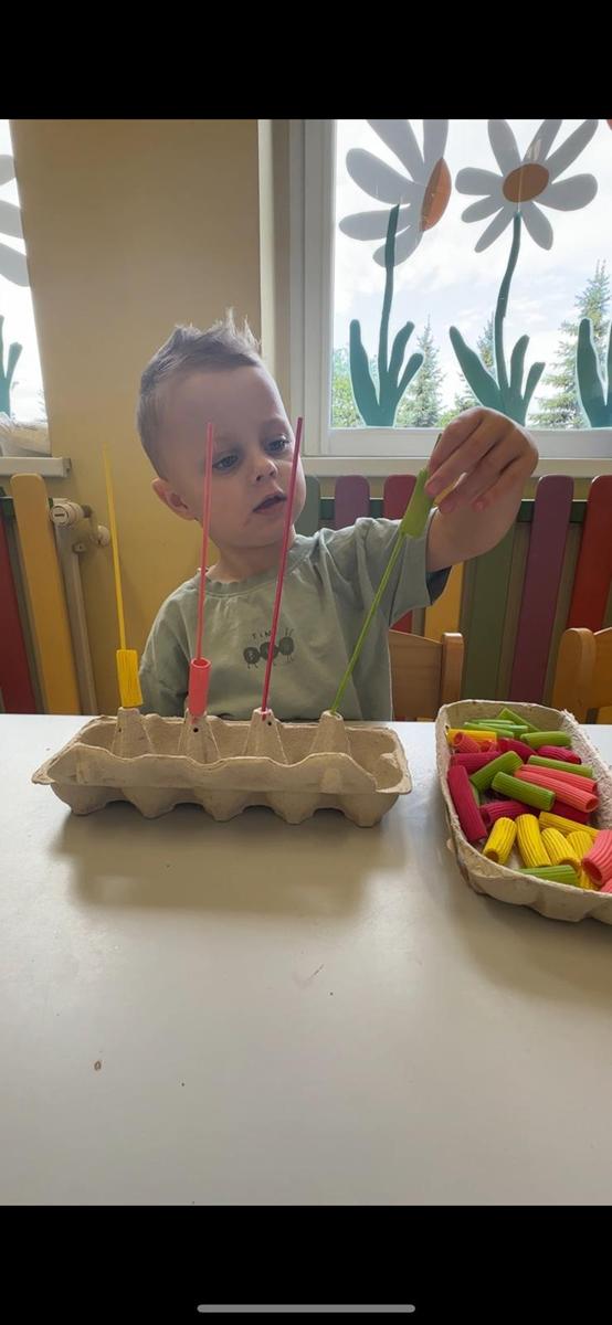 Nauka kolorów jest związana z rozwojem spostrzegania wzrokowego. Zabawa polega na nawlekania kolorowego makaronu na odpowiedni patyczek, a ma na celu ćwiczenie motoryki małej, rozwijanie logicznego myślenia, a przede wszystkim utrwalenie kolorów.