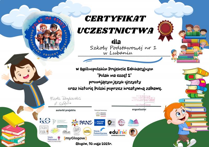 Nasza szkoła w bieżącym roku szkolnym wzięła udział w kolejnej edycji ogólnopolskiego projektu "Polak ma essę !2". Zadania tym razem nie dotyczyły tylko języka polskiego, ale również historii. Rozszerzono również zakres wiekowy uczestników o klasy VII i VIII. Od października do końca maja nauczyciele i uczniowie realizowali zadania projektowe. Na języku polskim pod okiem pań: Agnieszki Stępak - Cybulskiej, Iwony Smolińskiej oraz Agnieszki Szwabowicz wykonali następujące zadania: "Bohaterskie laparello" ,"Facebogowie", "Ortograficzne rysnotk"i oraz "W teatrze Kamishibai". W ramach zajęć z historii pani Monika Leszczyńska wraz z uczniami opracowała zadania "Bohaterowie naszych ulic" i "Wywiad z bliskimi". Zadania dostarczyły uczestnikom sporo zabawy, dzięki czemu każdy mógł wykazać się pomysłowością i różnymi talentami. Za realizację tych zadań otrzymaliśmy certyfikat. Szkolnym koordynatorem projektu była pani Agnieszka Szwabowicz. A.Sz.