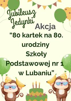 Z okazji obchodów 80. rocznicy założenia Szkoły Podstawowej nr 1 w Lubaniu zorganizowaliśmy niecodzienną akcję. Przygotowaliśmy specjalną inicjatywę polegającą na wysyłaniu kartek urodzinowych do naszej szkoły! Była to doskonała okazja, by wyrazić wdzięczność, wspomnienia oraz życzenia z okazji naszego Jubileuszu. Nasi absolwenci spisali się na medal! Otrzymaliśmy od nich 20 kartek z pięknymi życzeniami, wiadomościami, wspomnieniami z czasów, które spędzili w naszej szkole! Dziękujemy, że dołączyliście do obchodów tej wyjątkowej rocznicy! Wspólnie stworzyliśmy niezapomnianą pamiątkę! Koordynatorem akcji była pani Ewa Łącka. I.S.