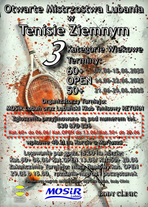 Miejski Ośrodek Sportu i Rekreacji w Lubaniu wraz z Lubańskim Klubem Tenisowowym RETURN zapraszają na Otwarte Mistrzostwa Lubania w tenisie ziemnym.