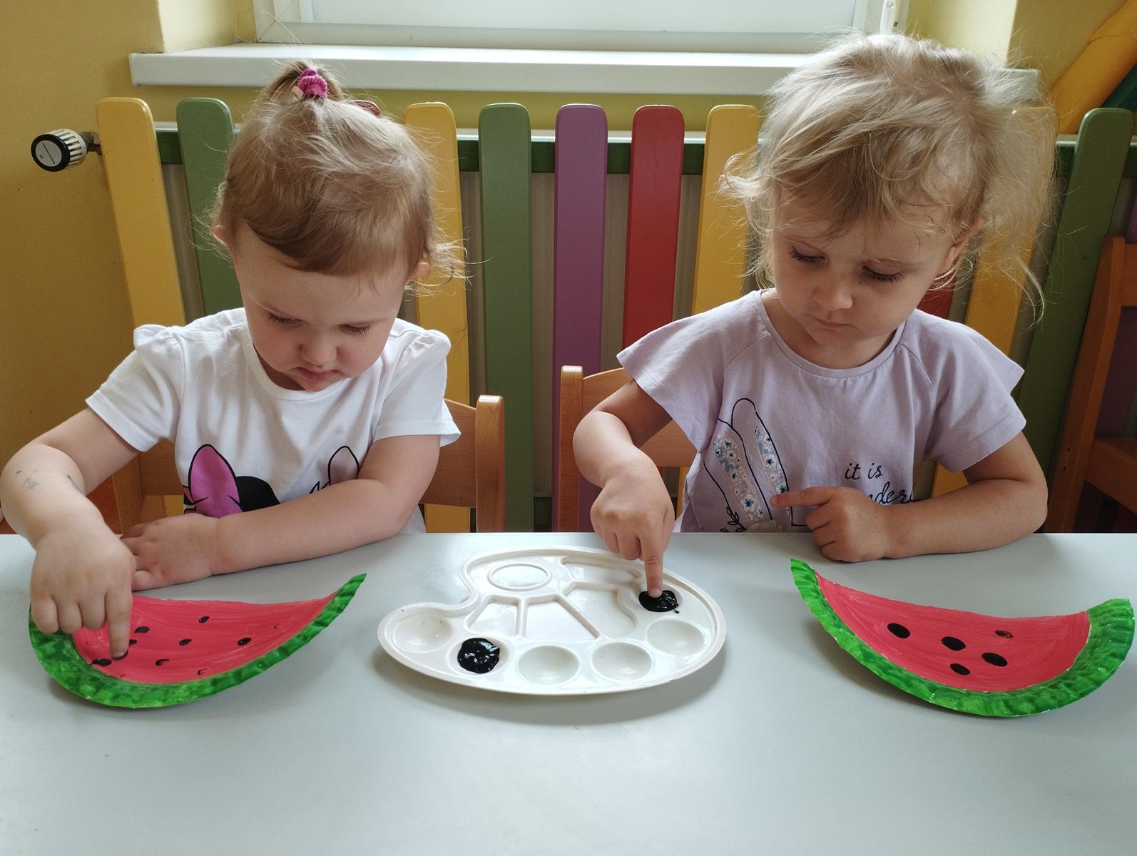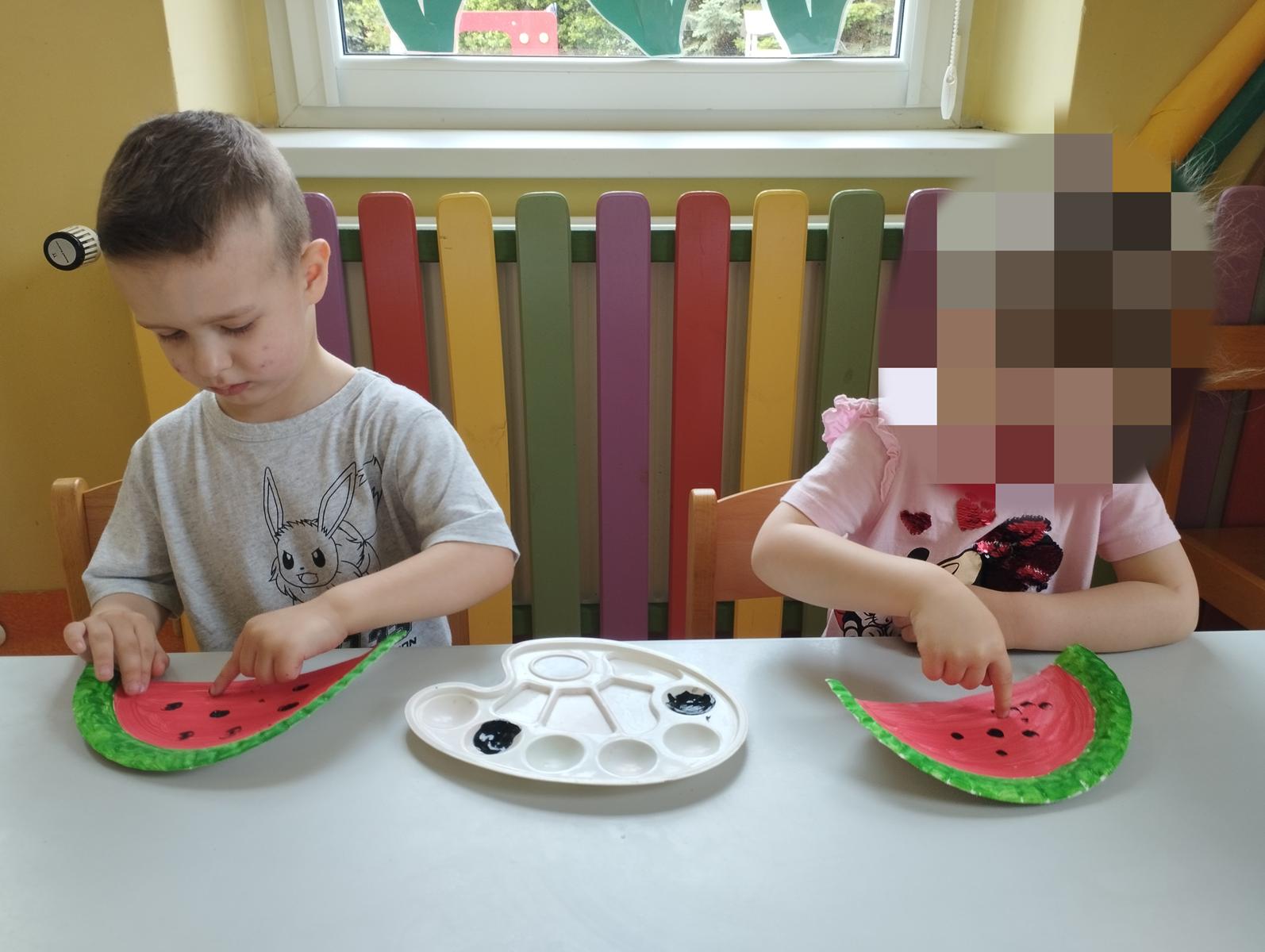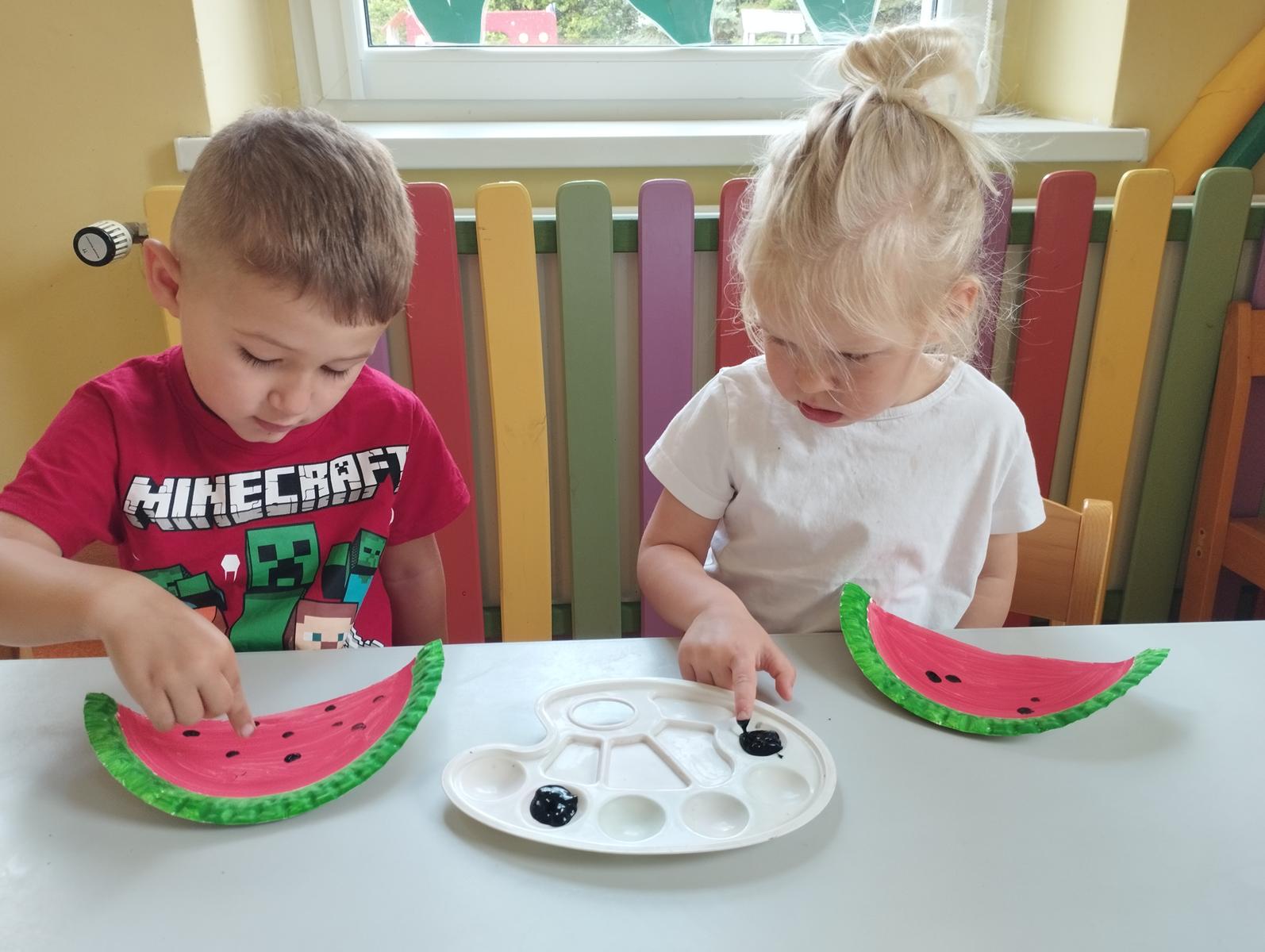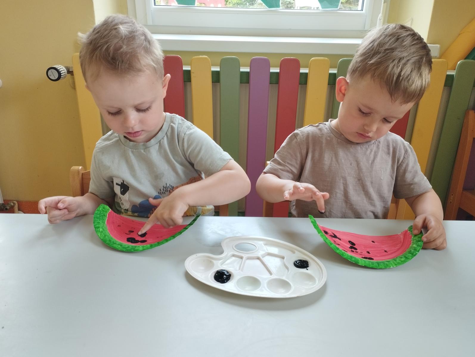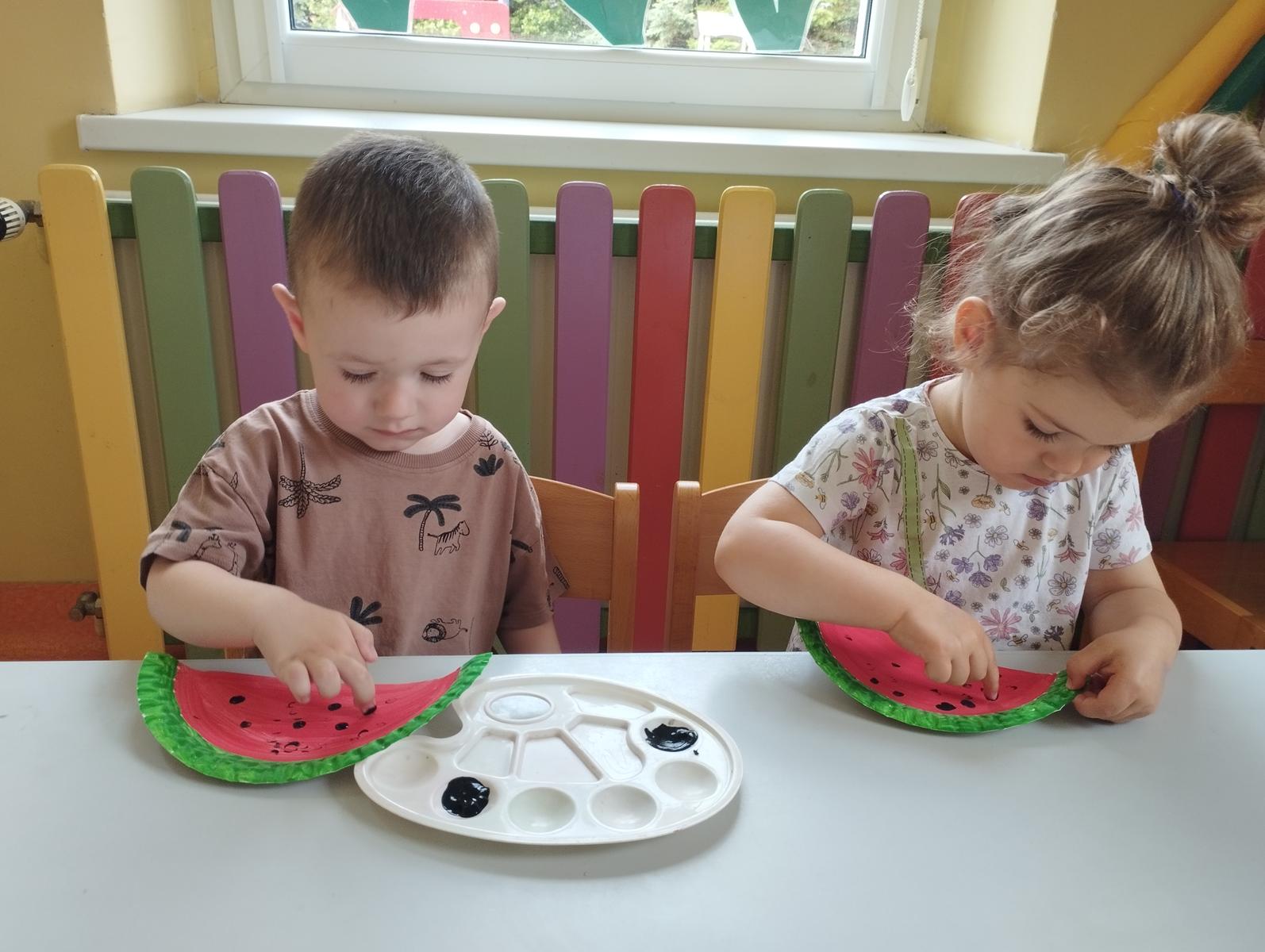 Na zajęciach plastycznych dzieci wykonywały pracę przedstawiającą kawałek arbuza. Do jej wykonania potrzebowały papierowych talerzyków i farb. Arbuzy wyszły pięknie i smacznie. Pracę można podziwiać na wystawie w szatni żłobkowej.