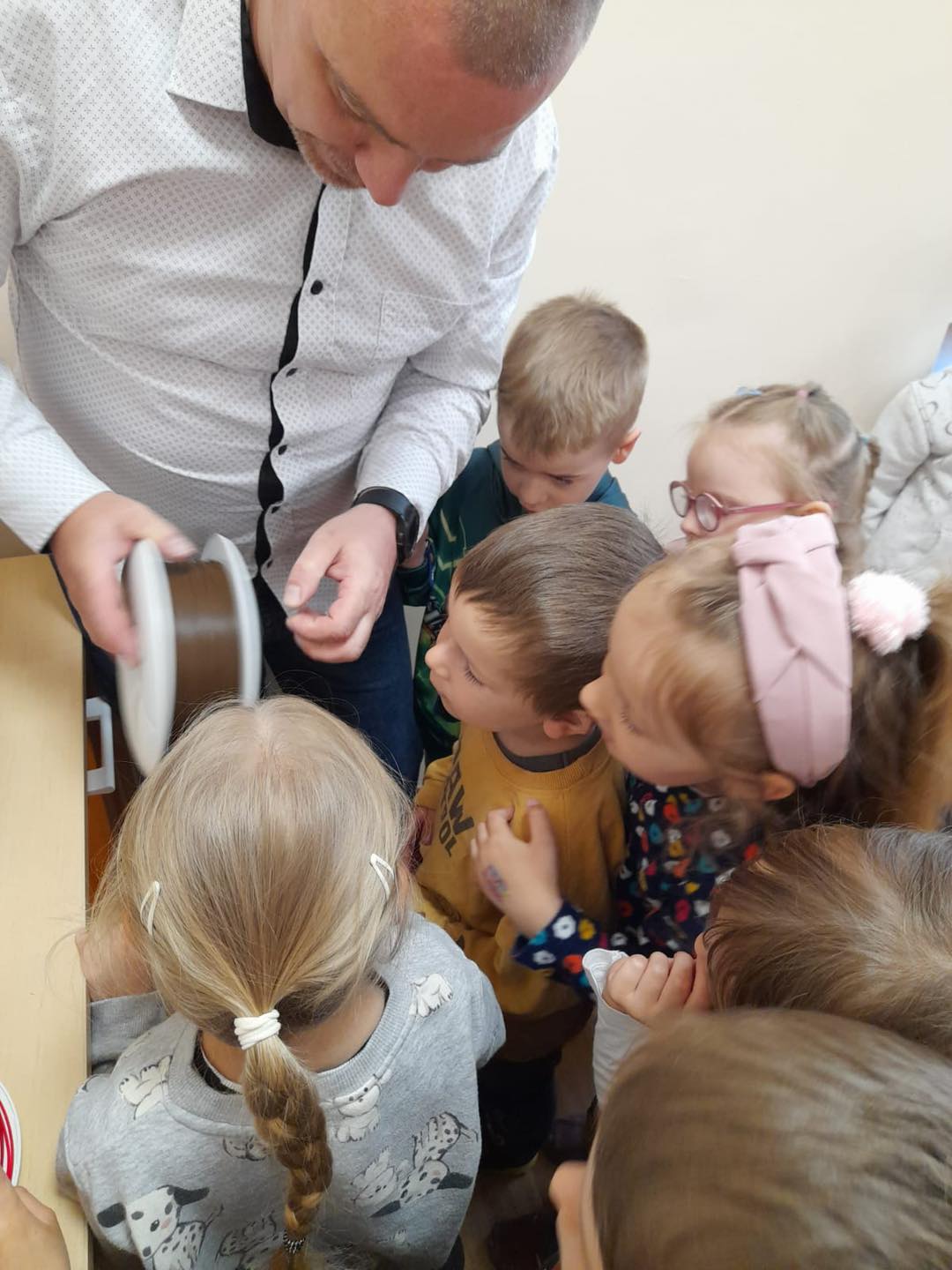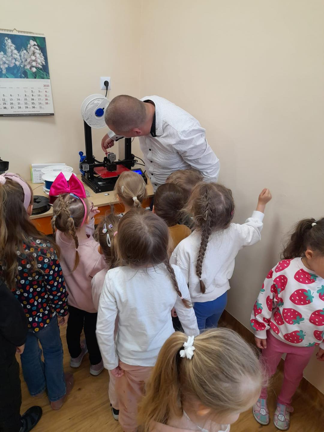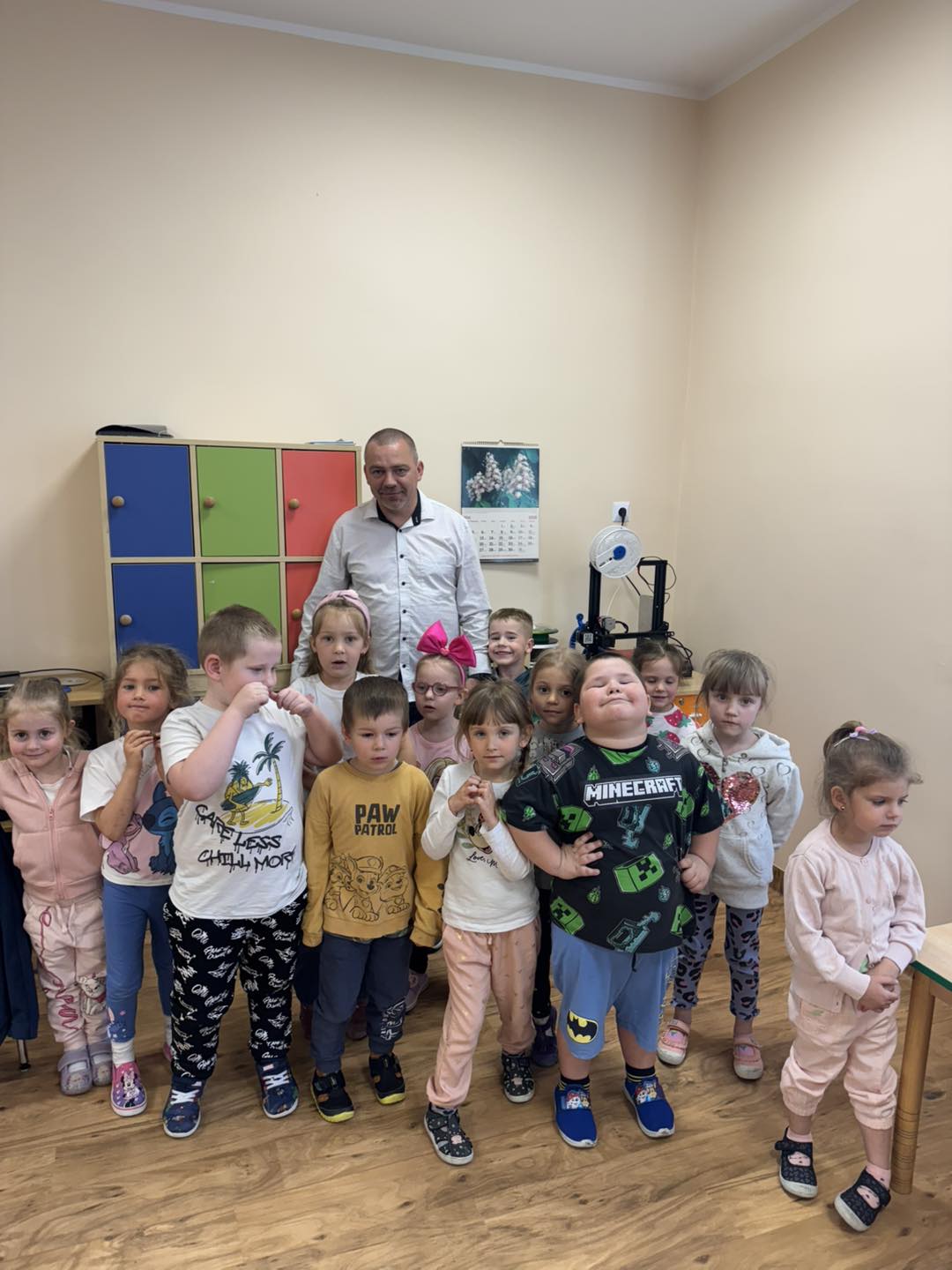 Dzisiaj grupę 4 latków odwiedził tata Kubusia, Pan Adam, który pokazał dzieciom drukarkę 3D, za pomocą której można wydrukować np. różnego rodzaju figurki, zabawki, przedmioty itp. Dzieci z zainteresowaniem słuchały, w jaki sposób można wydrukować trójwymiarową rzecz. Pan Adam bardzo ciekawie opowiadał o swojej pasji, która niezwykle zaciekawiła dzieci. Ponadto mogliśmy zobaczyć, dotknąć i pobawić się zabawkami, które stworzył tata Kuby. To niezwykle, pouczające przeżycie za które bardzo dziękujemy Panu Adamowi.