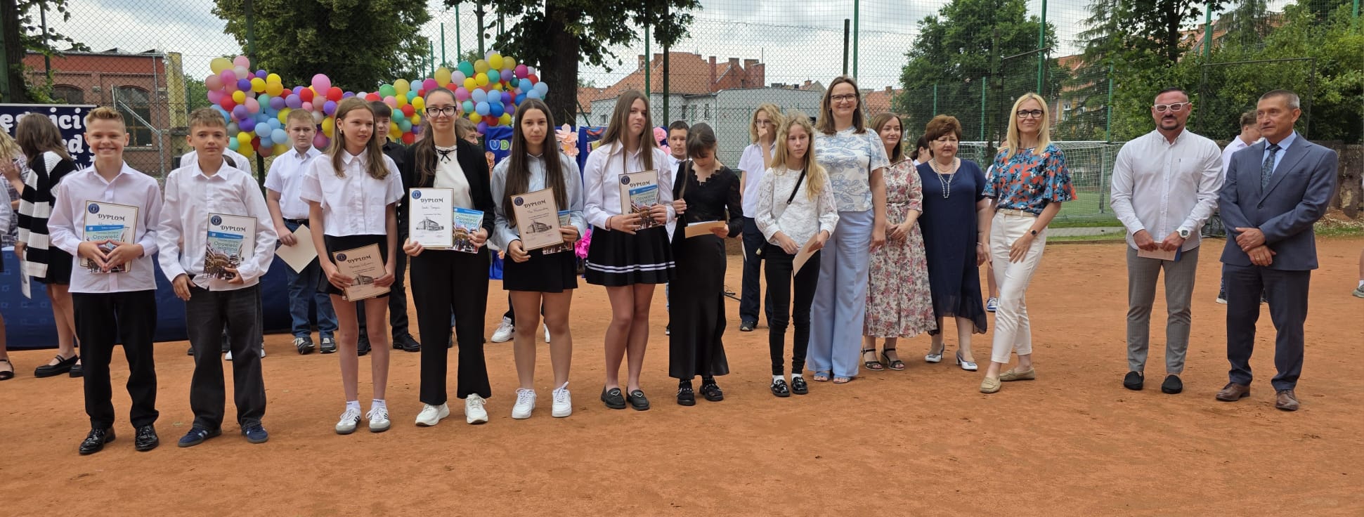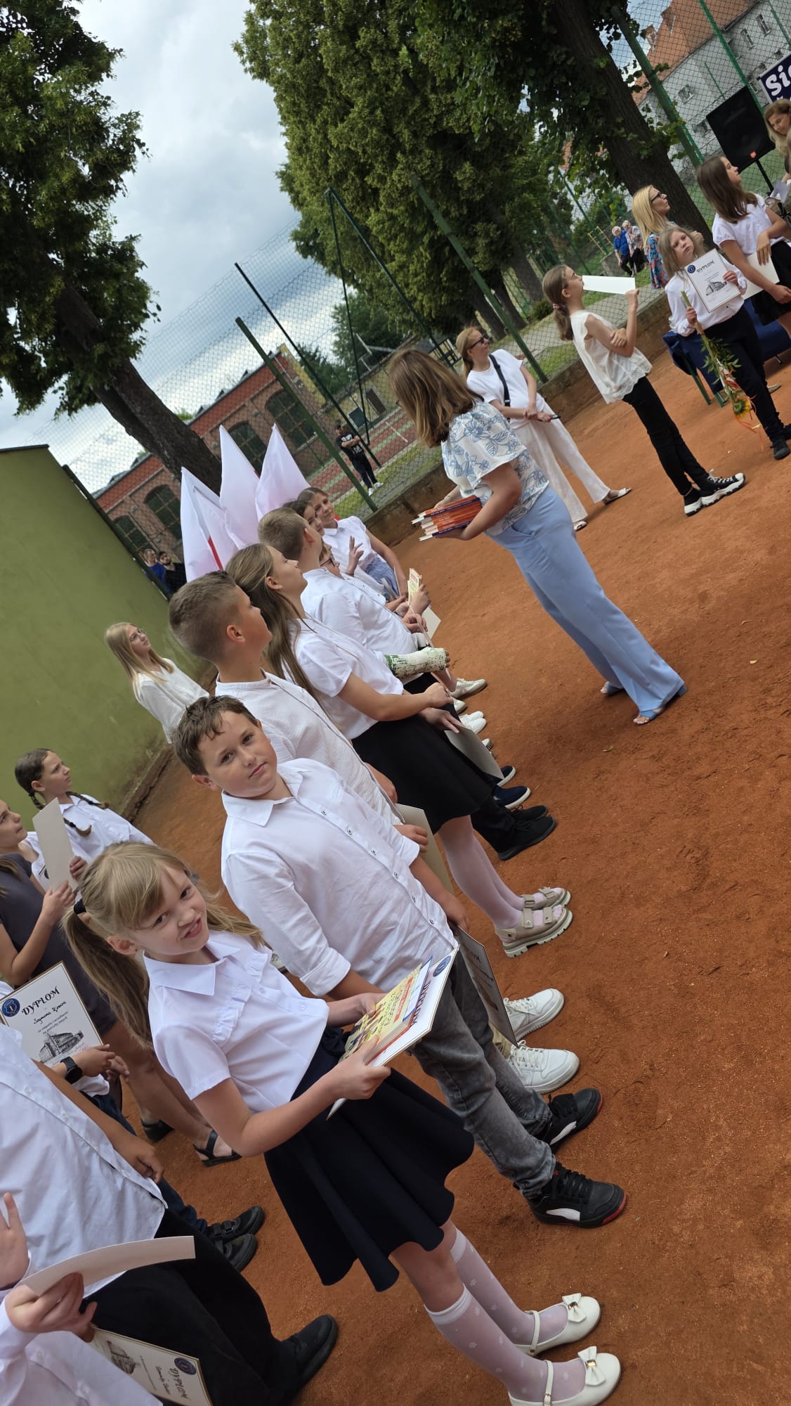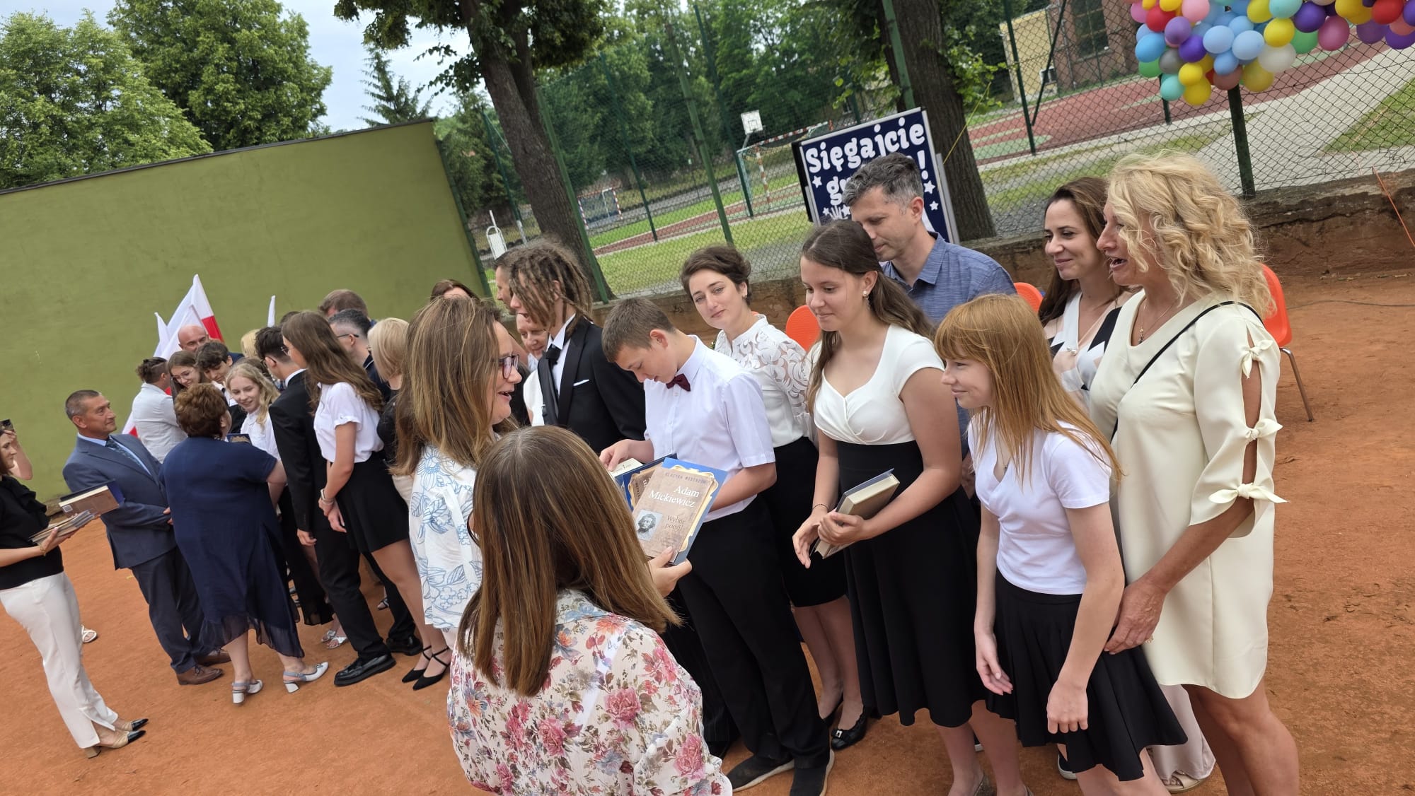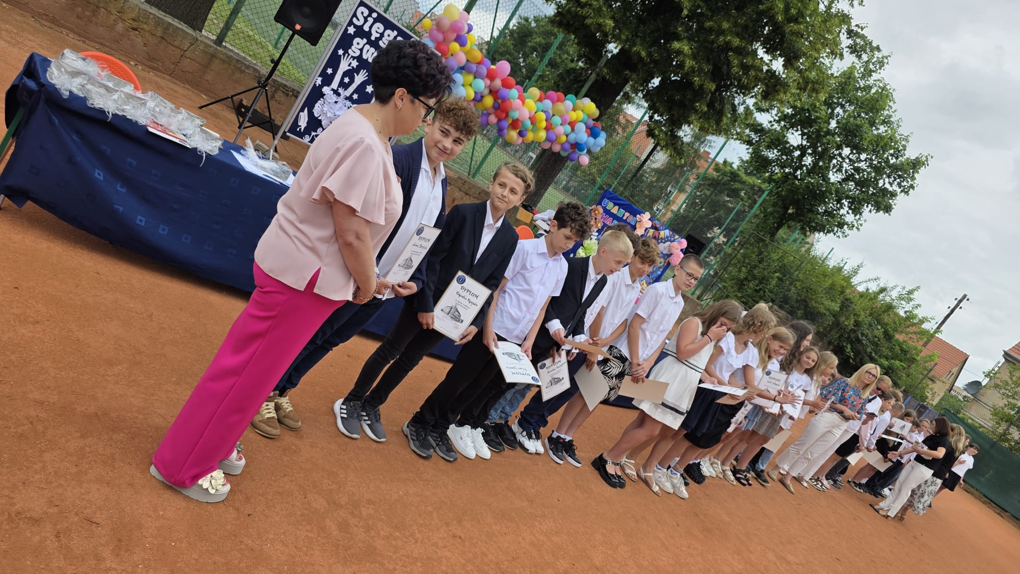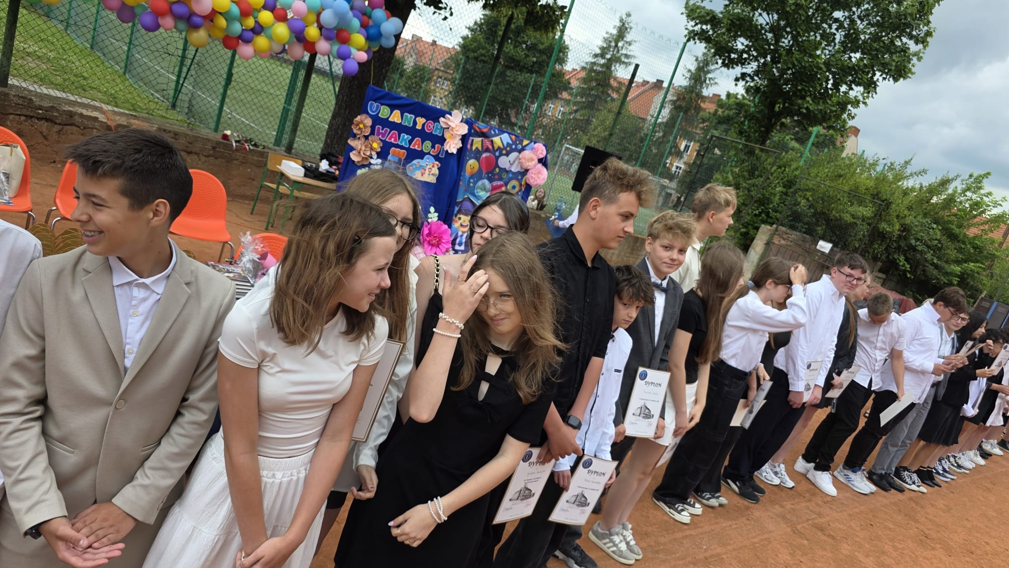 W letni, słoneczny piątek (27 czerwca), w SP1, odbyły się uroczyste zakończenia roku szkolnego 2024/2025 w turach dla kl. I-V i VI-VIII. Najpierw Pani Dyrektor Jedynki Beata Myśliwiec serdecznie podziękowała wszystkim za trud, starania oraz pracę wykonaną przez ostatnich 10 miesięcy. Później wręczyła wyróżniającym się uczniom nagrody i świadectwa z czerwonym paskiem, a także pogratulowała licznych sukcesów. Szczególnym momentem apelów były występy artystyczne, w tym pożegnanie czterech wyjątkowych klas: 8abcd, które całą uroczystość uświetniły przepięknym odtańczeniem poloneza. Szczególne i serdeczne podziękowania należą się rodzicom naszych uczniów za wszelką udzielaną nam pomoc, a także życzliwą współpracę. Dziękujemy pięknie wszystkim za kolejny, owocny rok szkolny. Życzymy całej społeczności SP1 – bezpiecznych, pogodnych, pełnych radości i relaksu wakacji! Do zobaczenia już niebawem, tj. 1 września!