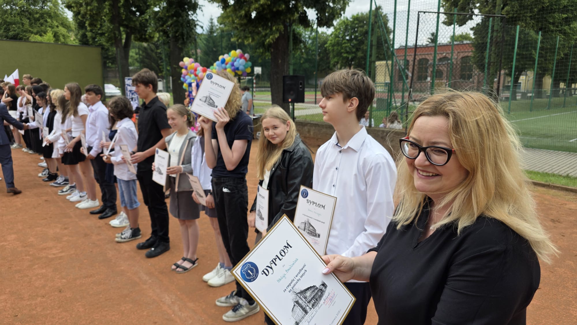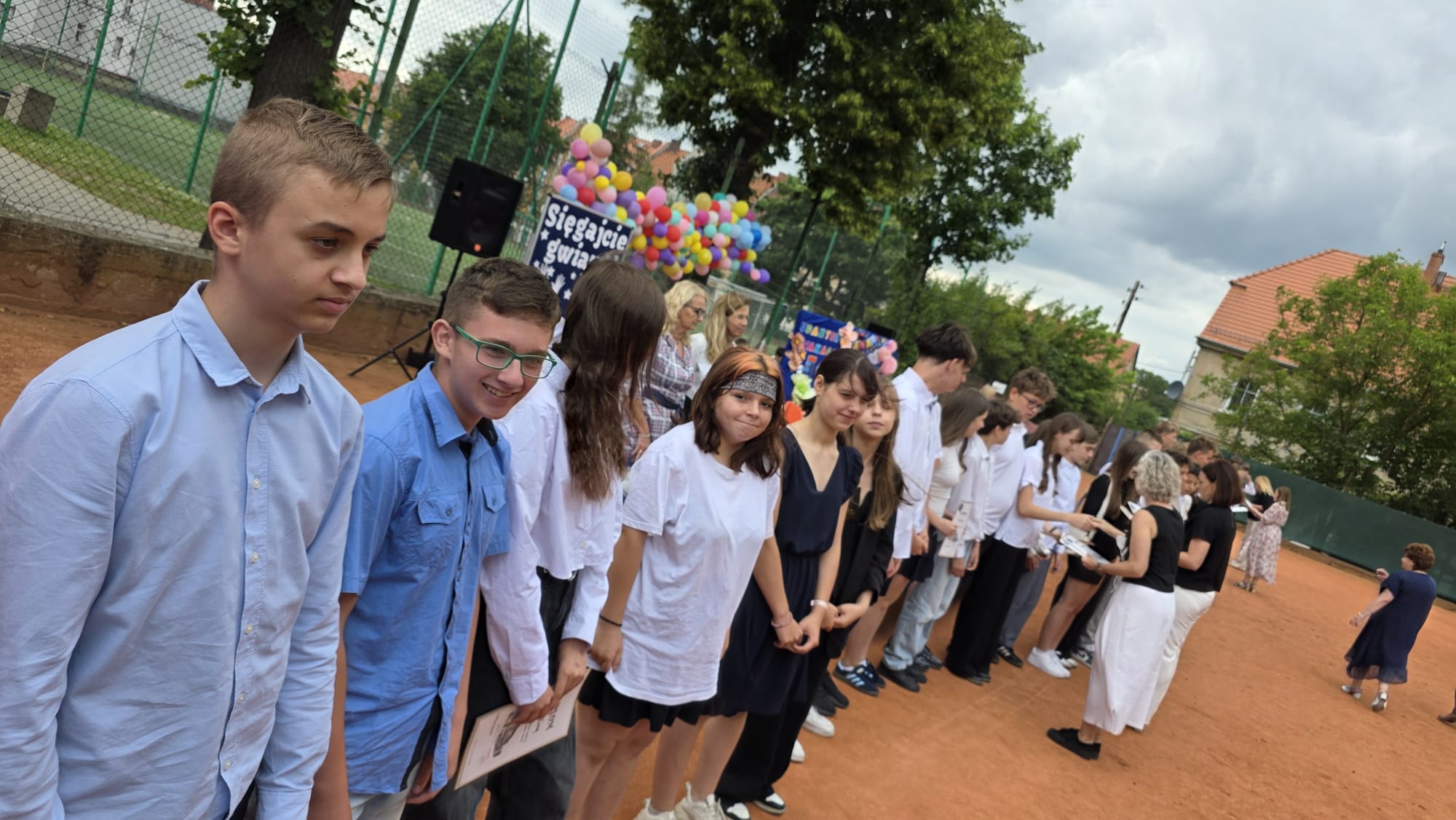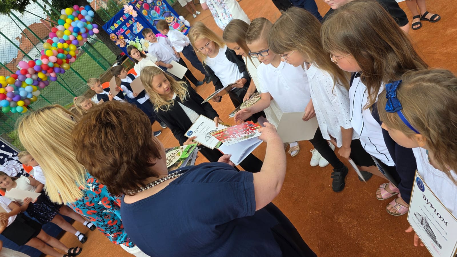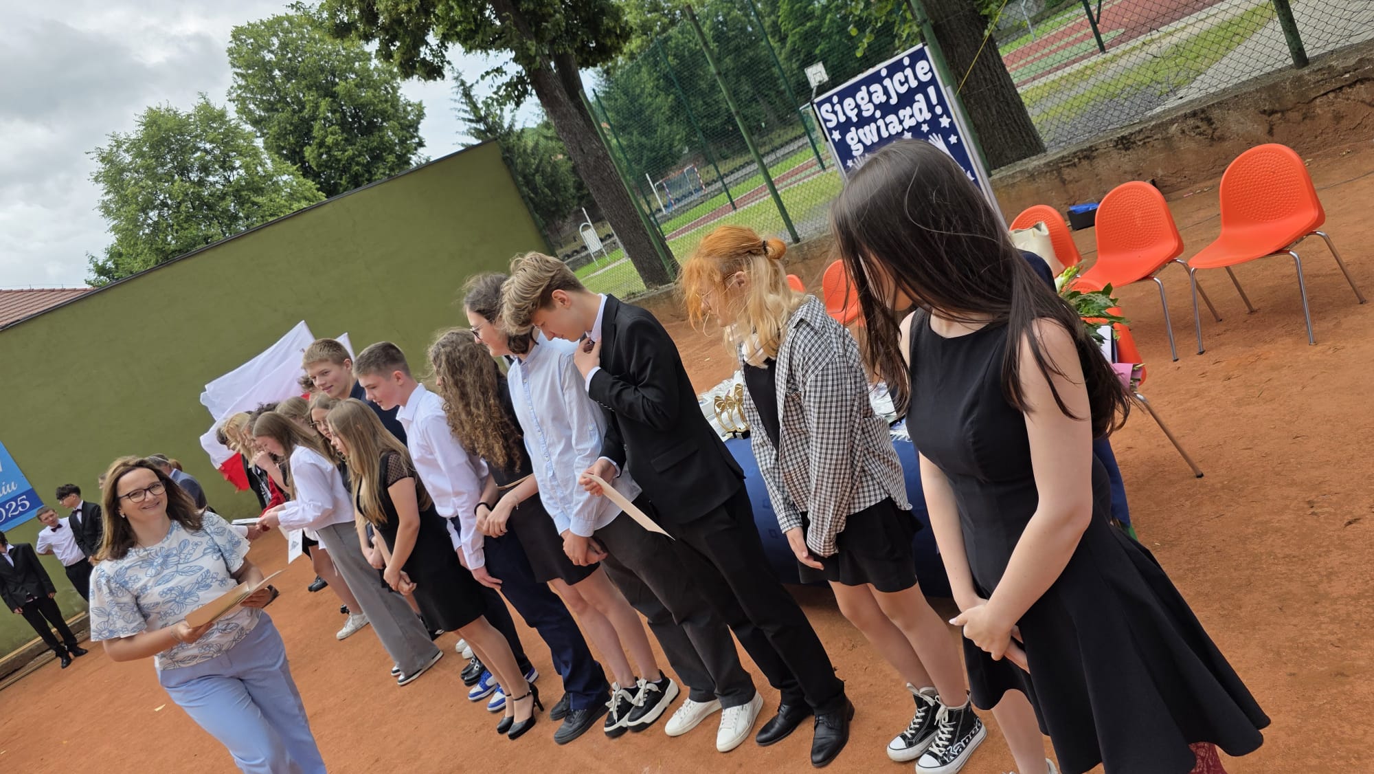 W letni, słoneczny piątek (27 czerwca), w SP1, odbyły się uroczyste zakończenia roku szkolnego 2024/2025 w turach dla kl. I-V i VI-VIII. Najpierw Pani Dyrektor Jedynki Beata Myśliwiec serdecznie podziękowała wszystkim za trud, starania oraz pracę wykonaną przez ostatnich 10 miesięcy. Później wręczyła wyróżniającym się uczniom nagrody i świadectwa z czerwonym paskiem, a także pogratulowała licznych sukcesów. Szczególnym momentem apelów były występy artystyczne, w tym pożegnanie czterech wyjątkowych klas: 8abcd, które całą uroczystość uświetniły przepięknym odtańczeniem poloneza. Szczególne i serdeczne podziękowania należą się rodzicom naszych uczniów za wszelką udzielaną nam pomoc, a także życzliwą współpracę. Dziękujemy pięknie wszystkim za kolejny, owocny rok szkolny. Życzymy całej społeczności SP1 – bezpiecznych, pogodnych, pełnych radości i relaksu wakacji! Do zobaczenia już niebawem, tj. 1 września!
