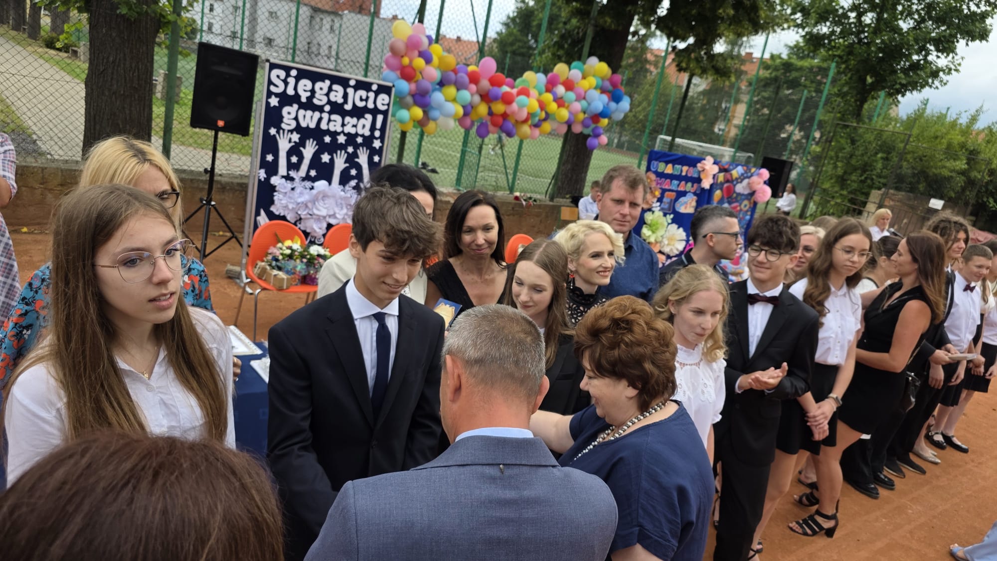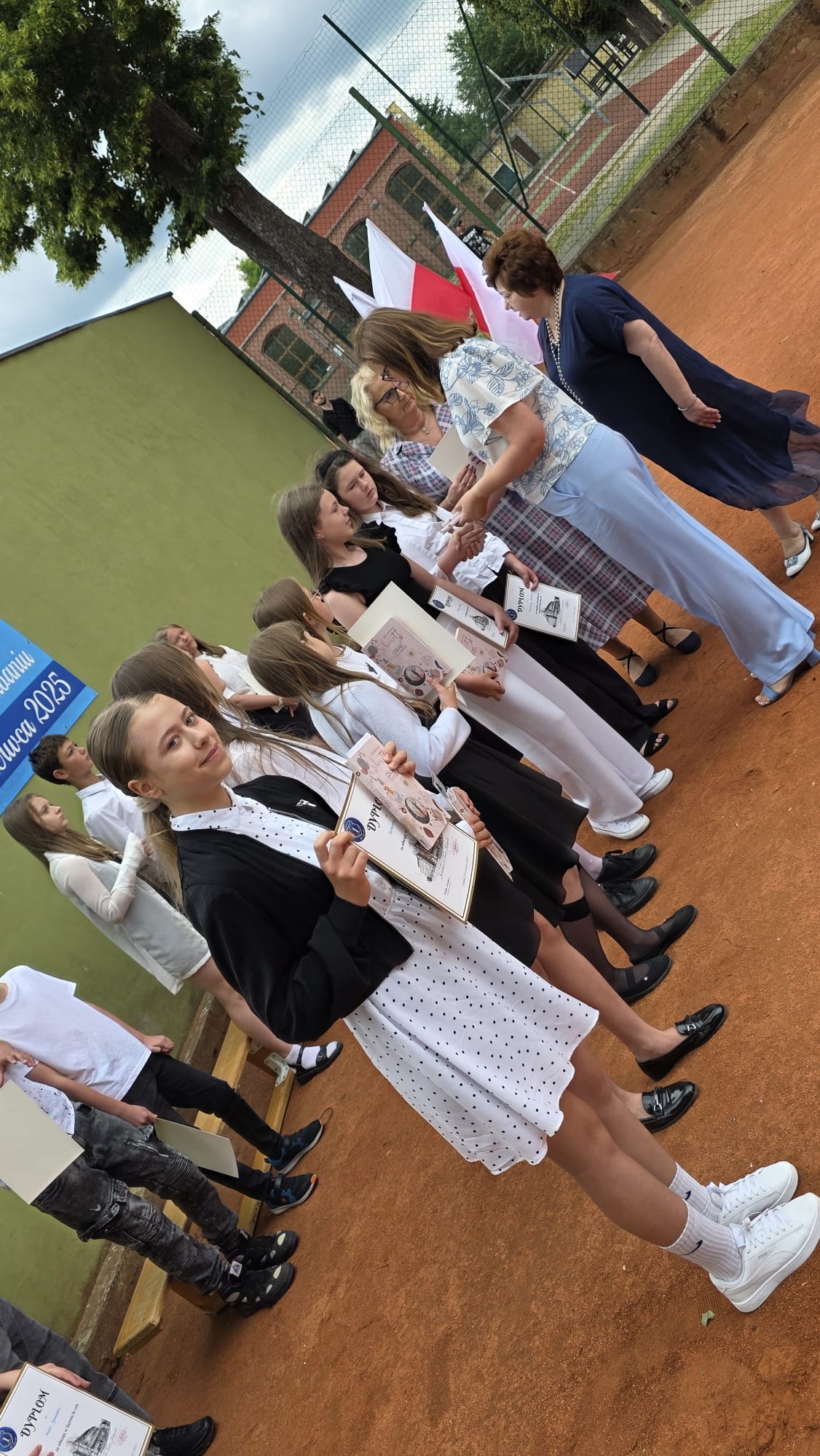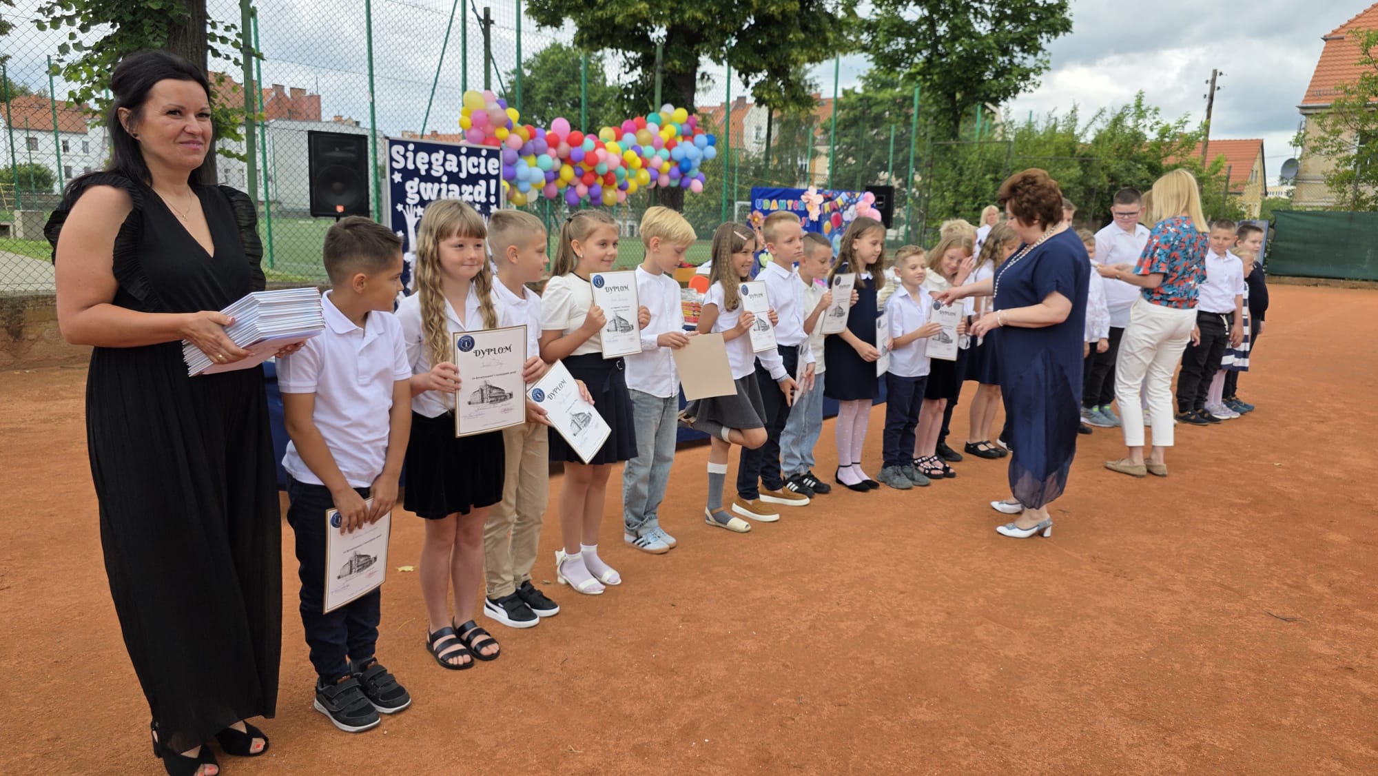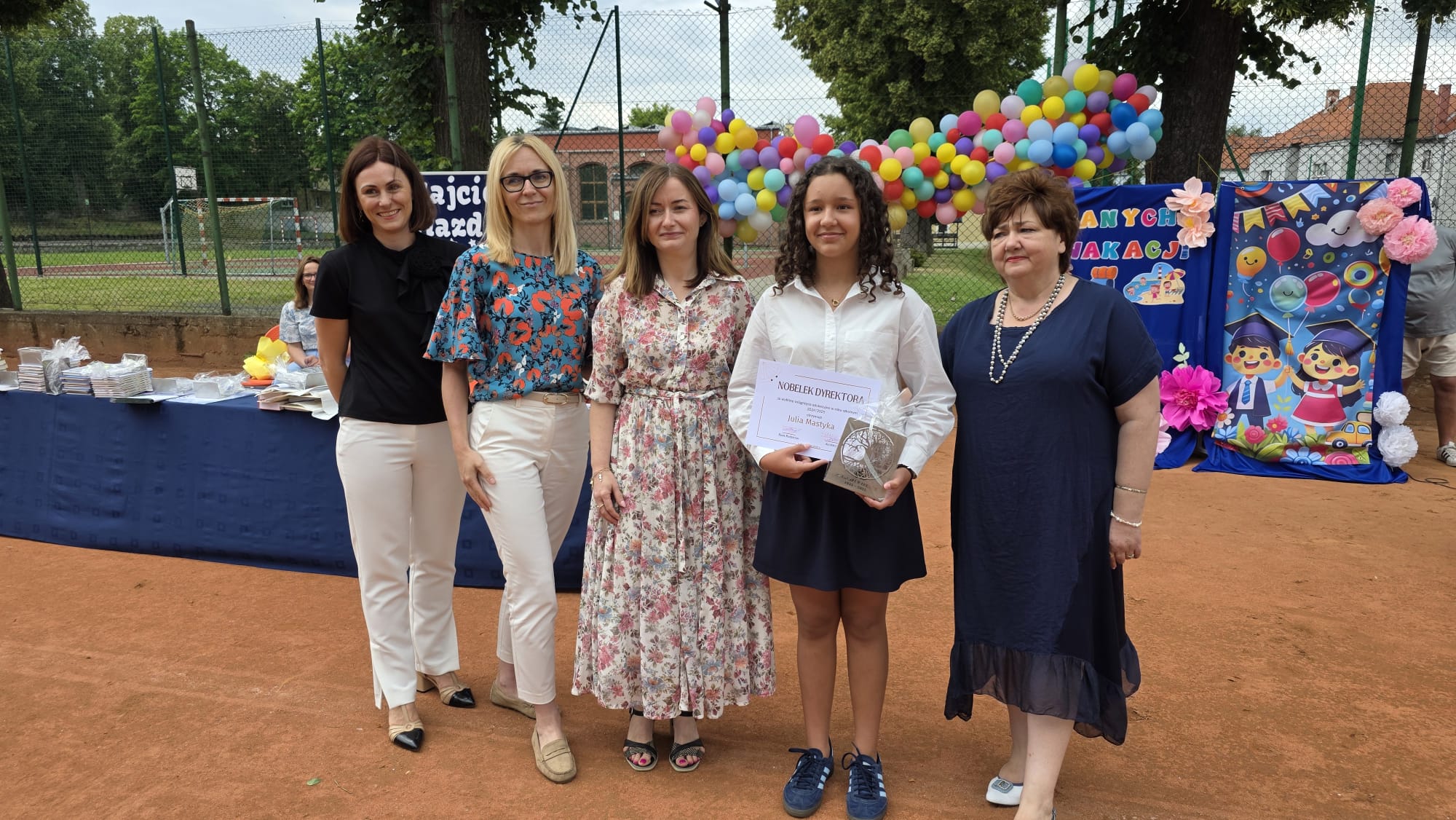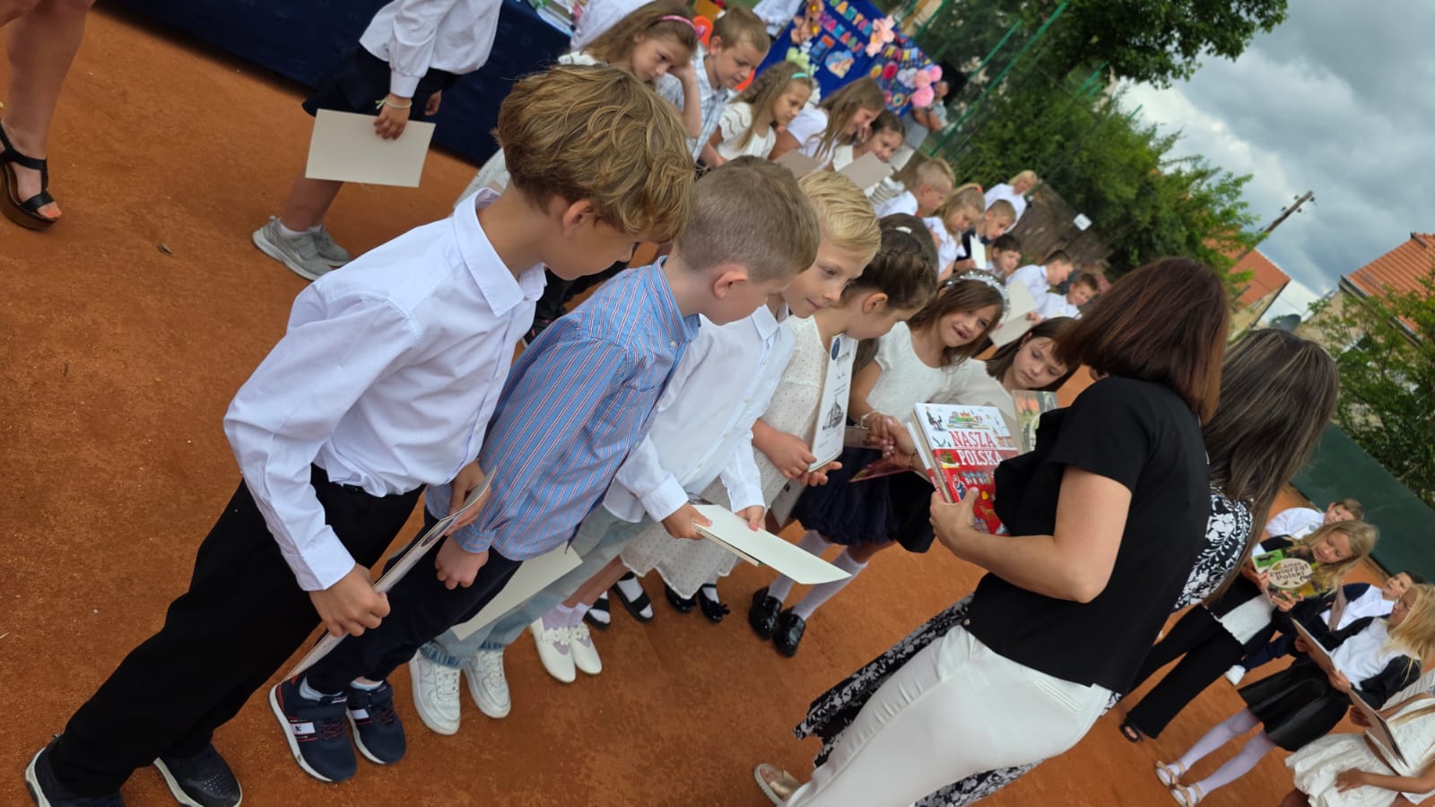 W letni, słoneczny piątek (27 czerwca), w SP1, odbyły się uroczyste zakończenia roku szkolnego 2024/2025 w turach dla kl. I-V i VI-VIII. Najpierw Pani Dyrektor Jedynki Beata Myśliwiec serdecznie podziękowała wszystkim za trud, starania oraz pracę wykonaną przez ostatnich 10 miesięcy. Później wręczyła wyróżniającym się uczniom nagrody i świadectwa z czerwonym paskiem, a także pogratulowała licznych sukcesów. Szczególnym momentem apelów były występy artystyczne, w tym pożegnanie czterech wyjątkowych klas: 8abcd, które całą uroczystość uświetniły przepięknym odtańczeniem poloneza. Szczególne i serdeczne podziękowania należą się rodzicom naszych uczniów za wszelką udzielaną nam pomoc, a także życzliwą współpracę. Dziękujemy pięknie wszystkim za kolejny, owocny rok szkolny. Życzymy całej społeczności SP1 – bezpiecznych, pogodnych, pełnych radości i relaksu wakacji! Do zobaczenia już niebawem, tj. 1 września!