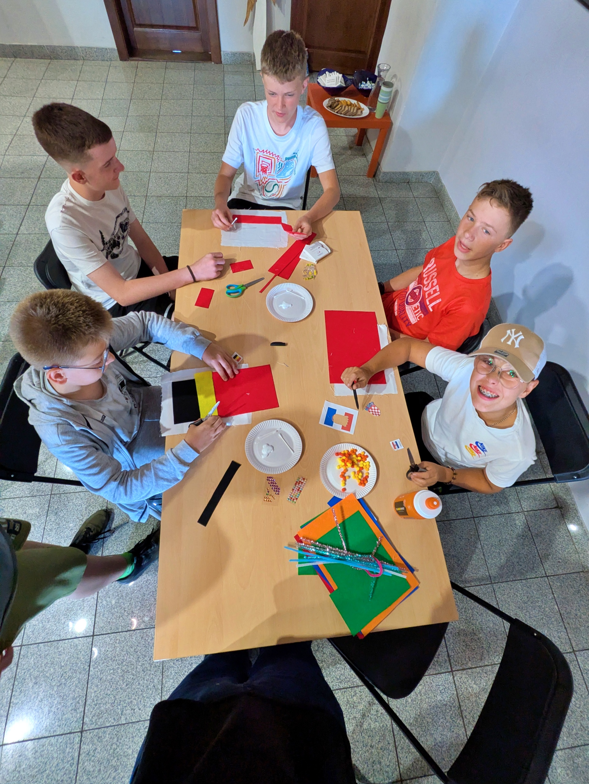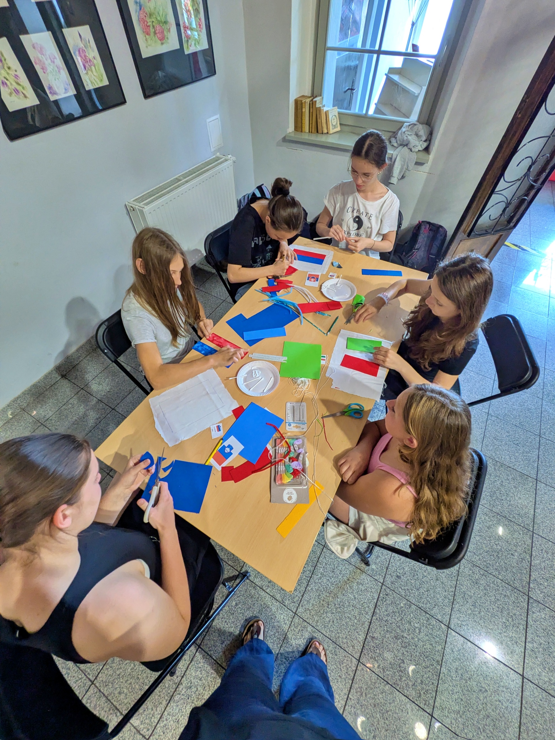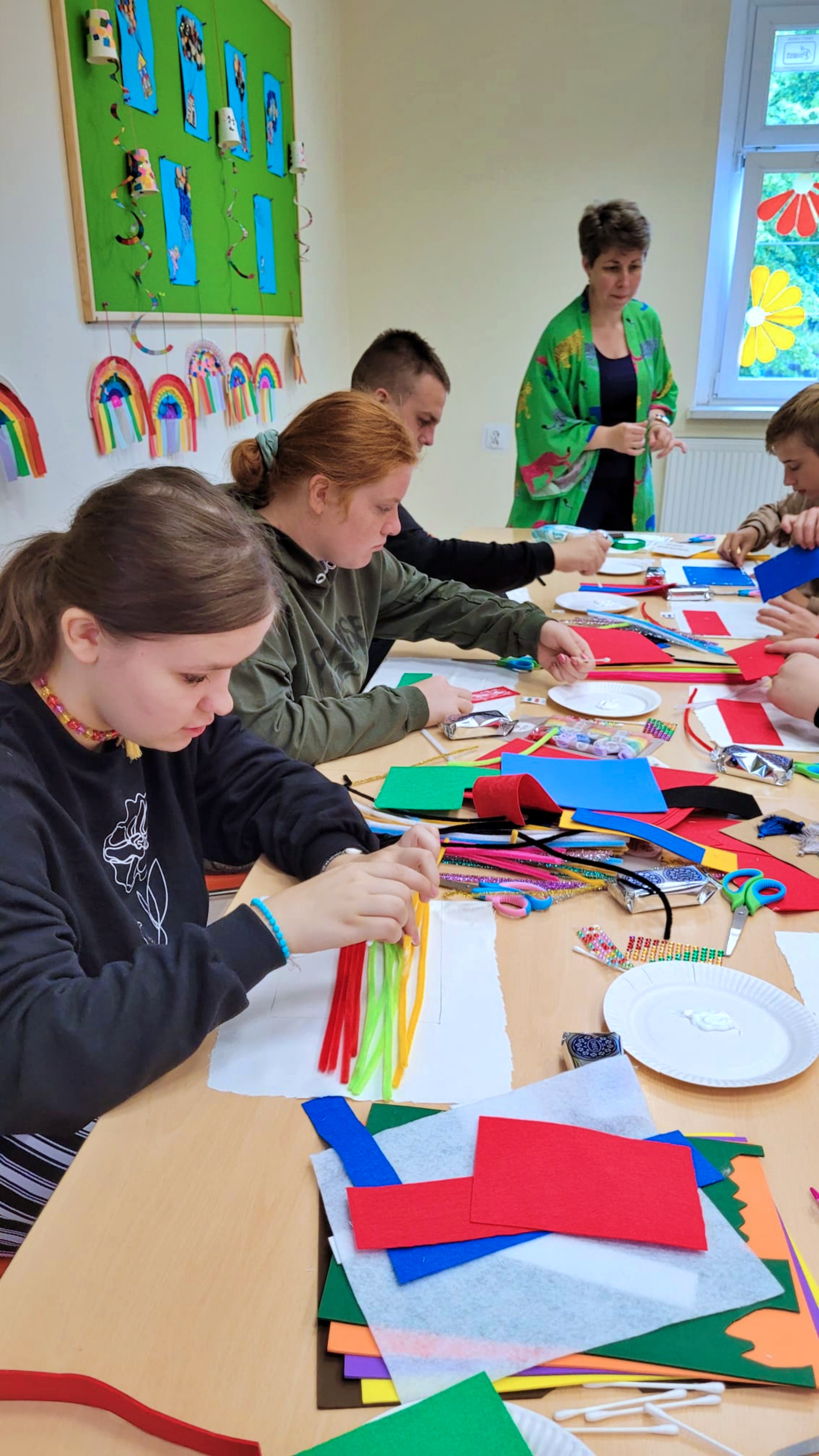 Zajęcia rozpoczęły się krótkim wprowadzeniem na temat znaczenia symboli wspólnotowych i roli flag jako formy wyrażania przynależności oraz lokalnej tożsamości. Uczestnicy zastanawiali się, jakie wartości i cechy najlepiej oddają charakter ich społeczności. Wspólnie dyskutowano o takich wartościach jak solidarność, różnorodność, współpraca czy otwartość na innych.