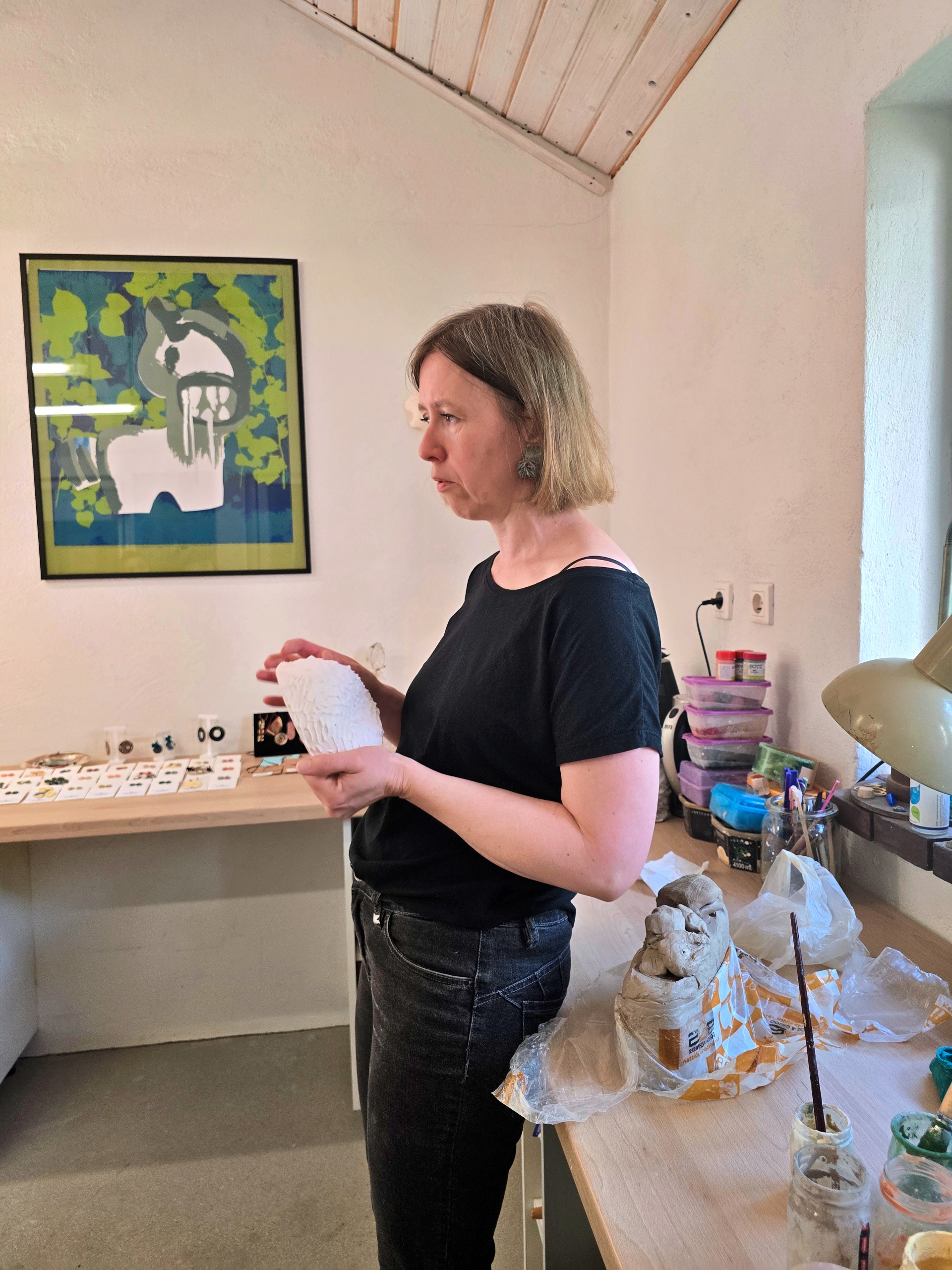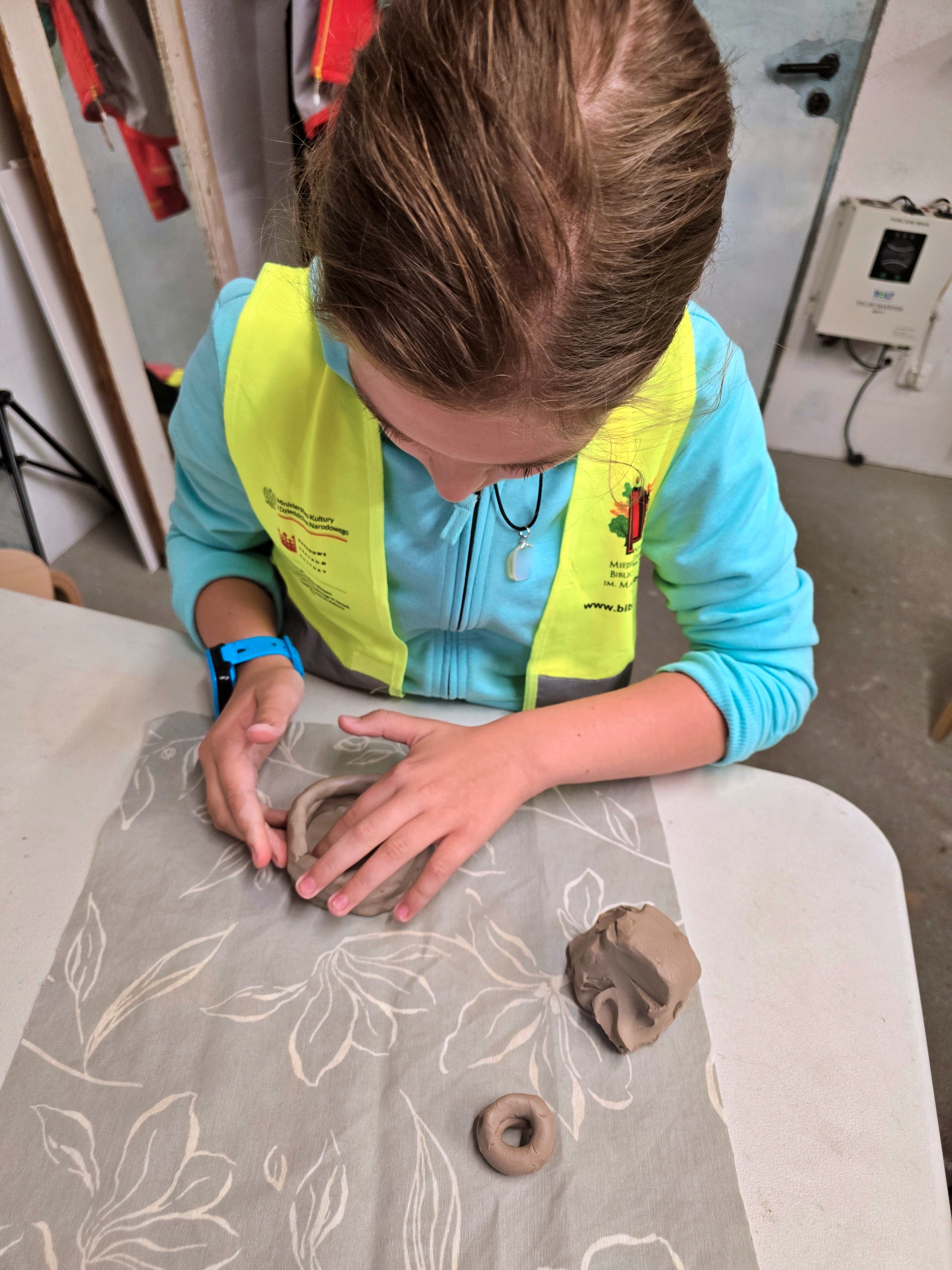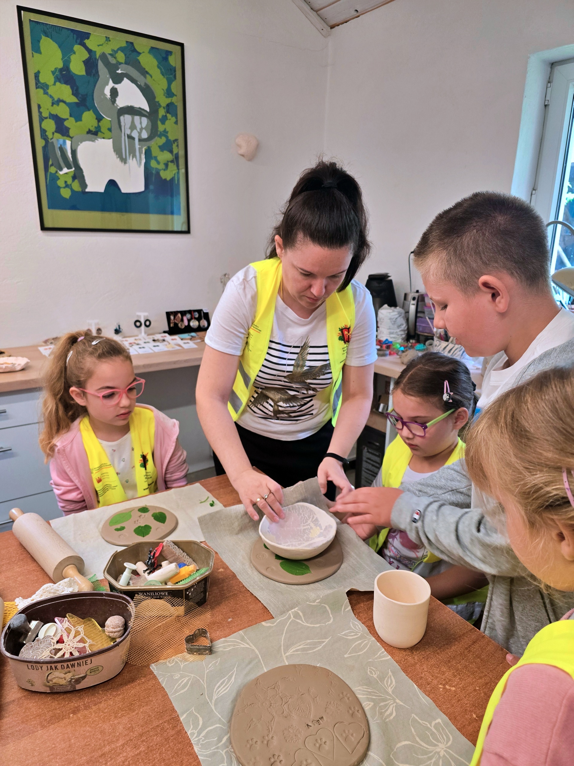 Wakacyjna wyprawa rozpoczęła się od wizyty w ceraMonic – kameralnej pracowni ceramicznej, położonej w otoczeniu zieleni. Podczas warsztatów pani Monika opowiedziała o pochodzeniu wykorzystywanej gliny, zwracając uwagę na jej lokalne źródło – kaolin z okolic Nowogrodźca.