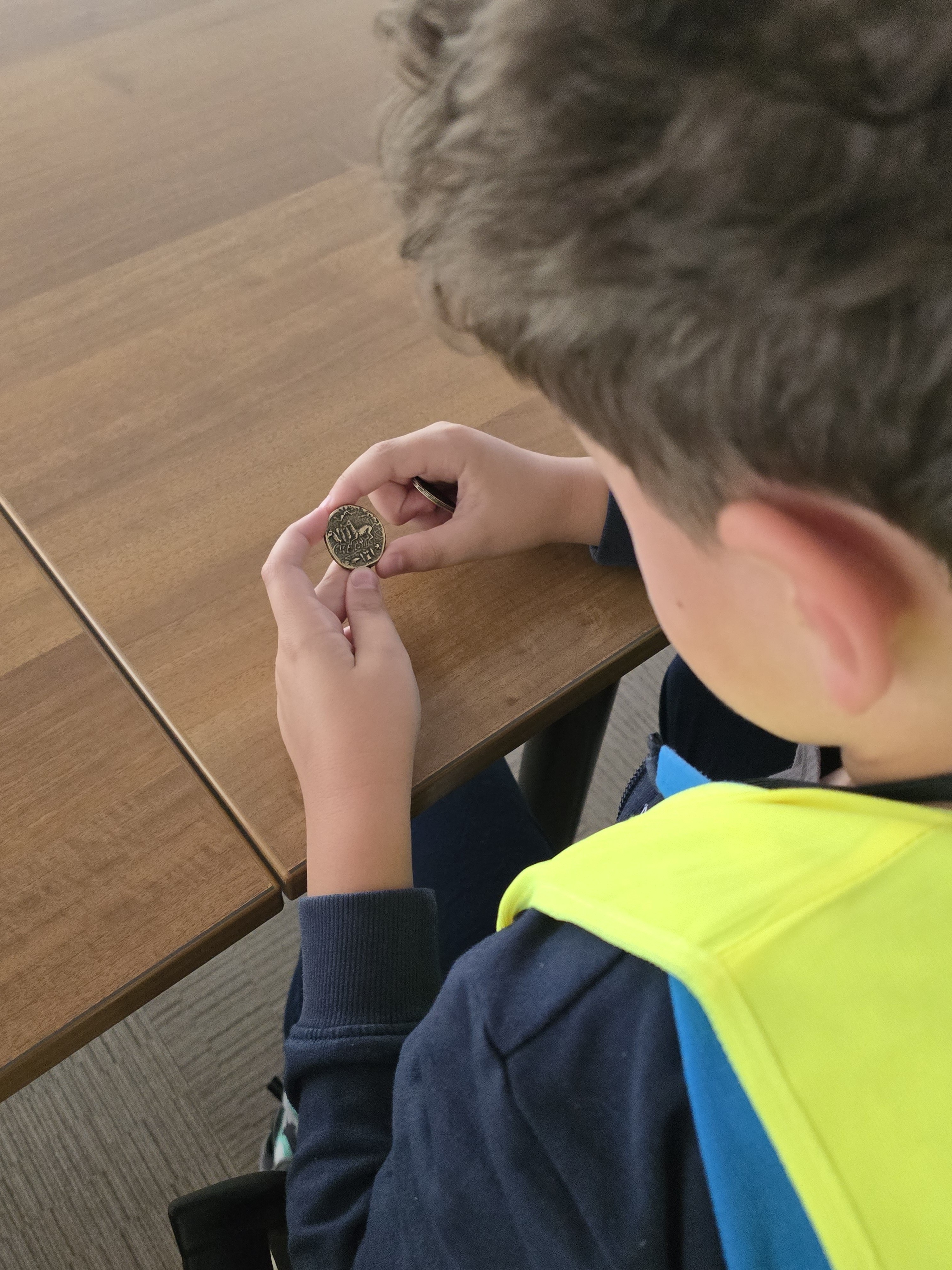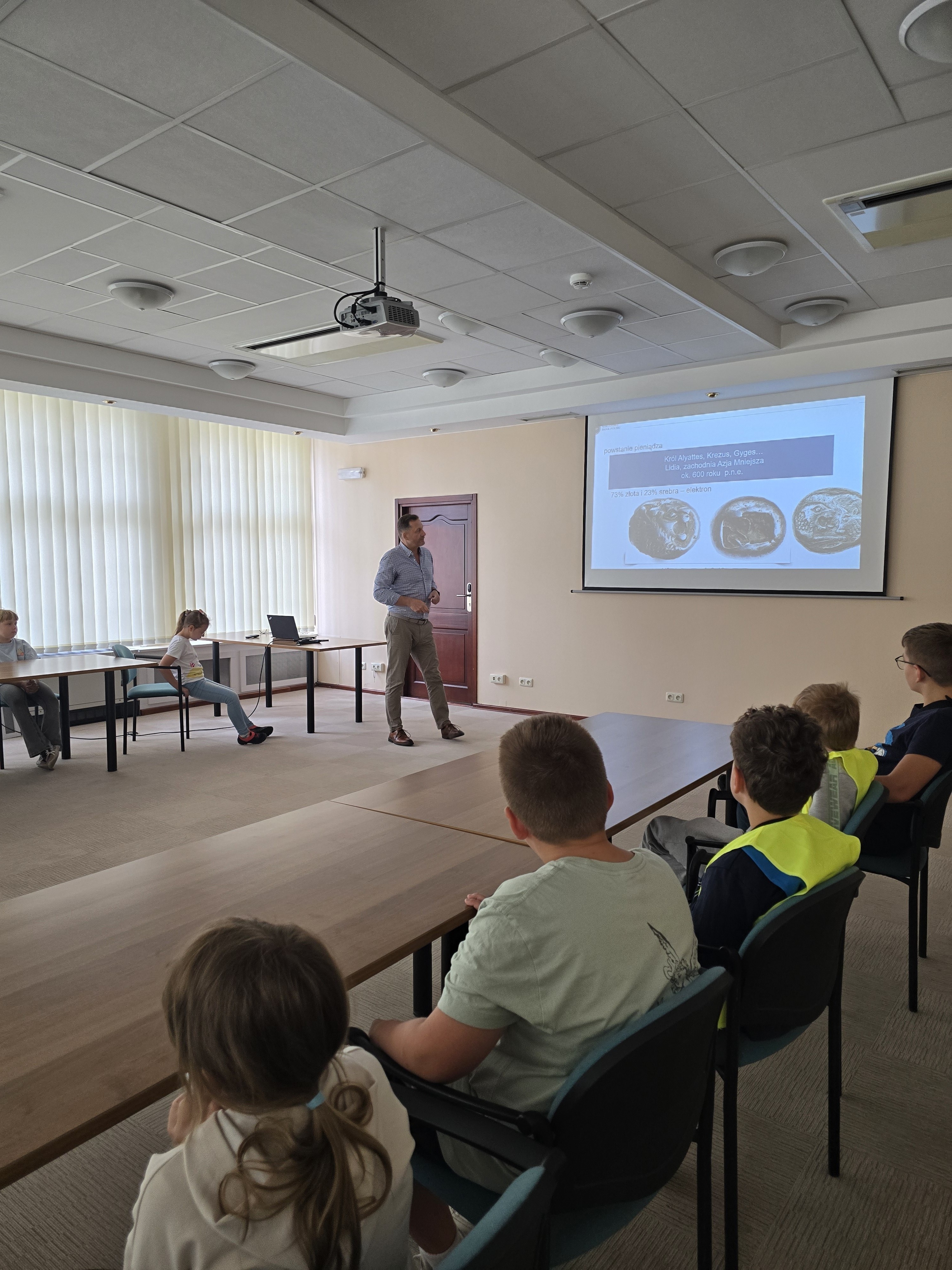 Następnie została przedstawiona ewolucja pieniądza, który pojawił się około 600 roku p.n.e. Prowadzący płynnie przeszedł do pierwszego polskiego pieniądza za czasów Bolesława Chrobrego (ok. 1000 r.), którym był denar Princes Polonie oraz podsumowania etapów ewolucji form pieniądza (pieniądz towarowy, kruszcowy, papierowy, bezgotówkowy i w formie cyfrowej). Wg jednej z uczestniczek spotkania zabrakło „blika i kryptowalut”, co wywołało uśmiech prowadzącego, który następnie wyjaśnił istotę tych zagadnień. Taka reakcja pokazała, jak świadome i zainteresowane są tematem dzieci, jeśli tylko się na tę ciekawość pozwoli.