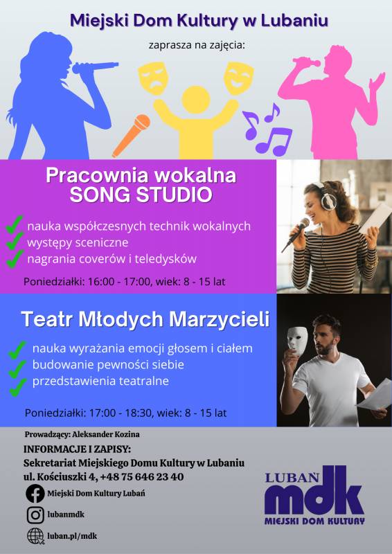 Miejski Dom Kultury w Lubaniu zaprasza wszystkie dzieci w wieku 8–15 lat do udziału w zajęciach rozwijających talenty sceniczne i muzyczne.