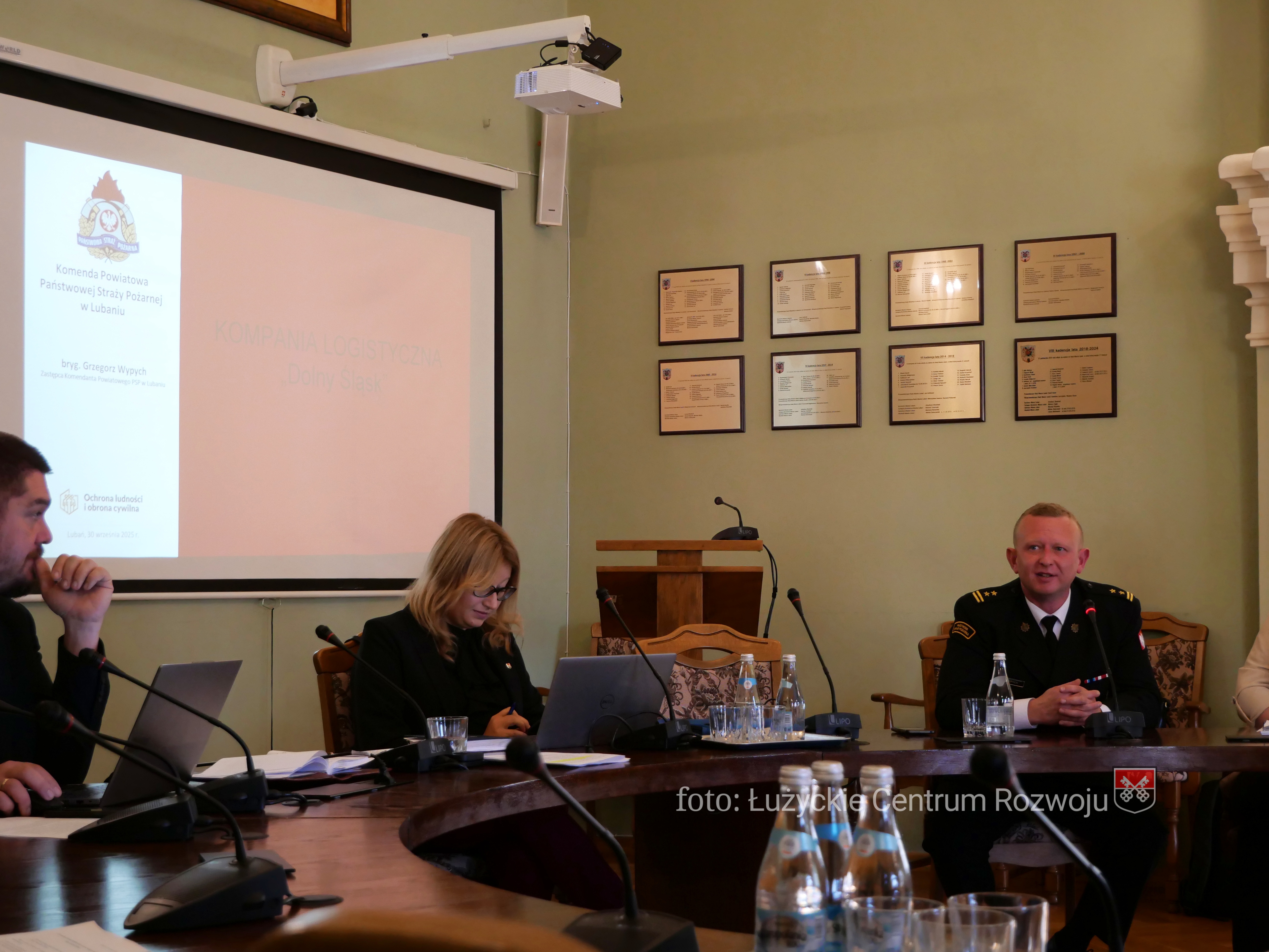Kolejnym punktem była prezentacja na temat zadań i zasług Kompani Logistycznej „Dolny Śląsk”, zbudowanej m.in. na bazie Komendy Powiatowej Państwowej Straży Pożarnej w Lubaniu. Zastępca Komendanta Powiatowego PSP w Lubaniu bryg. Grzegorz Wypych zaprezentował zasługi Kompani Logistycznej oraz przedstawił zagraniczne wyjazdy do Grecji i Francji, a także opowiedział o aktualnych ćwiczeniach przeciwpowodziowych we współpracy ze spółkami miejskimi i pracownikami Urzędu Miasta