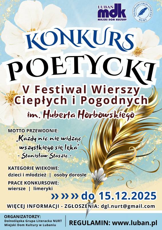 Miejski Dom Kultury w Lubaniu i Dolnośląska Grupa Literacka NURT zapraszają dzieci, młodzież oraz osoby dorosłe do udziału w ogólnopolskim konkursie poetyckim organizowanym w ramach V edycji Festiwalu Wierszy Ciepłych i Pogodnych im. Huberta Horbowskiego.