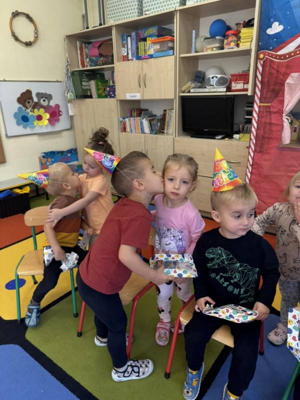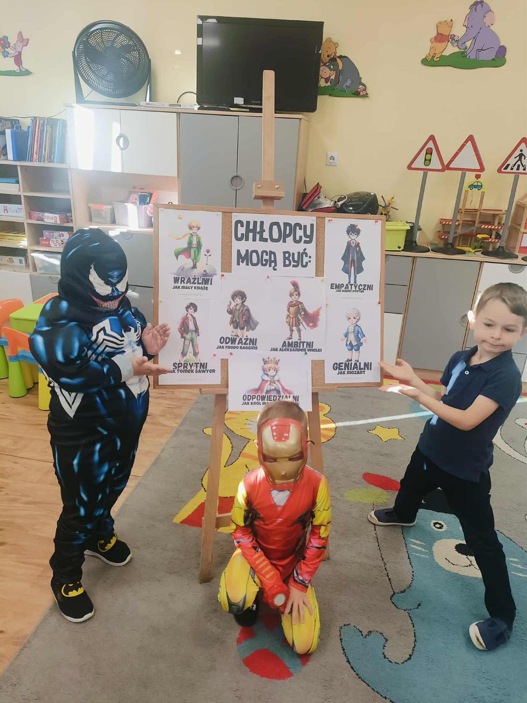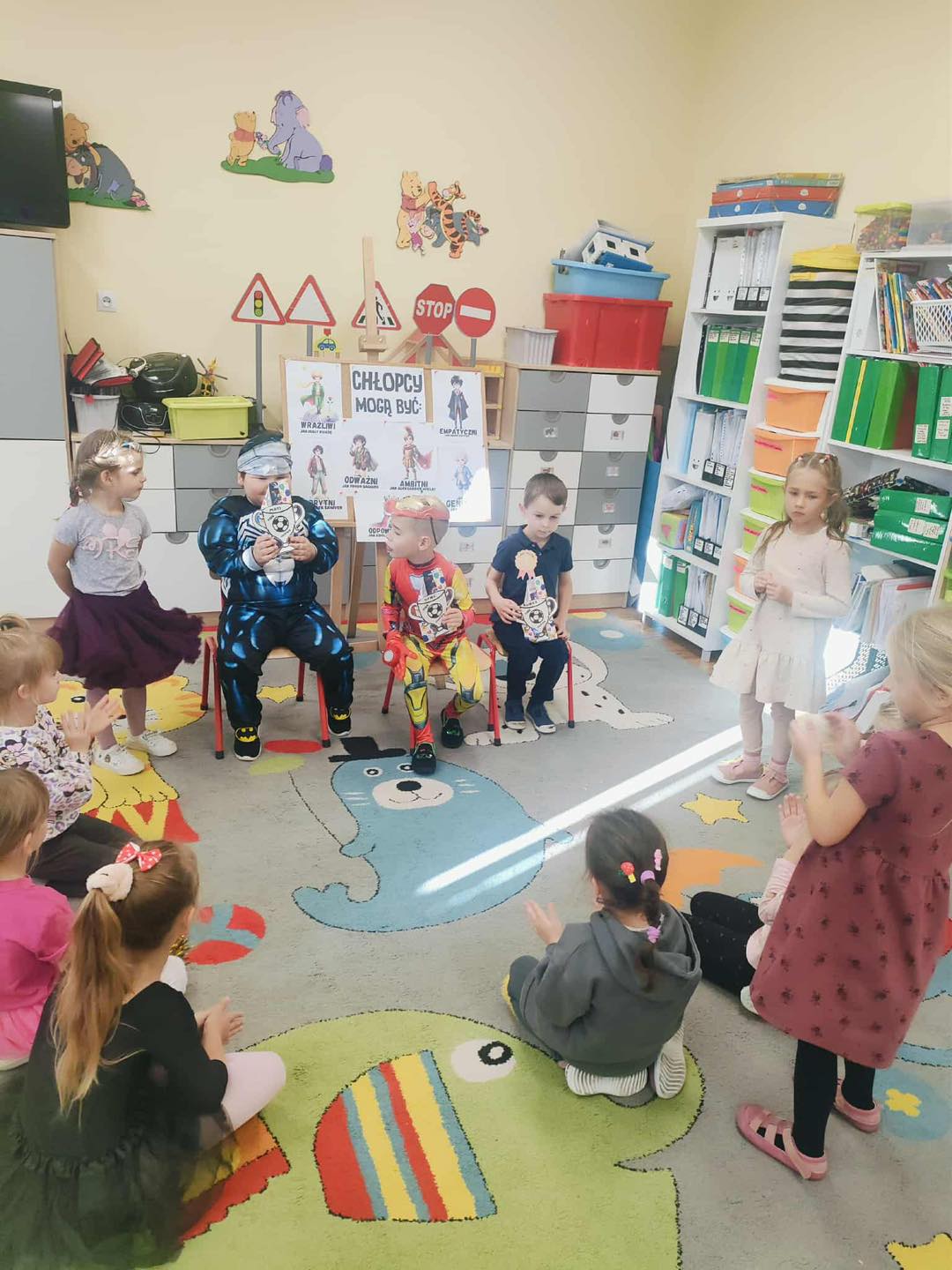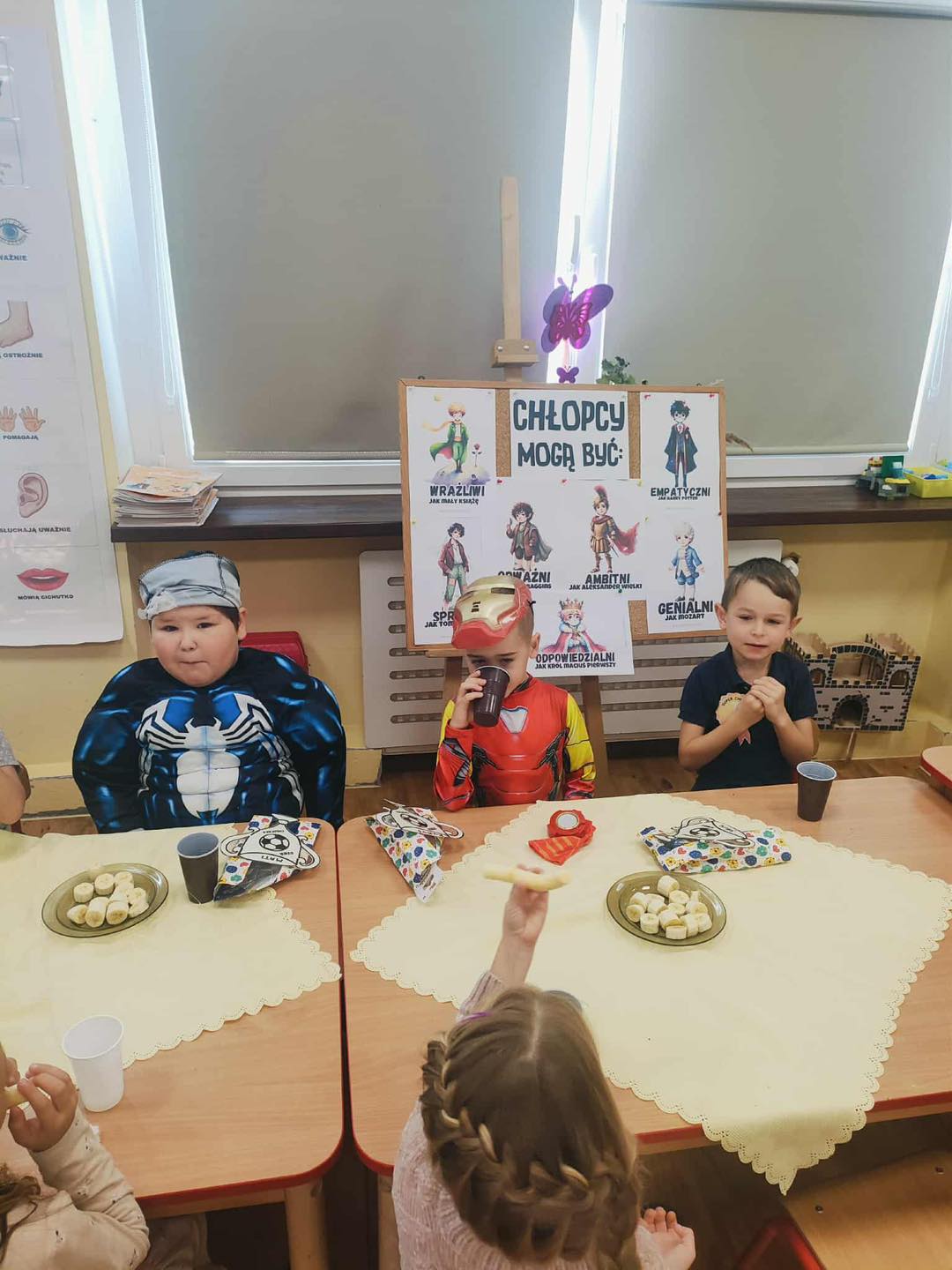 Dzień chłopaka w naszym przedszkolu na sportowo, śpiewająco, tanecznie i bohatersko. W tym dniu we wszystkich grupach dziewczynki wręczały chłopcom upominki, własnoręcznie namalowane laurki, złożyły życzenia, uściskały i ucałowały. Nie brakło także w tym dniu słodkiego poczęstunku dla wszystkich dzieci.