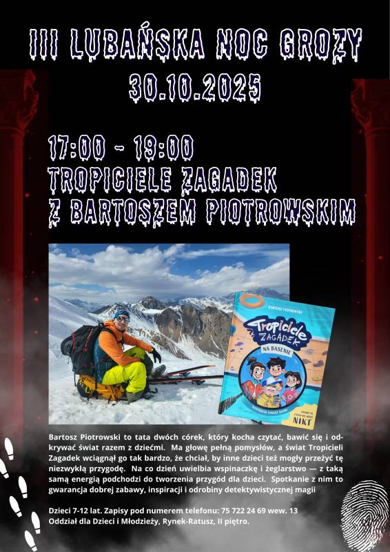 Zapraszamy na tajemnicze spotkanie z Bartoszem Piotrowskim, autorem książki dla małych Sherlocków Pan Bartosz to tata dwóch córek, który kocha czytać, bawić się i odkrywać świat razem z dziećmi. Ma głowę pełną pomysłów, a świat Tropicieli Zagadek wciągnął go tak bardzo, że chciał, by inne dzieci też mogły przeżyć tę niezwykłą przygodę. Na co dzień uwielbia wspinaczkę i żeglarstwo — z taką samą energią podchodzi do tworzenia przygód dla dzieci. Spotkanie z nim to gwarancja dobrej zabawy, inspiracji i odrobiny detektywistycznej magii!