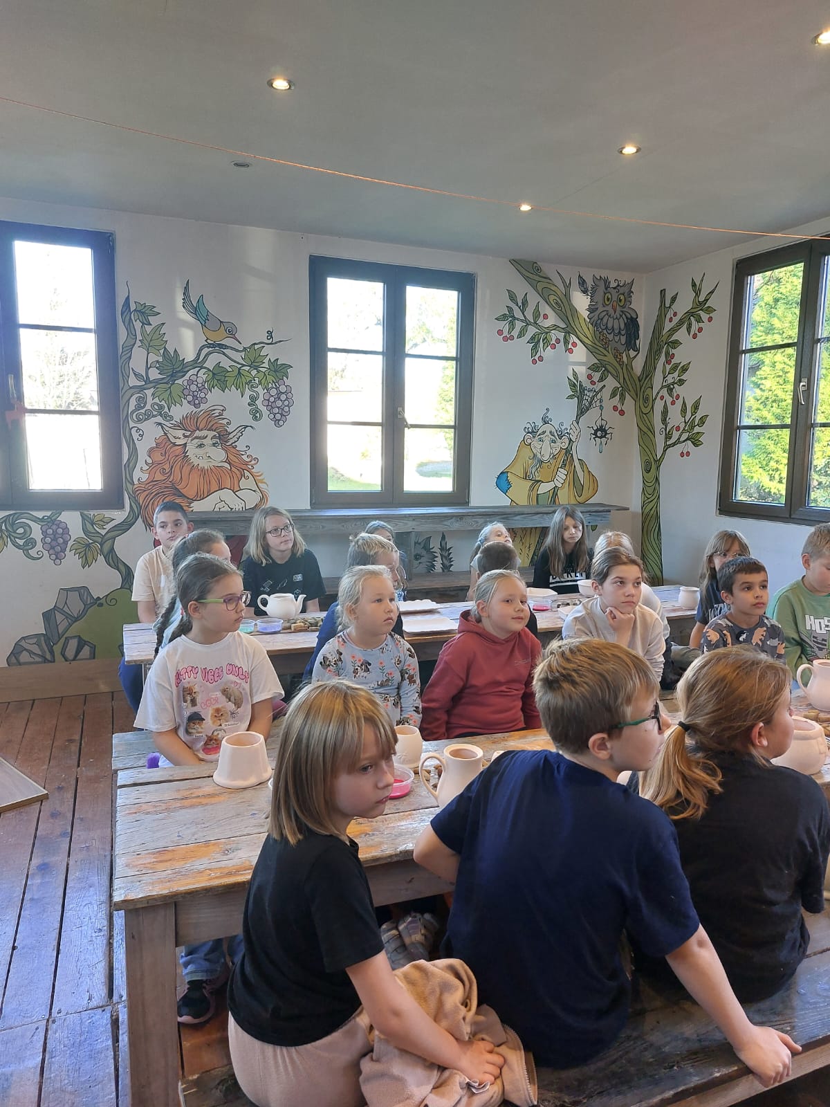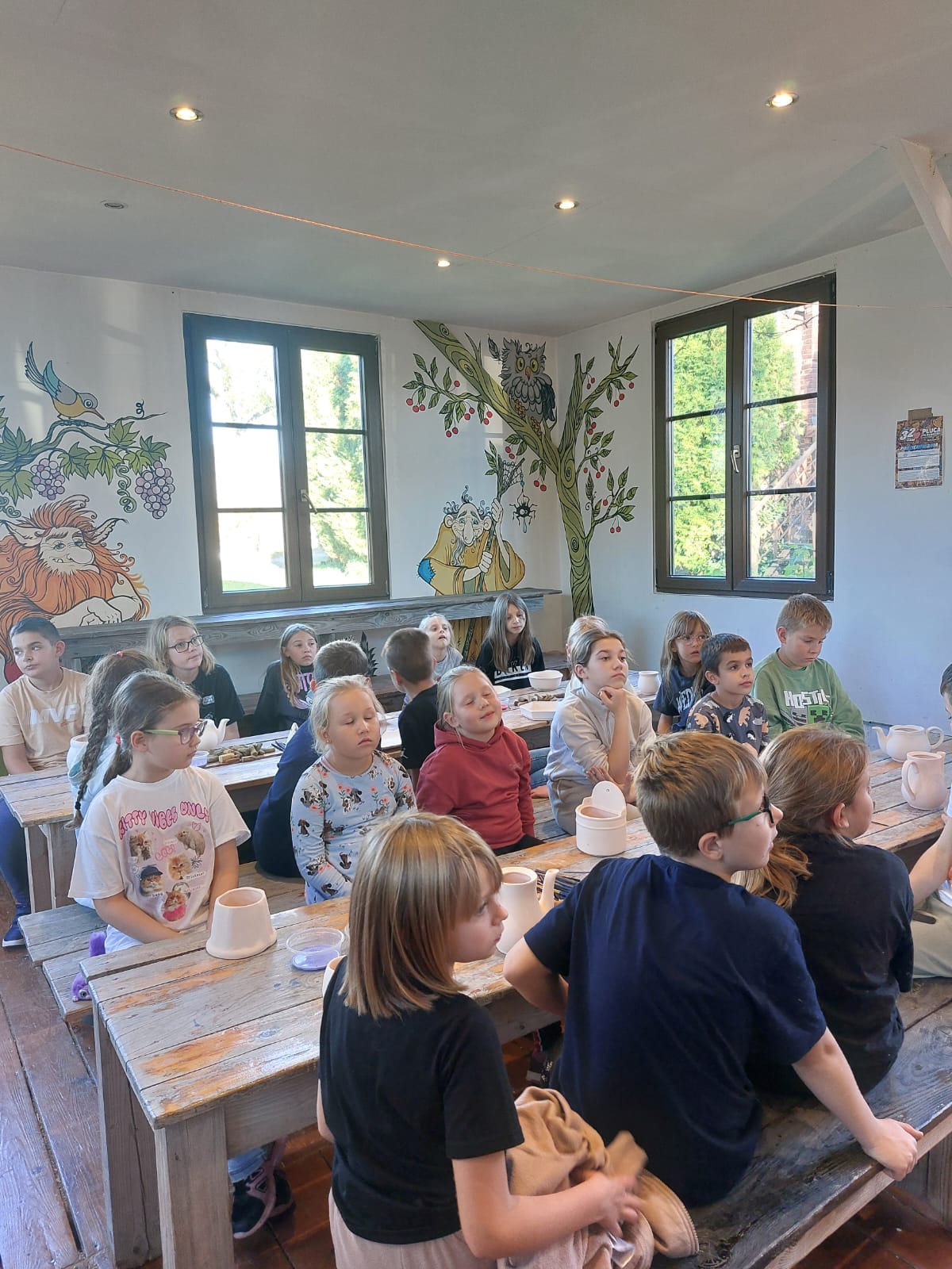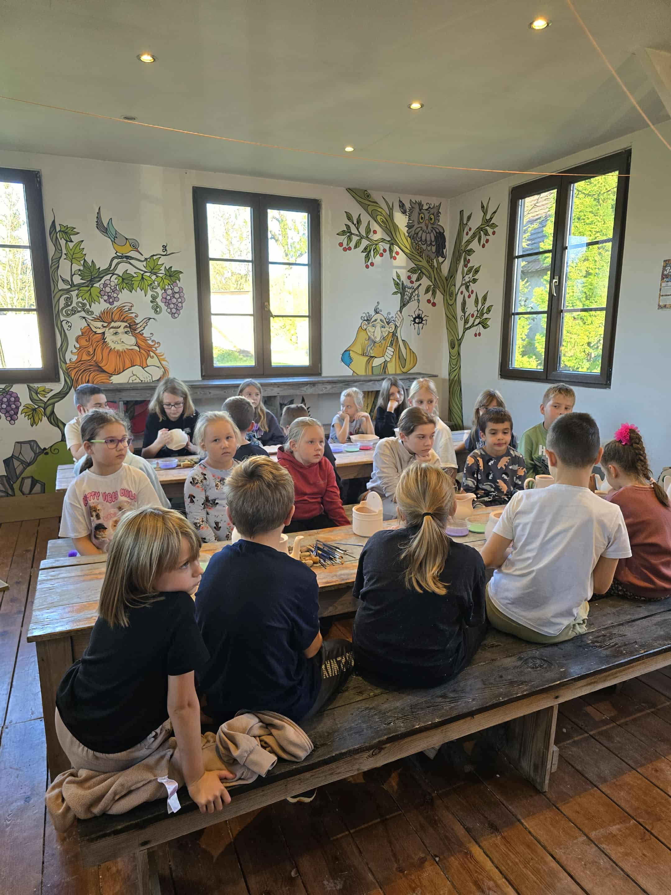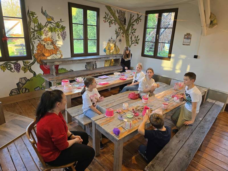 Szczególną atrakcją spotkania były warsztaty ceramiczne, podczas których dzieci mogły spróbować swoich sił w tradycyjnej technice stempelkowej. Polega ona na ręcznym nanoszeniu na naczynia różnorodnych wzorów przy użyciu specjalnie przygotowanych stempelków i barwnych farb. Choć zadanie nie należało do łatwych, uczestnicy wykazali się dużą kreatywnością i zaangażowaniem, tworząc własne, unikalne dekoracje.