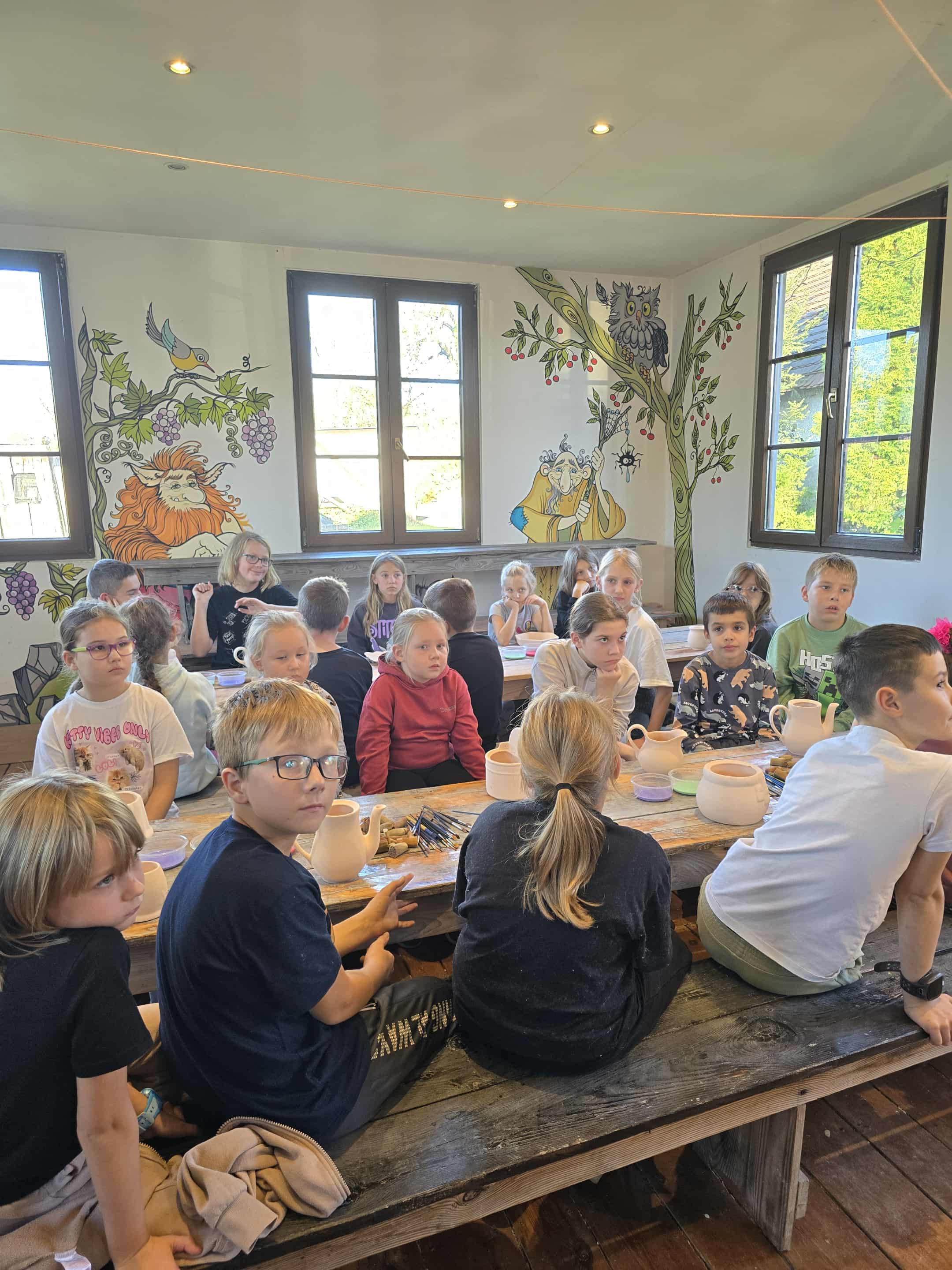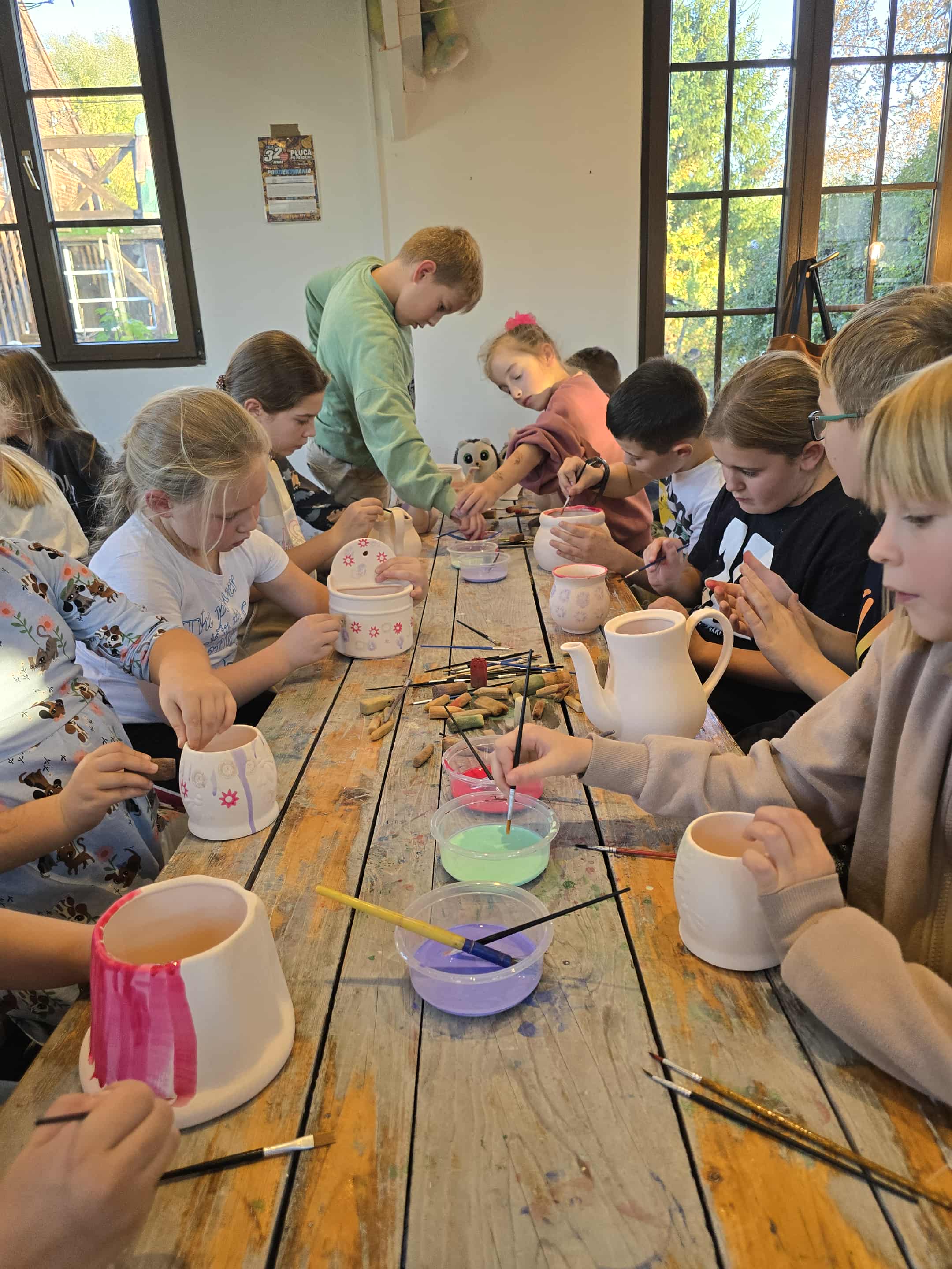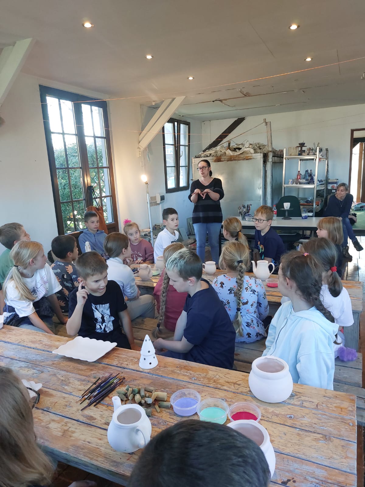 Na początku zajęć dzieci poznały fascynującą, ponad 600-letnią historię bolesławieckiej ceramiki, z której słynie nasz region. Dowiedziały się, czym jest glinka kaolinowa, powstała w okresie paleolitu, oraz jak przebiega cały proces tworzenia naczyń – od wydobycia surowca, poprzez formowanie, suszenie i wypalanie, aż po końcowe zdobienie. Uczestnicy z zainteresowaniem obserwowali, jak wiele precyzji, cierpliwości i kunsztu wymaga przygotowanie każdego elementu.