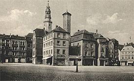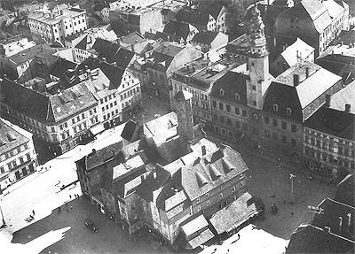Przed wojną zabudowa śródrynkowa składała się z samodzielnych kamienic czynszowych okalających Wieżę Kramarską - pozostałość po pierwszym ratuszu.