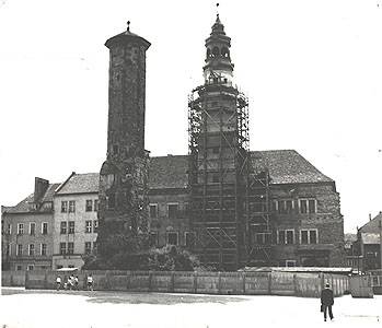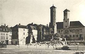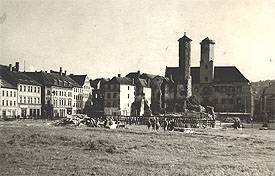 W czasie działań wojennych zabudowa znacznie ucierpiała, choć zachowały się mury budynków. (zdjęcie z 1946 r.)