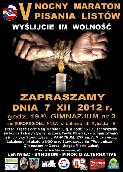 Serdecznie zapraszamy na V Nocny Maraton Pisania Listów, który rozpocznie się dnia 7 grudnia 2012 r. o godz. 19 w budynku Gimnazjum nr 3 w Lubaniu.
